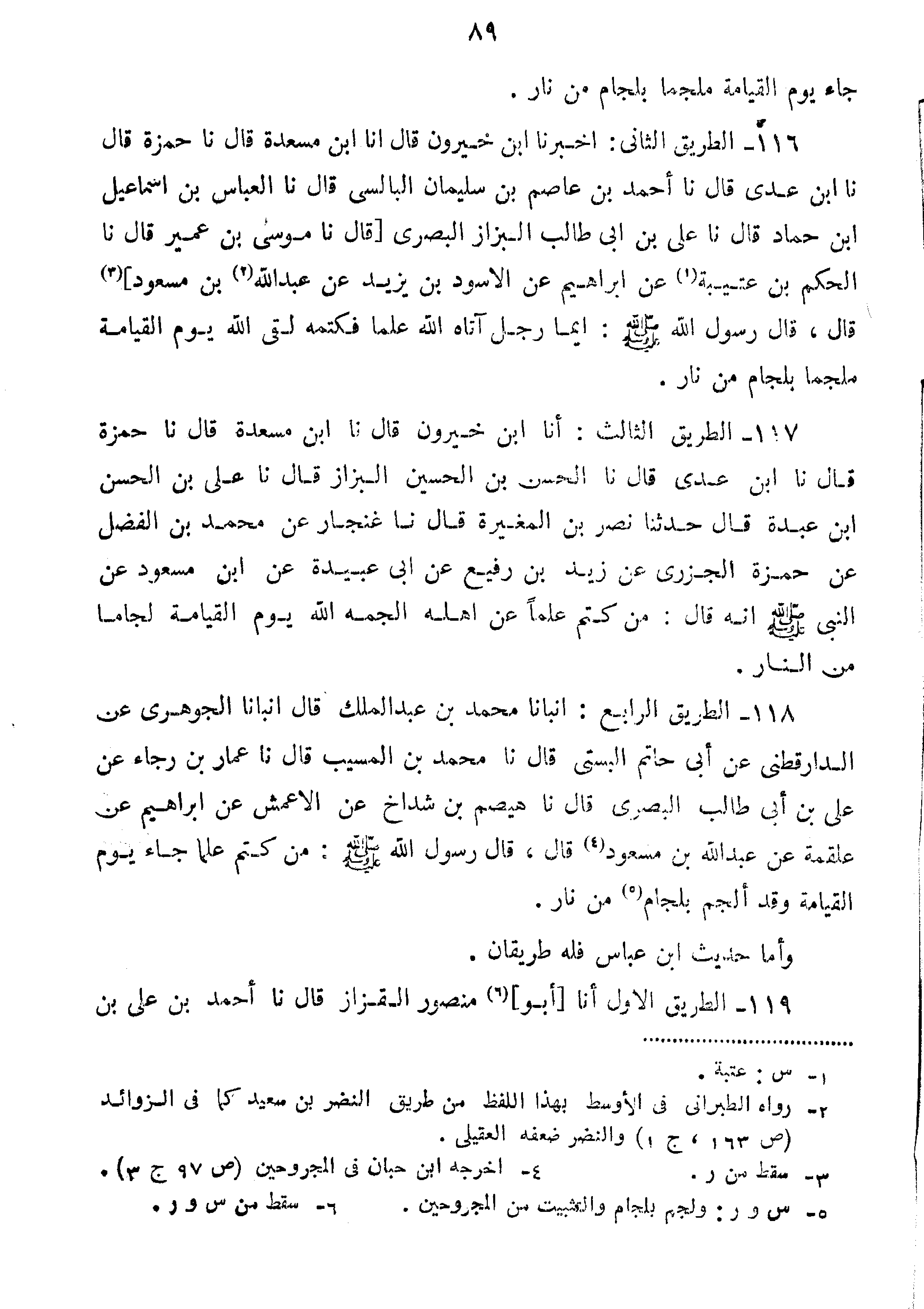 116-الطَّرِيقُ الثَّانِي: أَخْبَرَنَا ابْنُ خَيْرُونَ قَالَ أَنَا ابْنُ مَسْعَدَةَ قَالَ نا حَمْزَةُ قَالَ نا ابْنُ عَدِيٍّ قَالَ نا أَحْمَدُ بْنُ عَاصِمِ بْنِ سُلَيْمَانَ الْبَالِسِيُّ قَالَ نا الْعَبَّاسُ بْنُ إِسْمَاعِيلَ بْنِ حَمَّادٍ قَالَ نا عَلِيُّ بْنُ أَبِي طَالِبٍ الْبَزَّازُ الْبَصْرِيُّ قَالَ نا مُوسَى بْنُ عُمَيْرٍ قَالَ نا الْحَكَمُ بْنُ عتيبة عن إبراهيم بن الأَسْوَدِ بْنِ يَزِيدَ عَنْ عَبْدِ اللَّهِ بْنِ مَسْعُودٍ قَالَ: قَالَ رَسُولِ اللَّهِ صَلَّى اللَّهُ عَلَيْهِ وَسَلَّمَ:"أَيَّمَا رَجُلٌ آتَاهُ اللَّهُ عِلْمًا فَكَتَمَهُ لَقِيَ اللَّهَ يَوْمَ الْقِيَامَةَ مُلَجَّمًا بِلِجَامٍ مِنْ نَارٍ ".