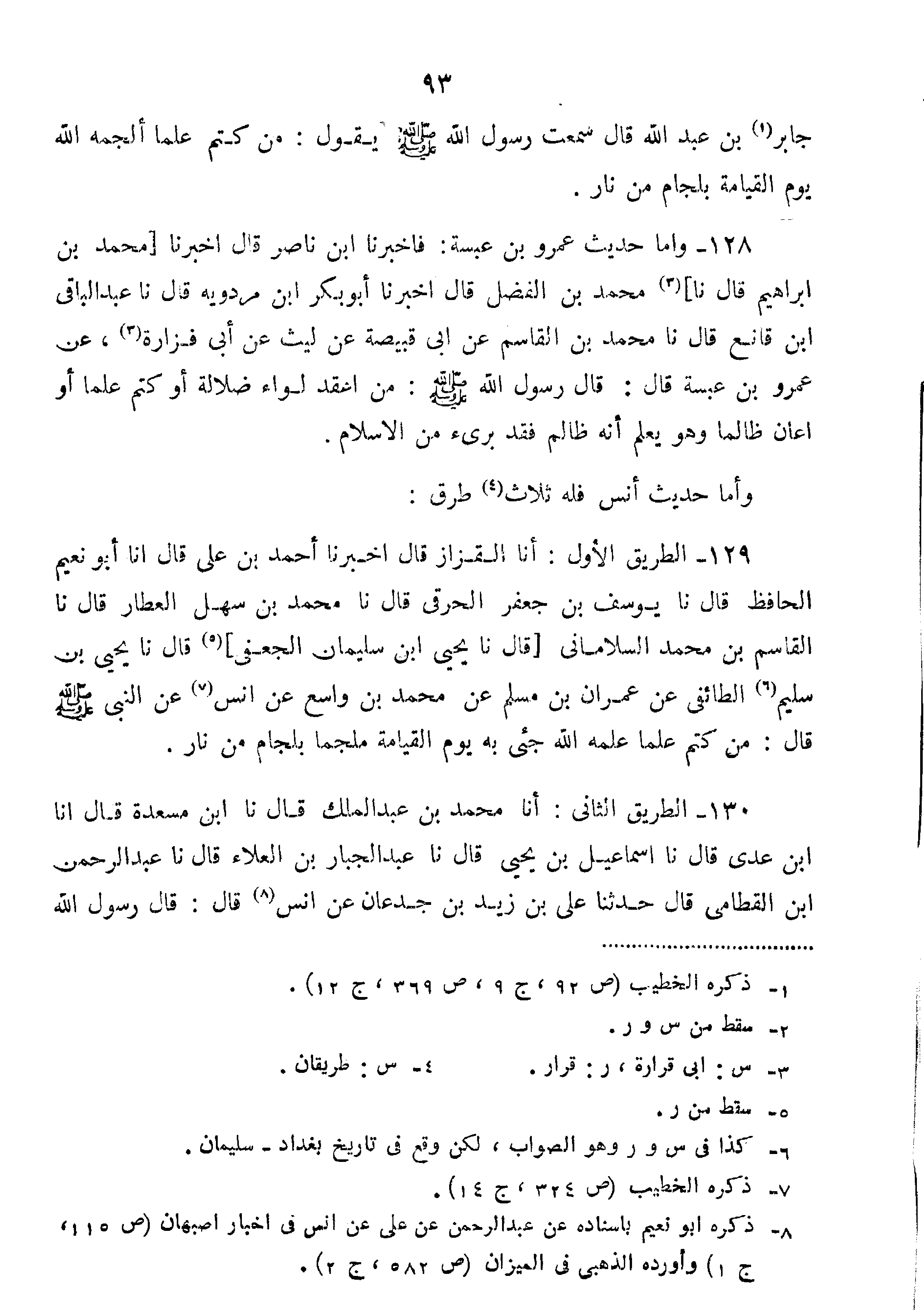 129-الطَّرِيقُ الأَوَّلُ: أَنَا الْقَزَّازُ قَالَ أَخْبَرَنَا أَحْمَدُ بْنُ عَلِيٍّ قَالَ أَنَا أَبُو نُعَيْمٍ الْحَافِظُ قَالَ نا يُوسُفُ بْنُ جَعْفَرٍ الْحُرَقِيُّ قَالَ نا مُحَمَّدُ بْنُ سَهْلٍ الْعَطَّارُ قَالَ نا القاسم ابن مُحَمَّدٍ السَّلامَانِيُّ قَالَ نا يَحْيَى بْنُ سُلَيْمَانَ الْجُعْفِيُّ قَالَ نا يَحْيَى بْنُ سَلِيمٍ الطَّائِفِيُّ عَنْ عمران بن مُسْلِمٍ عَنْ مُحَمَّدِ بْنِ وَاسِعٍ عَنْ أَنَسٍ عَنِ النَّبِيِّ صَلَّى اللَّهُ عَلَيْهِ وَسَلَّمَ قَالَ: " مَنْ كَتَمَ عِلْمًا عَلَّمَهُ اللَّهُ جِيءَ بِهِ يَوْمَ الْقِيَامَةِ مُلَجَّمًا بِلِجَامٍ مِنْ نَارٍ".