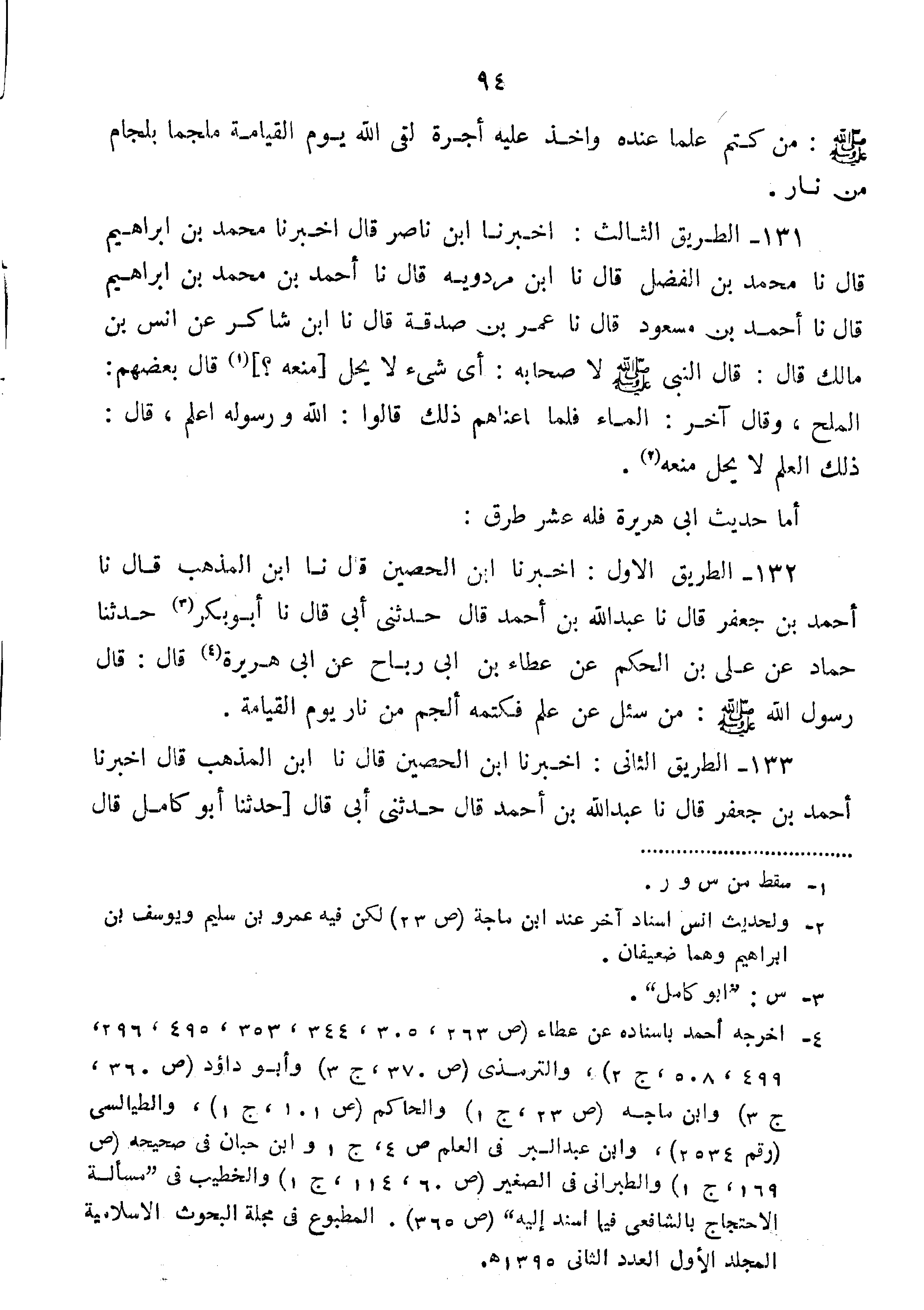 132- الطَّرِيقُ الأَوَّلُ:أَخْبَرَنَا ابْنُ الْحُصَيْنِ قَالَ نا ابْنُ الْمُذْهِبِ قَالَ نا أَحْمَدُ بْنُ جَعْفَرٍ قَالَ نا عَبْدُ اللَّهِ بْنُ أَحْمَدَ قَالَ حَدَّثَنِي أَبِي قَالَ نا أَبُو بَكْرٍ حَدَّثَنَا حَمَّادٌ عَنْ عَلِيِّ بْنِ الْحَكَمِ عَنْ عَطَاءِ بْنِ أَبِي رَبَاحٍ عَنْ أَبِي هُرَيْرَةَ قَالَ: قَالَ رَسُولُ اللَّهِ صَلَّى اللَّهُ عَلَيْهِ وَسَلَّمَ:"مَنْ سُئِلَ عَنْ عِلْمٍ فَكَتَمَهُ أُلْجِمَ مِنْ نَارٍ يَوْمَ الْقِيَامَةِ".
