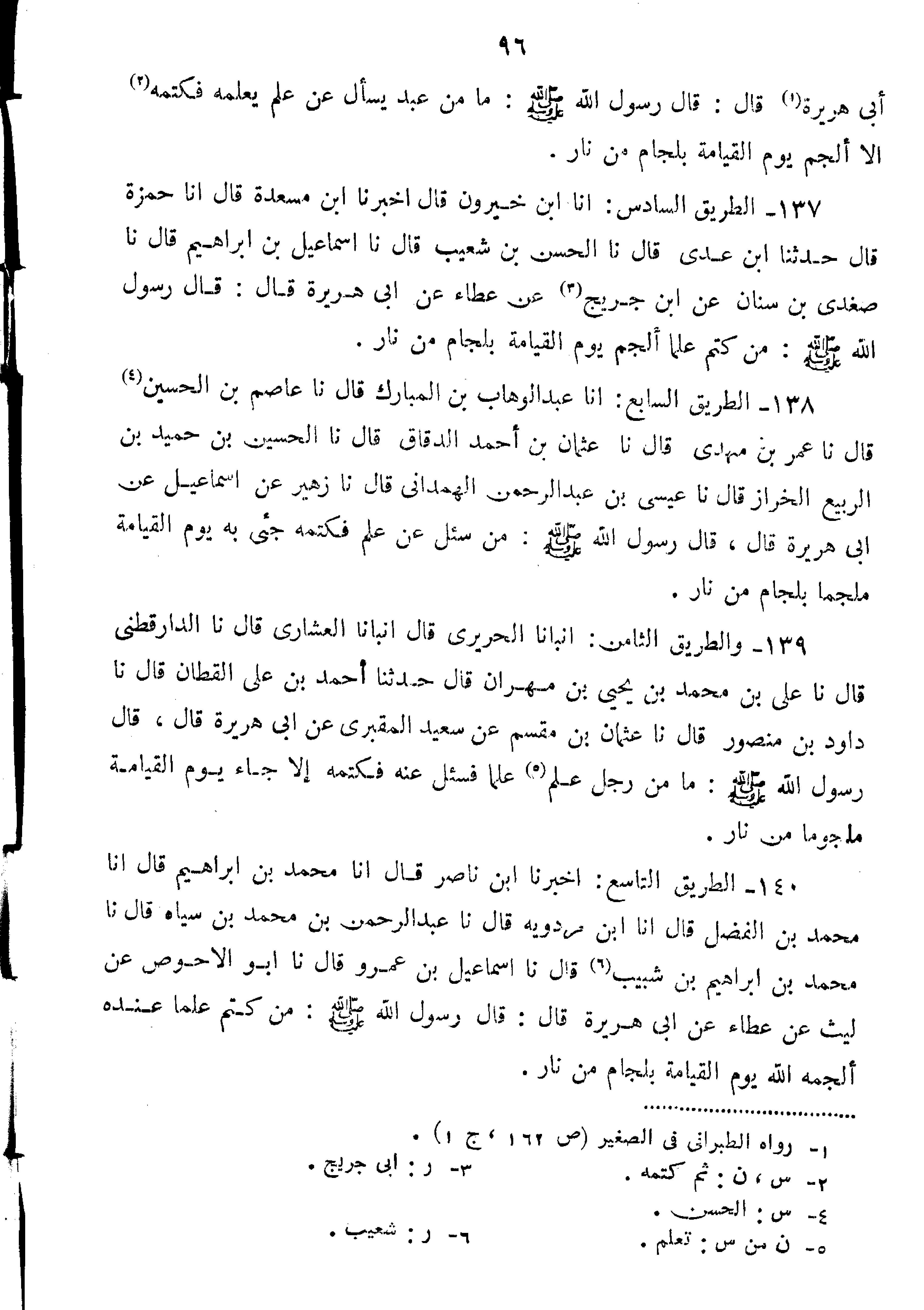 138- الطَّرِيقُ السَّابِعُ: أَنَا عَبْدُ الْوَهَّابِ بْنُ الْمُبَارَكِ قَالَ نا عَاصِمُ بْنُ الْحُسَيْنِ قَالَ نا عُمَرُ بْنُ مَهْدِيٍّ قَالَ نا عُثْمَانُ بْنُ أَحْمَدَ الدَّقَّاقُ قَالَ نا الْحُسَيْنُ بْنُ حُمَيْدِ بْنِ الرَّبِيعِ الْخَرَّازُ قَالَ نا عيسى بن عبد الرحمن الهمداني قَالَ نا زُهَيْرٌ عَنْ إِسْمَاعِيلَ عَنْ أَبِي هُرَيْرَةَ قَالَ: قَالَ رَسُولِ اللَّهِ صَلَّى اللَّهُ عَلَيْهِ وَسَلَّمَ:"مَنْ سُئِلَ عَنْ عِلْمٍ فَكَتَمَهُ جِيءَ بِهِ يَوْمَ الْقِيَامَةِ مُلَجَّمًا بِلِجَامٍ مِنْ نَارٍ".