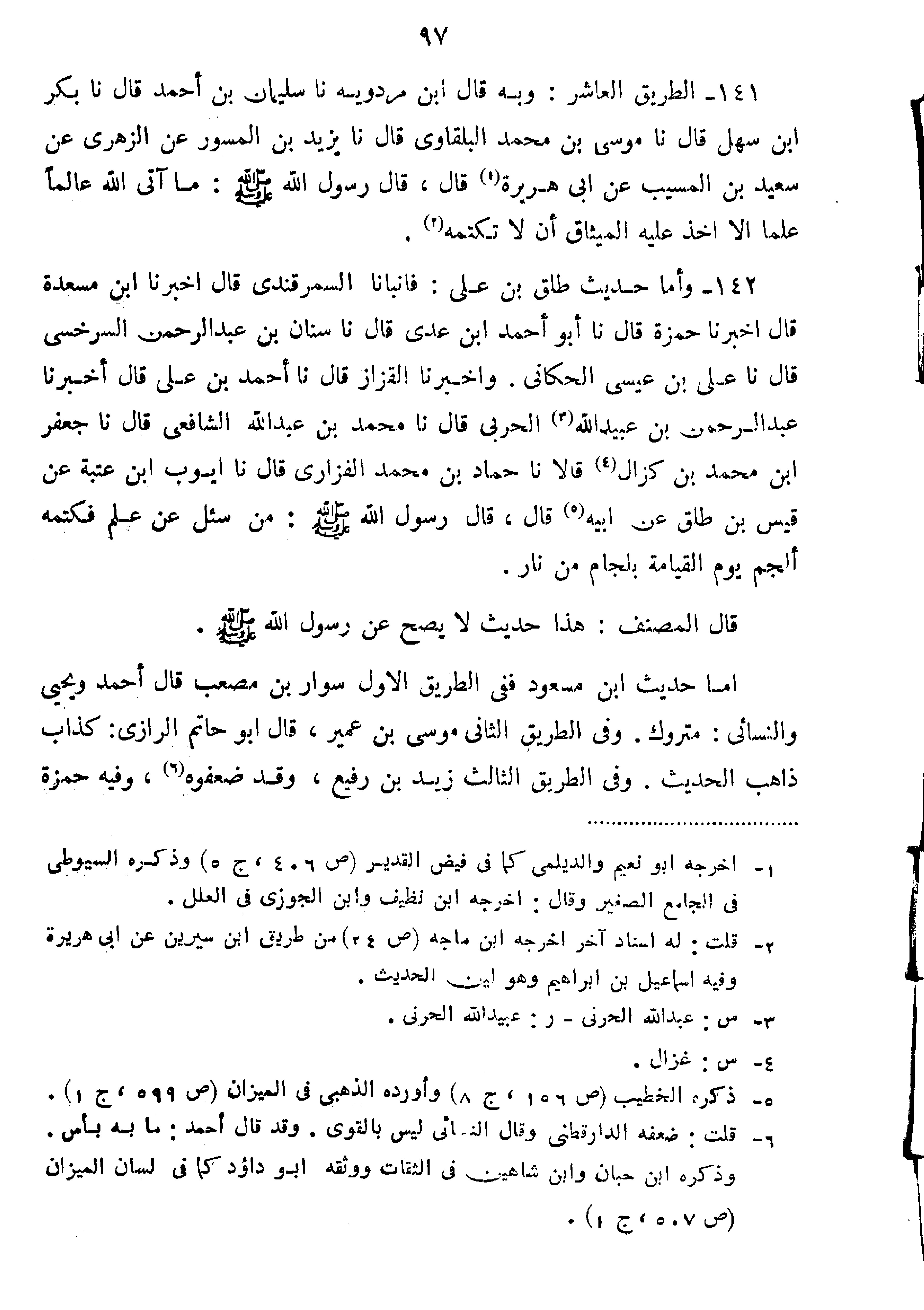 142-وَأَمَّا حَدِيثُ طَلْقِ بْنِ عَلِيٍّ فأنبأنا السَمَرْقَنْدِيِّ قَالَ أَخْبَرَنَا ابْنُ مَسْعَدَةَ قَالَ أَخْبَرَنَا حَمْزَةُ قَالَ نا أَبُو أَحْمَدَ بْنُ عَدِيٍّ قَالَ نا سِنَانُ بْنُ عَبْدِ الرَّحْمَنِ السَّرَخْسِيُّ قَالَ نا عَلِيُّ بْنُ عِيسَى الْحكَانِيُّ وَأَخْبَرَنَا الْقَزَّازُ قَالَ نا أَحْمَدُ بْنُ عَلِيٍّ قَالَ أَخْبَرَنَا عَبْدُ الرَّحْمَنِ بْنُ عُبَيْدِ اللَّهِ الْحَرْبِيُّ قَالَ نا مُحَمَّدُ بْنُ عَبْدُ اللَّهِ الشَّافِعِيُّ قَالَ نا جَعْفَرُ بْنُ مُحَمَّدِ بْنِ كِزَالٍ قَالا نا حَمَّادُ بْنُ محمد القزاري قَالَ نا أَيُّوبُ بْنُ عُتْبَةَ عَنْ قَيْسِ بْنِ طَلْقٍ عَنْ أَبِيهِ قَالَ: قَالَ رَسُولُ اللَّهِ صَلَّى اللَّهُ عَلَيْهِ وَسَلَّمَ:"مَنْ سُئِلَ عَنْ عِلْمٍ فَكَتَمَهُ أُلْجِمَ يَوْمَ الْقِيَامَةِ بِلِجَامٍ مِنْ نَارٍ".
