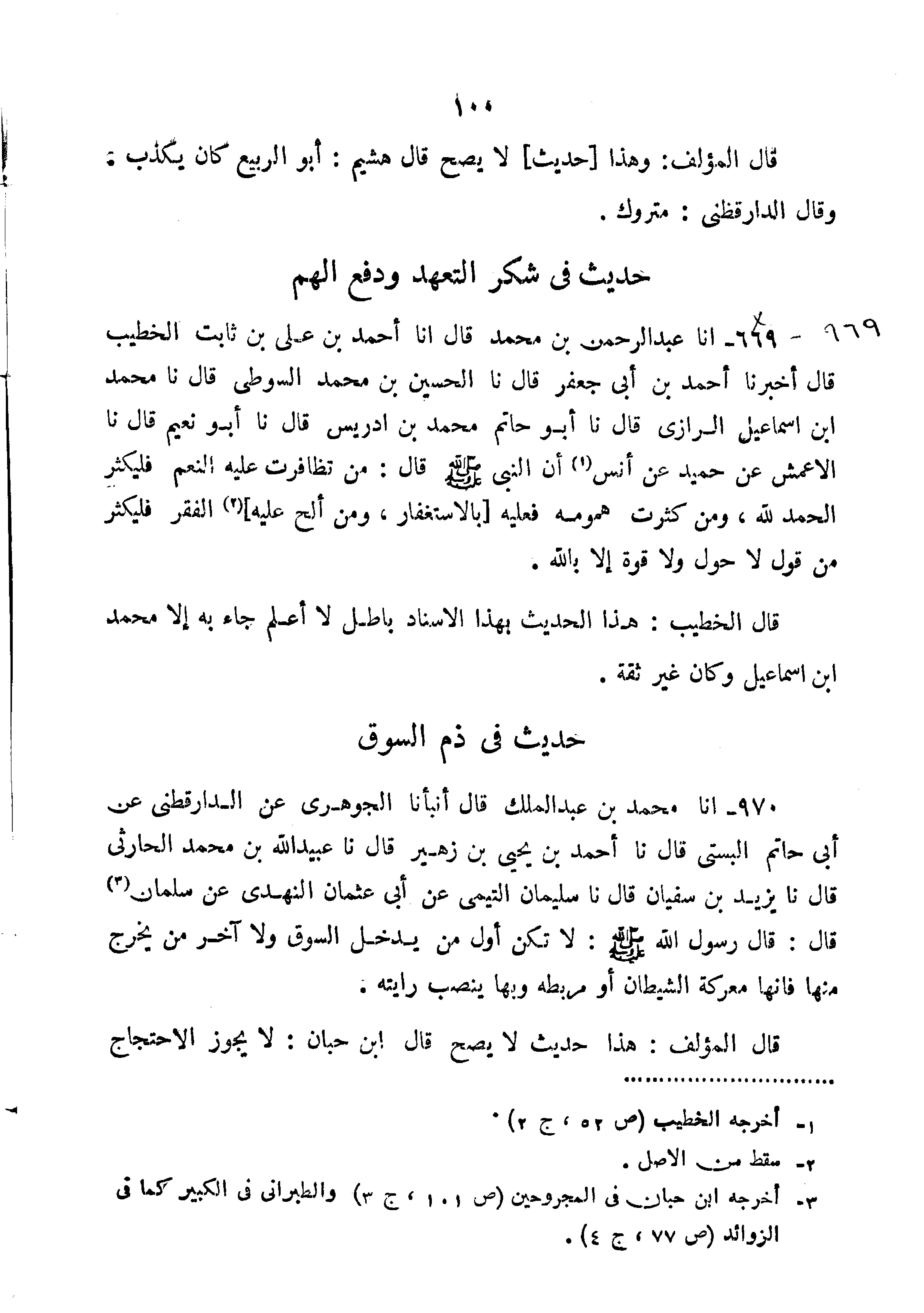 970-أَنَا مُحَمَّدُ بْنُ عَبْدِ الْمَلِكِ قال أنبانا الجوهري عن الدارقطني عَنْ أَبِي حَاتِمٍ الْبَسْتِيِّ قَالَ نا أَحْمَدُ بْنُ يَحْيَى بْنِ زُهَيْرٍ قَالَ نا عُبَيْدُ اللَّهِ بن قَالَ نا يَزِيدُ بْنُ سُفْيَانَ قال نا سليمان التميمي عَنْ أَبِي عُثْمَانَ النَّهْدِيِّ عَنْ سَلْمَانَ قَالَ: قَالَ رَسُولُ اللَّهِ صَلَّى اللَّهُ عَلَيْهِ وَسَلَّمَ: "لا تَكُنْ أَوَّلَ مَنْ يَدْخُلُ السُّوقَ وَلا آخِرَ مَنْ يَخْرُجُ مِنْهَا فَإِنَّهَا مَعْرَكَةُ الشَّيْطَانِ أَوْ مَرْبَطُهُ وَبِهَا يَنْصِبُ رَايَتَهُ".