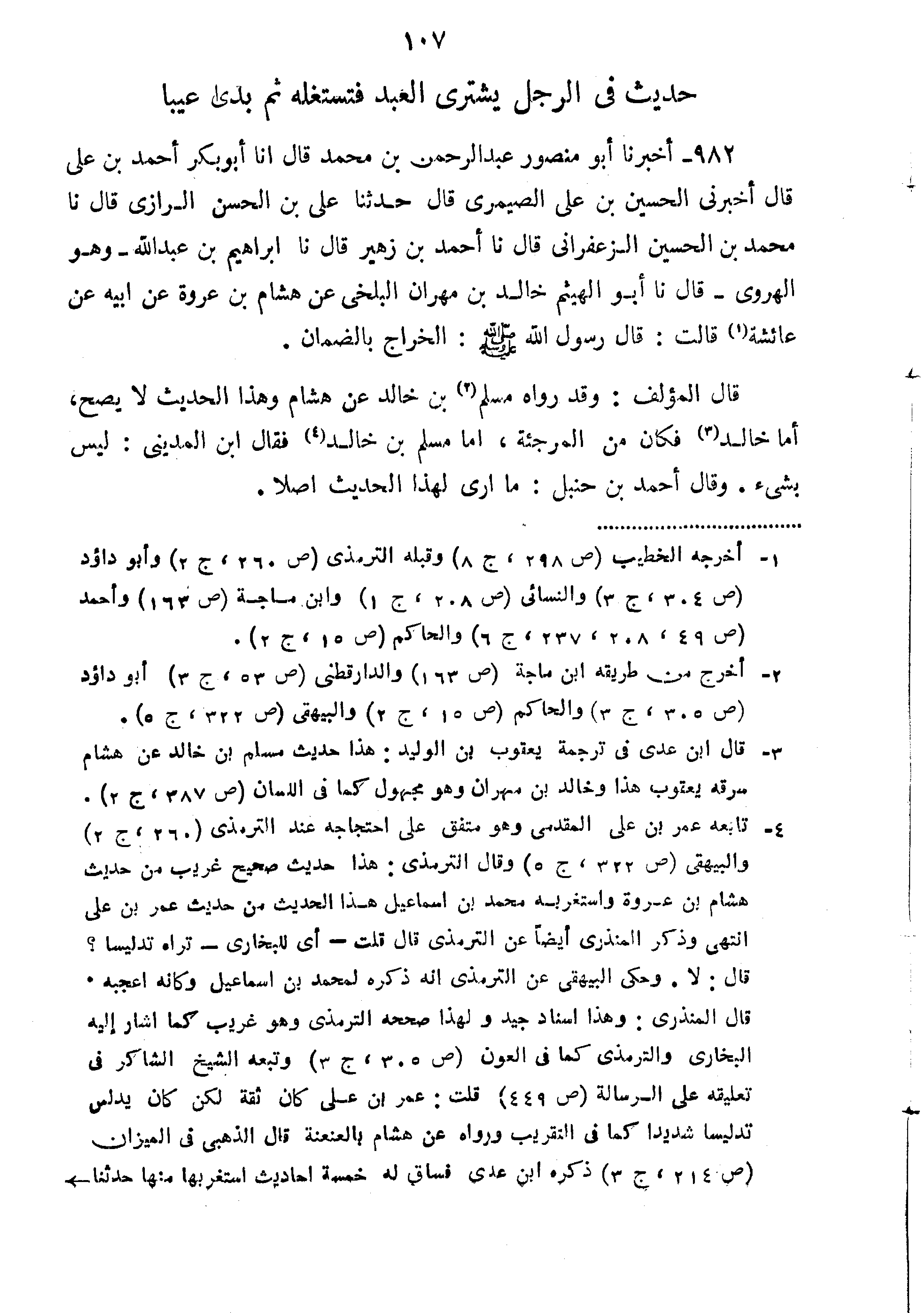 982-أَخْبَرَنَا أَبُو مَنْصُورٍ عَبْدُ الرَّحْمَنِ بْنُ مُحَمَّدٍ قَالَ أَنَا أبوبكر أَحْمَدُ بْنُ عَلِيٍّ قَالَ أَخْبَرَنِي الْحُسَيْنُ بْنُ عَلِيٍّ الصَّيْمَرِيُّ قَالَ حَدَّثَنَا عَلِيُّ بْنُ الْحَسَنِ الرَّازِيُّ قَالَ نا مُحَمَّدُ بْنُ الْحُسَيْنِ الزَّعْفَرَانِيُّ قَالَ نا أَحْمَدُ بْنُ زُهَيْرٍ قَالَ نا إِبْرَاهِيمُ بْنُ عَبْدِ اللَّهِ وَهُوَ الْهَرَوِيُّ قَالَ نا أَبُو الْهَيْثَمِ خَالِدُ بْنُ مِهْرَانَ الْبَلْخِيُّ عَنْ هِشَامِ بْنِ عُرْوَةَ عَنْ أَبِيهِ عَنْ عَائِشَةَ قَالَتْ قَالَ رَسُولُ اللَّهِ صَلَّى اللَّهُ عَلَيْهِ وَسَلَّمَ: "الْخَرَاجُ بِالضَّمَانِ".