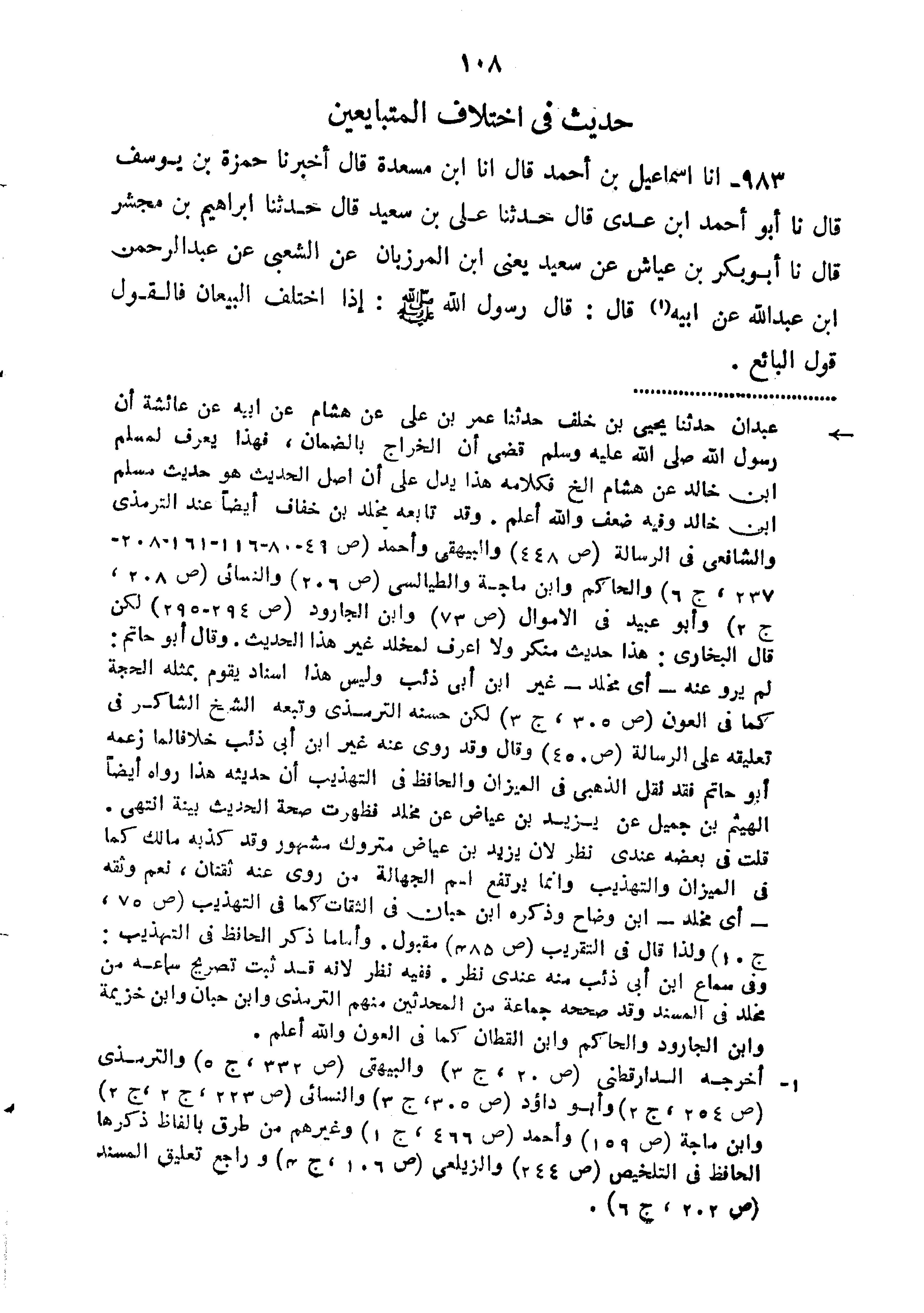 983-أَنَا إِسْمَاعِيلُ بْنُ أَحْمَدَ قَالَ أَنَا ابْنُ مَسْعَدَةَ قَالَ أَخْبَرَنَا حَمْزَةُ بْنُ يُوسُفَ قَالَ نا أَحْمَدَ بْنِ عَدِيٍّ قَالَ حَدَّثَنَا عَلِيُّ بْنُ سَعِيدٍ قَالَ حَدَّثَنَا إِبْرَاهِيمُ بْنُ مُجَشِّرٍ قَالَ نا أَبُو بَكْرِ بْنُ عَيَّاشٍ عَنْ سَعِيدٍ يَعْنِي ابْنَ الْمَرْزَبَانِ عَنِ الشعبي عن عبد الرحمن ابن عَبْدِ اللَّهِ عَنْ أَبِيهِ قَالَ: قَالَ رَسُولُ اللَّهِ صَلَّى اللَّهُ عَلَيْهِ وَسَلَّمَ: "إِذَا اخْتَلَفَ الْبَيِّعَانِ فَالْقَوْلُ قَوْلُ الْبَائِعِ".