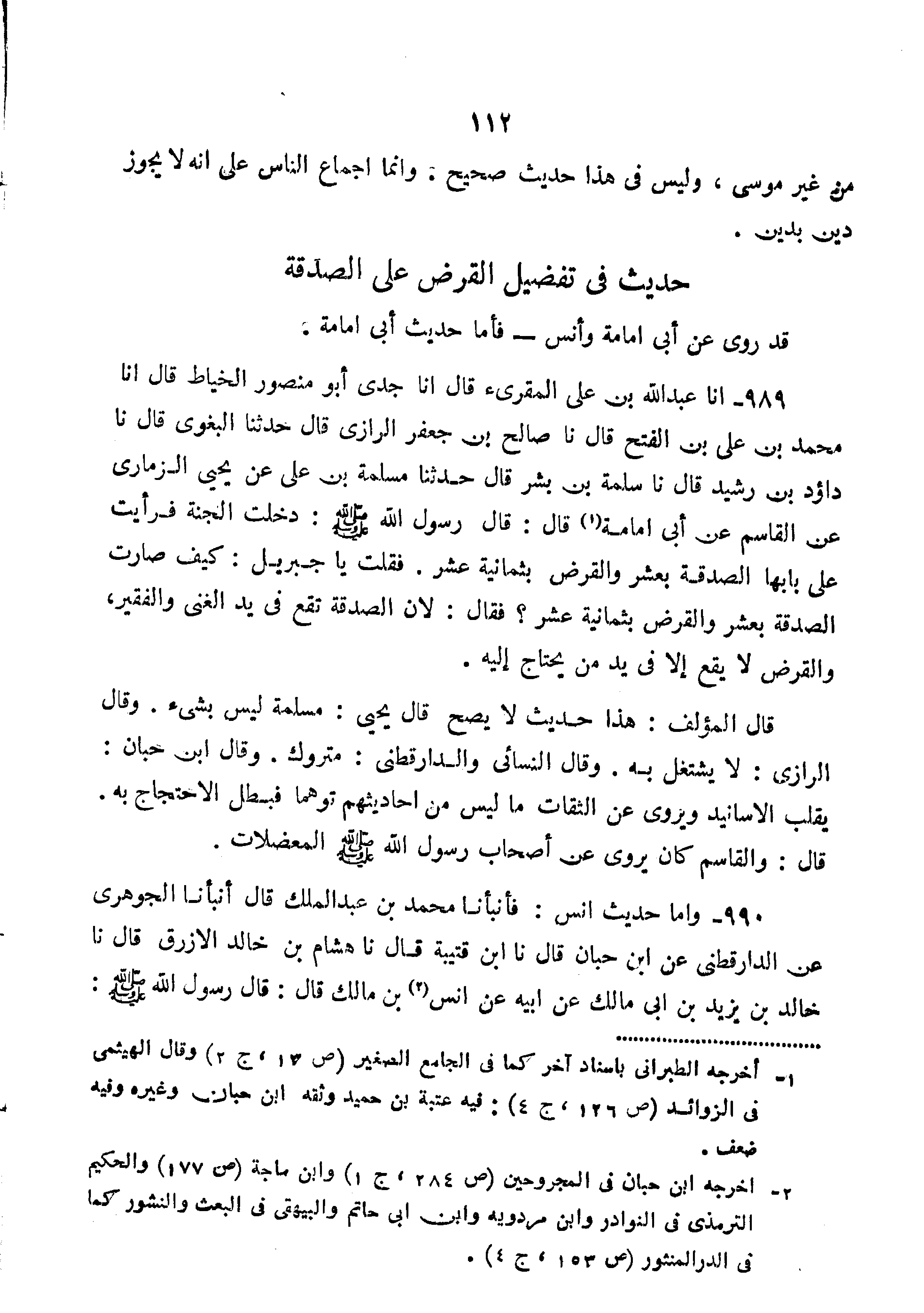 989-أَنَا عَبْدُ اللَّهِ بْنُ عَلِيِّ المقرىء قَالَ أَنَا جَدِّي أَبُو مَنْصُورٍ الْخَيَّاطُ قَالَ أَنَا مُحَمَّدُ بْنُ عَلِيِّ بْنِ الْفَتْحِ قَالَ نا صَالِحُ بْنُ جَعْفَرٍ الرَّازِيُّ قَالَ حَدَّثَنَا الْبَغَوِيُّ قَالَ نا دَاؤُدُ بْنُ رُشَيْدٍ قَالَ نا سَلَمَةُ بْنُ بِشْرٍ قَالَ حَدَّثَنَا مَسْلَمَةُ بْنُ عَلِيٍّ عَنْ يَحْيَى الزَّمَارِيِّ عَنِ الْقَاسِمِ عَنْ أَبِي أُمَامَةَ قَالَ: قَالَ رَسُولُ اللَّهِ صَلَّى اللَّهُ عَلَيْهِ وَسَلَّمَ: "دَخَلْتُ الْجَنَّةَ فَرَأَيْتُ عَلَى بَابِهَا الصَّدَقَةَ بِعَشْرٍ وَالْقَرْضَ بِثَمَانِيَةَ عَشَرَ فَقُلْتُ يَا جِبْرِيلُ كَيْفَ صَارَتِ الصَّدَقَةُ بِعَشْرٍ وَالْقَرْضُ بِثَمَانِيَةَ عَشَرَ فَقَالَ لأَنَّ الصَّدَقَةَ تَقَعُ فِي يَدِ الْغَنِيِّ وَالْفَقِيرِ وَالْقَرْضُ لا يَقَعُ إِلا فِي يَدِ مِنْ يَحْتَاجُ إِلَيْهِ".