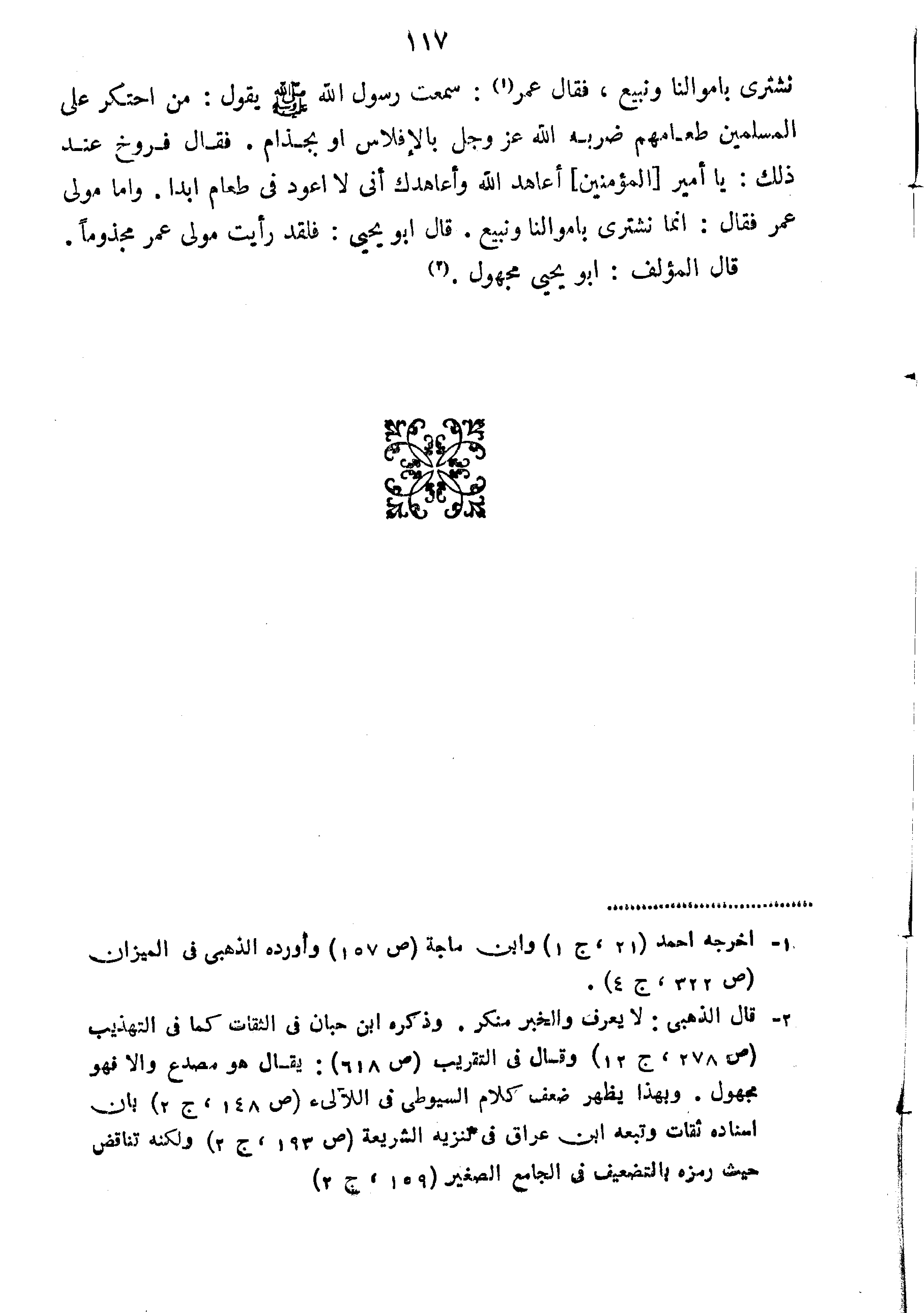 نشتري بأموالنا ونبيع فقال عمر سَمِعْتُ رَسُولَ اللَّهِ صَلَّى اللَّهُ عليه وسلم يقول مَنِ احْتَكَرَ عَلَى الْمُسْلِمِينَ طَعَامَهُمْ ضَرَبَهُ اللَّهُ عَزَّ وَجَلَّ بِالإِفْلاسِ أو بجذام فقال فروخ ثم ذَلِكَ يَا أَمِيرَ الْمُؤْمِنِينَ أُعَاهِدُ اللَّهَ وَأُعَاهِدُكَ أَنِّي لا أَعُودُ فِي طَعَامٍ أَبَدًا وَأَمَّا مَوْلَى عُمَرَ فَقَالَ إِنَّمَا نَشْتَرِي بِأَمْوَالِنَا وَنَبِيعُ قَالَ أَبُو يَحْيَى فَلَقَدْ رَأَيْتُ مَوْلَى عُمَرَ مَجْذُومًا".