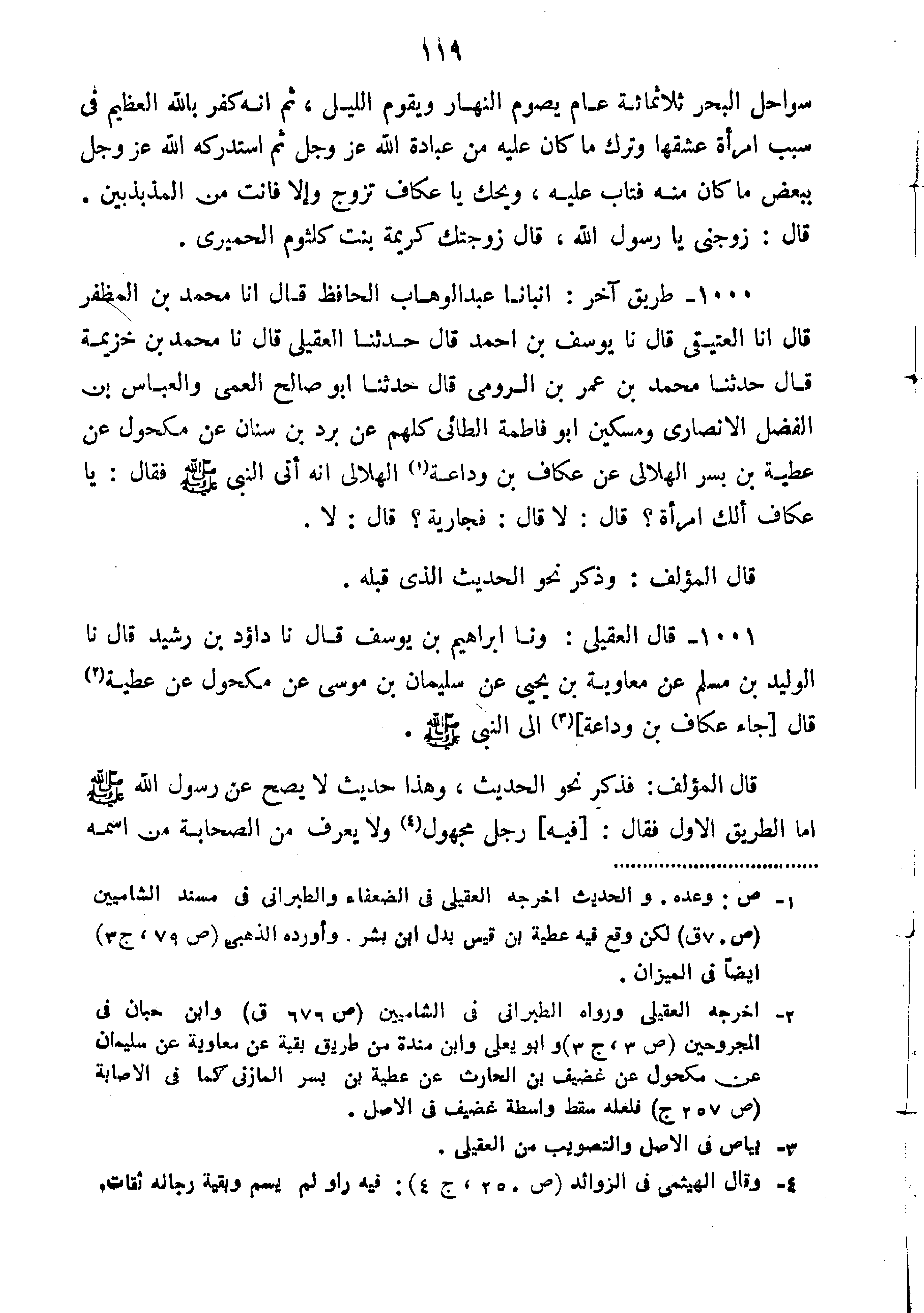 1000-طَرِيقٌ آخَرُ أَنْبَأَنَا عَبْدُ الْوَهَّابِ الْحَافِظُ قَالَ أَنَا مُحَمَّدُ بْنُ الْمُظَفَّرِ قَالَ أَنَا الْعُتَيْقِيُّ قَالَ نا يُوسُفُ بْنُ أَحْمَدَ قَالَ حَدَّثَنَا الْعَقِيلِيُّ قَالَ نا مُحَمَّدُ بْنُ خُزَيْمَةَ قَالَ حَدَّثَنَا مُحَمَّدُ بْنُ عُمَرَ بْنِ الرُّومِيِّ قَالَ حَدَّثَنَا أَبُو صَالِحٍ الْعَمِّيُّ وَالْعَبَّاسُ بْنُ الْفَضْلِ الْأَنْصَارِيُّ وَمِسْكِينٌ أَبُو فَاطِمَةَ الطَّائِيُّ كُلُّهُمْ عَنْ بُرْدِ بْنِ سِنَانٍ عَنْ مَكْحُولٍ عَنْ عَطِيَّةَ بْنِ بُسْرٍ الْهِلالِيِّ عَنْ عَكَّافِ بْنِ وَدَاعَةَ الْهِلالِيِّ أَنَّهُ أَتَى النَّبِيَّ صَلَّى اللَّهُ عَلَيْهِ وَسَلَّمَ فَقَالَ "يَا عَكَّافُ أَلَكَ امْرَأَةٌ قَالَ لا قَالَ فَجَارِيَةٌ قَالَ لا".