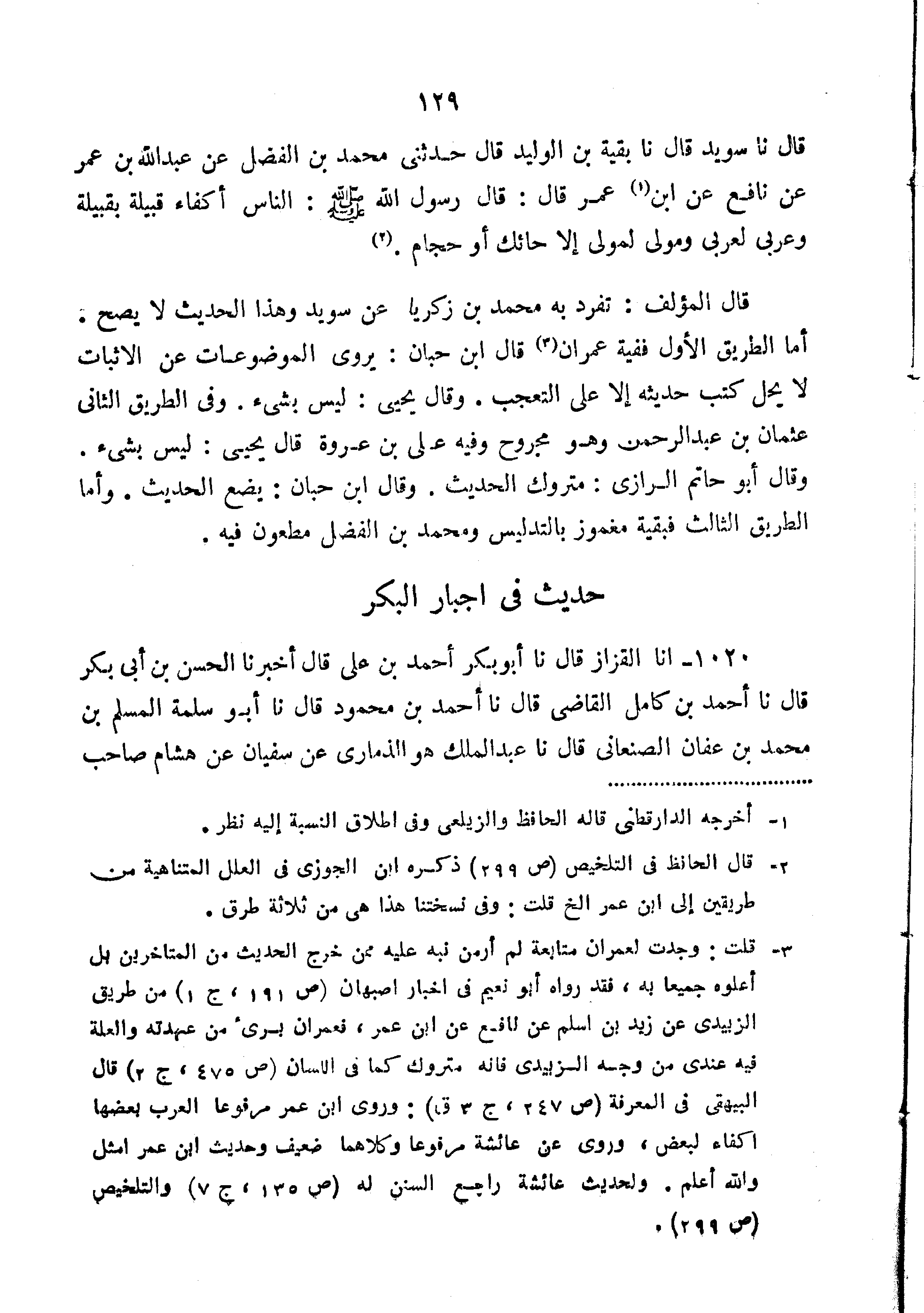 قَالَ نا سُوَيْدٌ قَالَ نا بَقِيَّةُ بْنُ الْوَلِيدِ قَالَ حَدَّثَنِي مُحَمَّدُ بْنُ الْفَضْلِ عَنْ عَبْدِ اللَّهِ بْنِ عُمَرَ عَنْ نَافِعٍ عَنِ ابْنِ عُمَرَ قَالَ: قَالَ رسول الله ص "النَّاسُ أَكْفَاءٌ قَبِيلَةٌ بِقَبِيلَةٌ وَعَرَبِيٌّ لعربي ومولى إِلا حَائِكٌ أَوْ حَجَّامٌ".