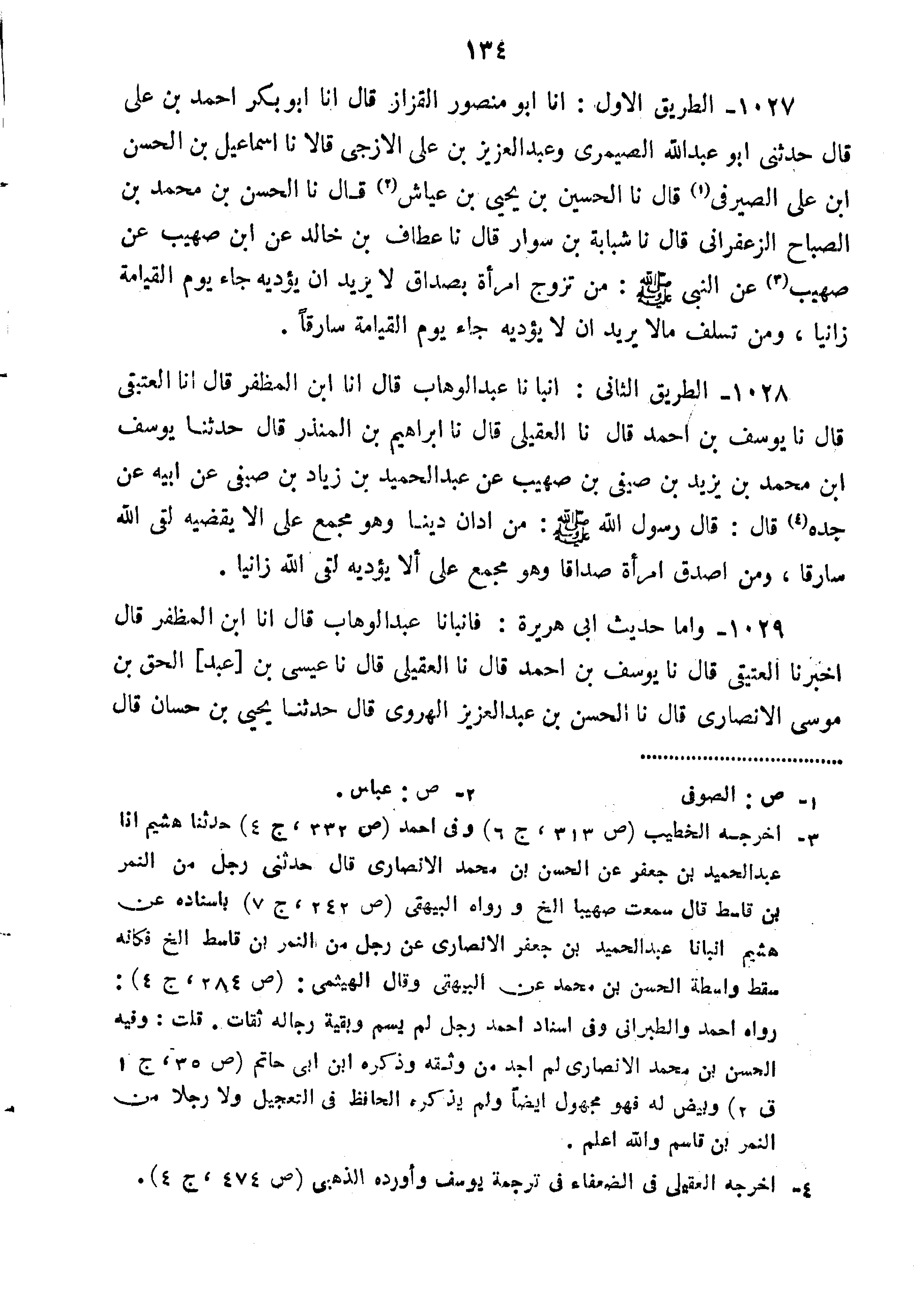 1027-الطريق الأول أن أَبُو مَنْصُورٍ الْقَزَّازُ قَالَ أَنَا أَبُو بَكْرٍ أَحْمَدُ بْنُ عَليِّ قَالَ حَدَّثَنِي أَبُو عَبْدِ اللَّهِ الصَّيْمَرِيُّ وَعَبْدُ الْعَزِيزِ بْنُ عَلِيٍّ الأَزْجِيُّ قَالا نا إِسْمَاعِيلُ بْنُ الْحَسَنِ بْنِ عَلِيٍّ الصَّيْرَفِيُّ قَالَ نا الْحُسَيْنُ بْنُ يَحْيَى بْنِ عَيَّاشٍ قَالَ نا الْحَسَنُ بْنُ محمد الزَّعْفَرَانِيُّ قَالَ نا شَبَابَةُ بْنُ سَوَّارٍ قَالَ نا عَطَّافُ بْنُ خَالِدٍ عَنِ ابْنِ صُهَيْبٍ عَنْ صُهَيْبٍ عَنِ النَّبِيِّ صَلَّى اللَّهُ عَلَيْهِ وَسَلَّمَ" مَنْ تَزَوَّجَ امْرَأَةً بِصَدَاقٍ لا يُرِيدُ أَنْ يُؤَدِّيَهُ جَاءَ يَوْمَ الْقِيَامَةِ زَانِيًا وَمَنْ تَسَلَّفَ مَالا يُرِيدُ أَنْ لا يُؤَدِّيَهُ جَاءَ يَوْمَ الْقِيَامَةِ سَارِقًا".