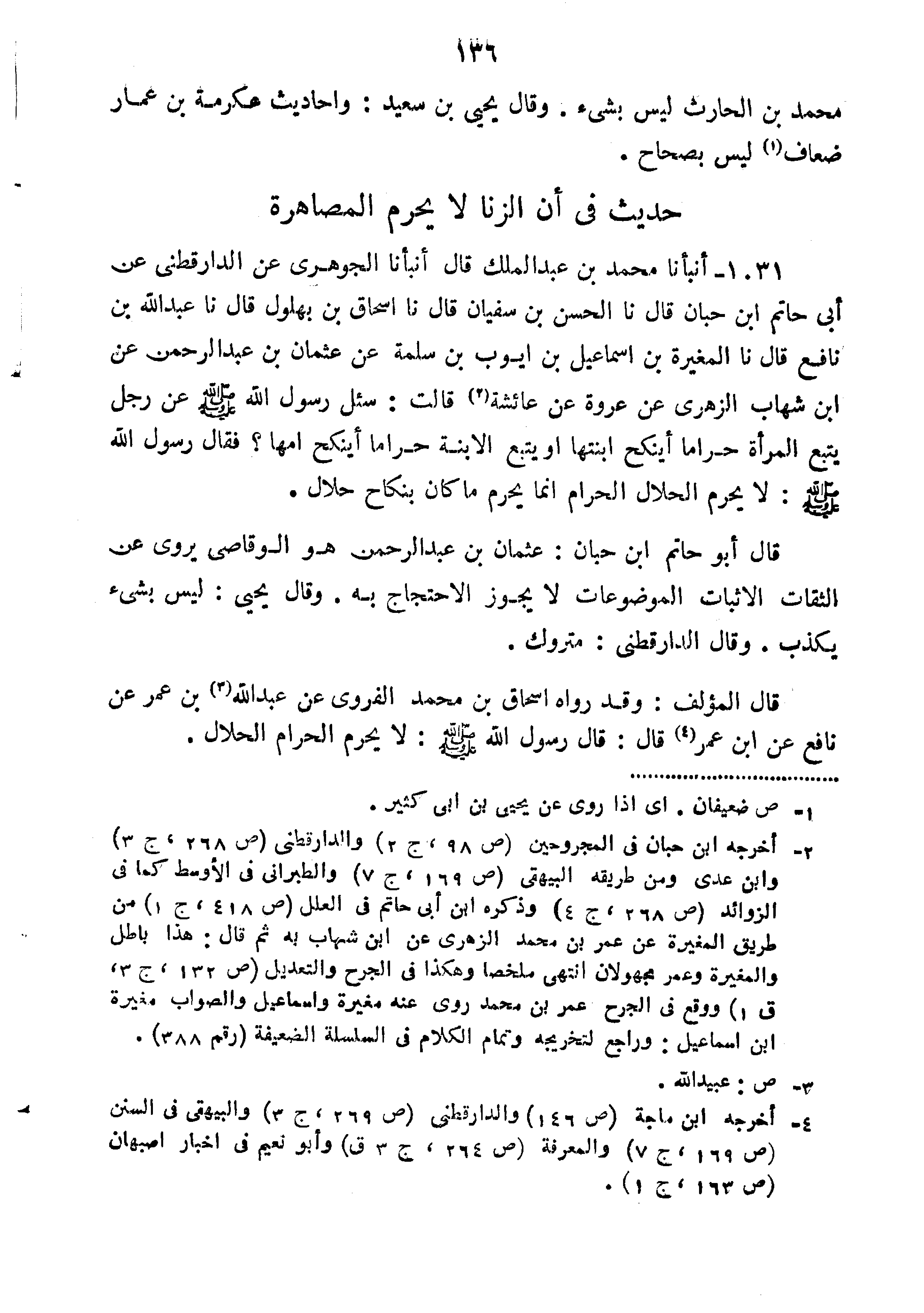 1031أَنْبَأَنَا مُحَمَّدُ بْنُ عَبْدِ الْمَلِكِ قَالَ أَنْبَأَنَا الْجَوْهَرِيِّ عَنِ الدَّارَقُطْنِيِّ عَنْ أَبِي حَاتِمِ بْنِ حَبَّانَ قَالَ نا الْحَسَنُ بْنُ سُفْيَانَ قَالَ نا إِسْحَاقَ بْنِ بُهْلُولٍ قَالَ نا عَبْدُ اللَّهِ بْنُ نَافِعٍ قَالَ نا الْمُغِيرَةُ بْنُ إِسْمَاعِيلَ بْنِ أَيُّوبَ بْنِ سَلَمَةَ عَنْ عُثْمَانَ بْنُ عَبْدِ الرَّحْمَنِ عَنِ ابْنِ شِهَابٍ الزُّهْرِيِّ عِنْ عُرْوَةَ عَنْ عَائِشَةَ قَالَتْ سُئِلَ رَسُولُ اللَّهِ صَلَّى اللَّهُ عَلَيْهِ وَسَلَّمَ عَنْ رَجُلٍ يَتْبَعُ الْمَرْأَةَ حَرَامًا أَيَنْكِحُ ابْنَتَهَا أَوْ يَتْبَعُ الابْنَةَ حَرَامًا أَيَنْكِحُ أُمَّهَا فَقَالَ رَسُولُ اللَّهِ صَلَّى اللَّهُ عَلَيْهِ وَسَلَّمَ: "لا يُحَرِّمُ الْحَلالَ الْحَرَامُ إِنَّمَا يَحْرُمُ مَا كَانَ بِنِكَاحٍ حَلالٍ".