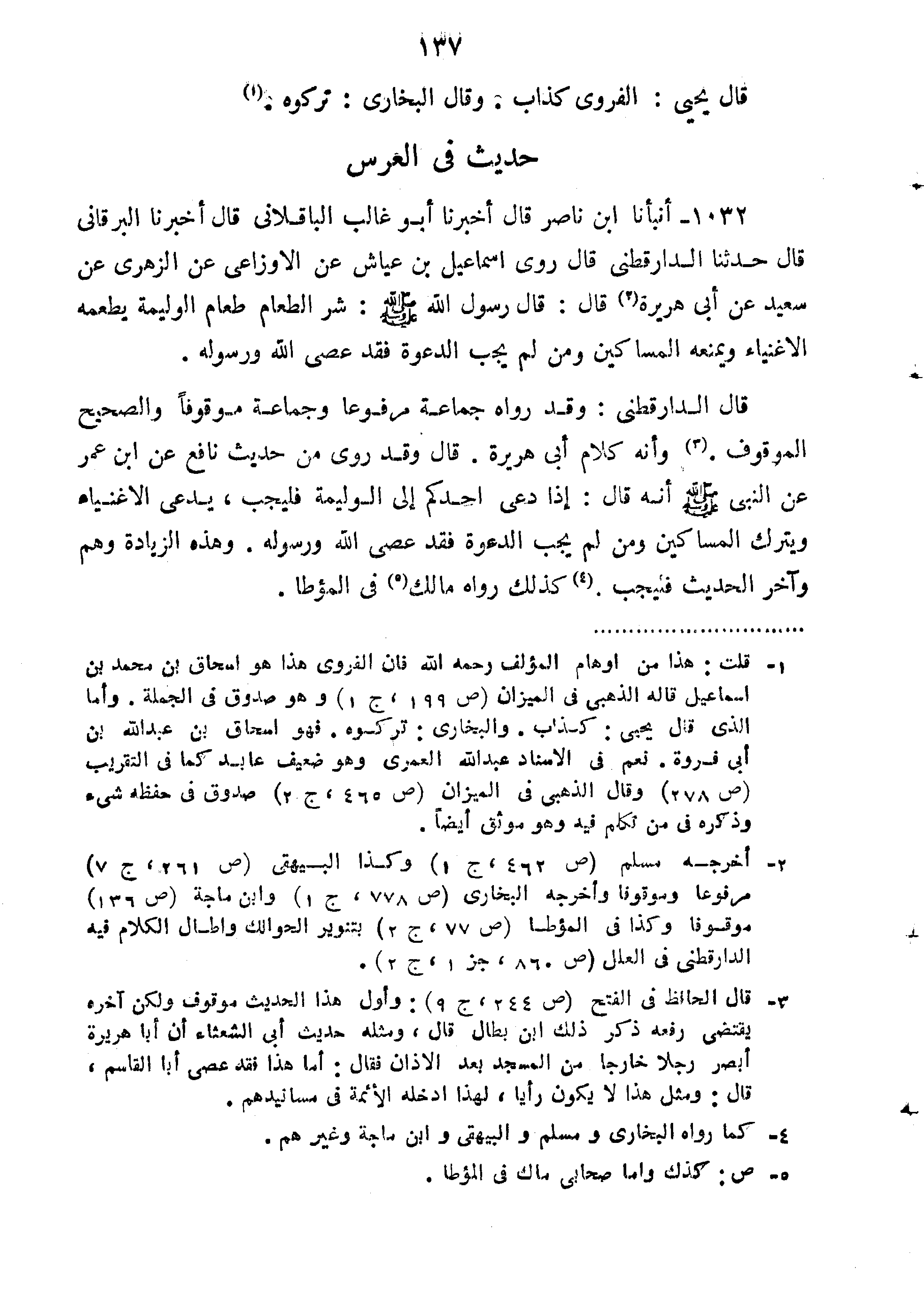 1032-أَنْبَأَنَا ابْنُ نَاصِرٍ قَالَ أَخْبَرَنَا أَبُو غَالِبٍ الْبَاقِلَّانِيُّ قَالَ أَخْبَرَنَا الْبَرْقَانِيُّ قَالَ حَدَّثَنَا الدَّارَقُطْنِيُّ قَالَ رَوَى إِسْمَاعِيلُ بْنُ عَيَّاشٍ عَنِ الأوزاعي عَنْ سَعِيدٍ عَنْ أَبِي هُرَيْرَةَ قَالَ رَسُولُ اللَّهِ صَلَّى اللَّهُ عَلَيْهِ وَسَلَّمَ: "شَرُّ الطَّعَامِ طَعَامُ الْوَلِيمَةِ يَطْعَمُهُ الأَغْنِيَاءُ وَيُمْنَعُهُ الْمَسَاكِينُ وَمَنْ لَمْ يُجِبِ الدَّعْوَةَ فَقَدْ عصى الله ورسوله".