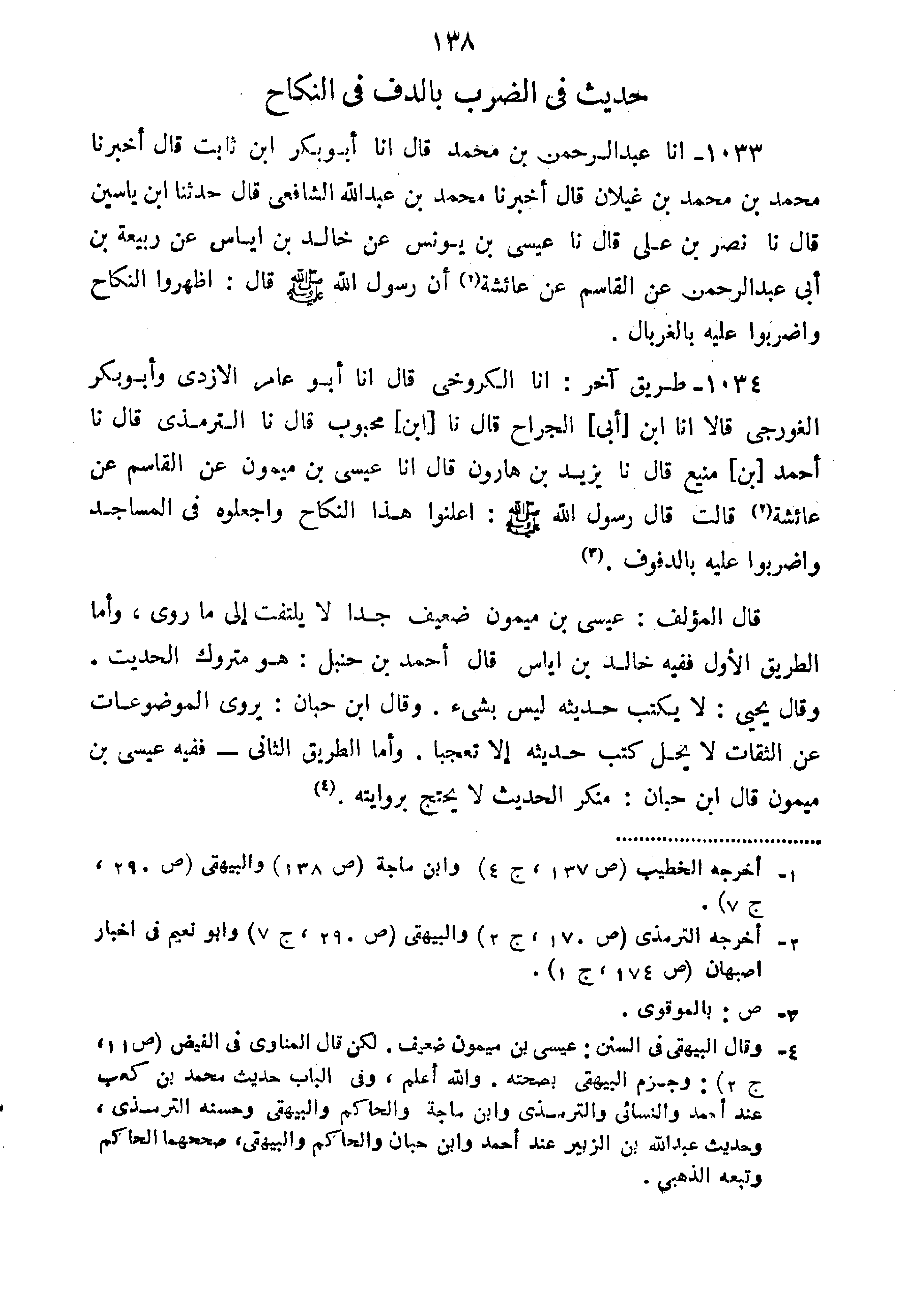 1034-طَرِيقٌ آخَرُ أَنَا الْكَرُوخِيُّ قَالَ أَنَا أَبُو عَامِرٍ الْأَزْدِيُّ وَأَبُو بَكْرٍ الْغُورَجِيُّ قَالا أَنَا ابْنُ أَبِي الْجَرَّاحِ قَالَ نا ابْنُ مَحْبُوبٍ قَالَ نا التِّرْمِذِيُّ قَالَ نا أَحْمَدُ بْنُ مَنِيعٍ قَالَ نا يَزِيدُ بْنُ هَارُونَ قَالَ أَنَا عِيسَى بْنُ مَيْمُونٍ عَنِ الْقَاسِمِ عَنْ عَائِشَةَ قَالَتْ قَالَ رَسُولُ اللَّهِ صَلَّى اللَّهُ عَلَيْهِ وَسَلَّمَ: "أَعْلِنُوا هَذَا النِّكَاحَ وَاجْعَلُوهُ فِي الْمَسَاجِدِ وَاضْرِبُوا عَلَيْهِ بِالدُّفُوفِ".