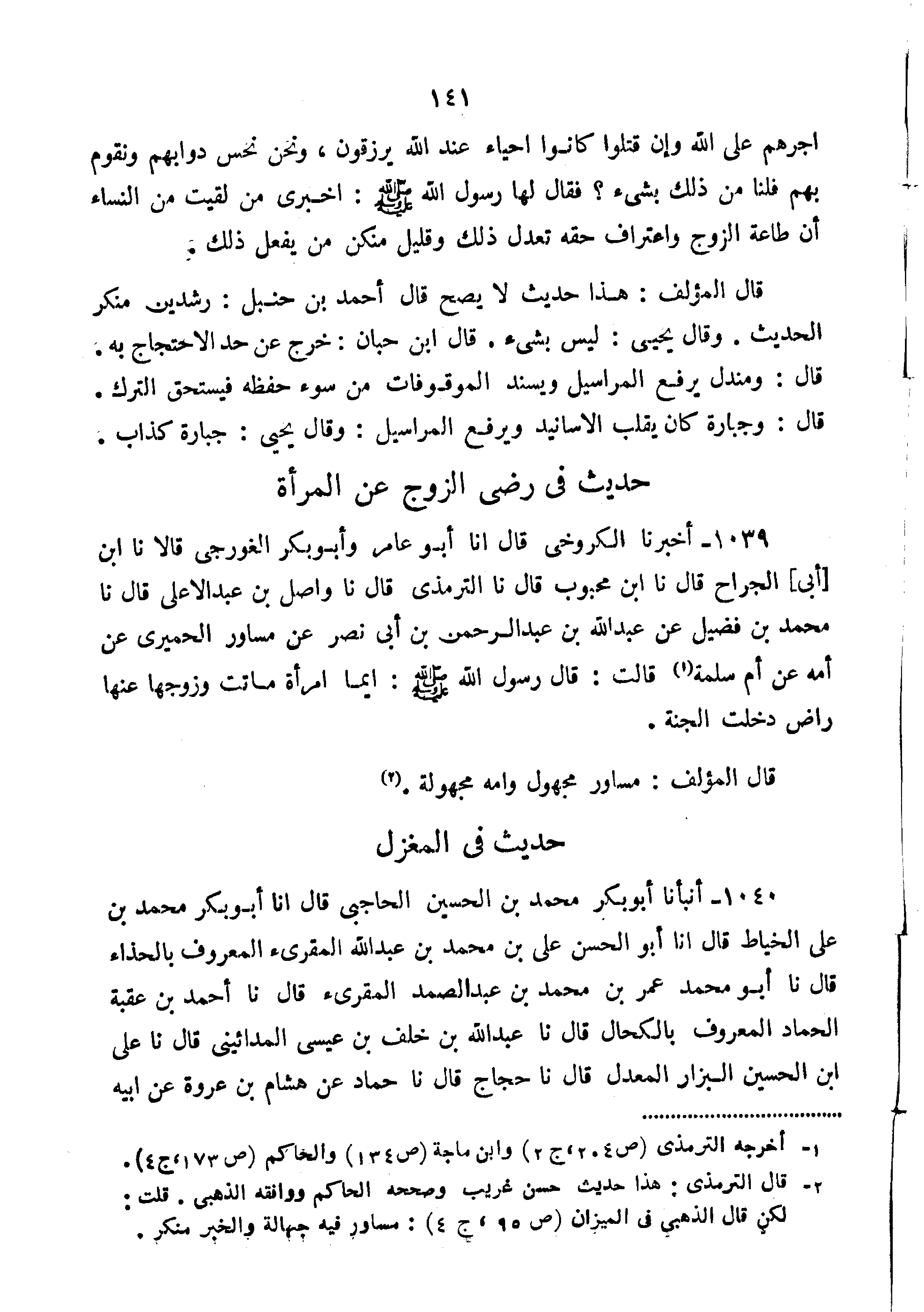 1039-أَخْبَرَنَا الْكَرُوخِيُّ قَالَ أَنَا أَبُو عَامِرٍ وَأَبُو بَكْرٍ الْغَوْرَجِيُّ قَالا نا ابْنُ أَبِي الْجَرَّاحِ قَالَ نا ابْنُ مَحْبُوبٍ قَالَ نا التِّرْمِذِيُّ قَالَ نا وَاصِلُ بْنُ عَبْدِ الأَعْلَى قَالَ نا مُحَمَّدُ بْنُ فُضَيْلٍ عَنْ عَبْدِ اللَّهِ بْنِ عَبْدِ الرَّحْمَنِ بْنِ أَبِي نَصْرٍ عَنْ مُسَاوِرٍ الْحُمَيْرِيِّ عَنْ أُمِّهِ عَنْ أُمِّ سَلَمَةَ قَالَتْ قَالَ رَسُولِ اللَّهِ صَلَّى اللَّهُ عَلَيْهِ وَسَلَّمَ: "أَيُّمَا امْرَأَةٍ مَاتَتْ وَزَوْجُهَا عَنْهَا رَاضٍ دَخَلَتِ الْجَنَّةَ".