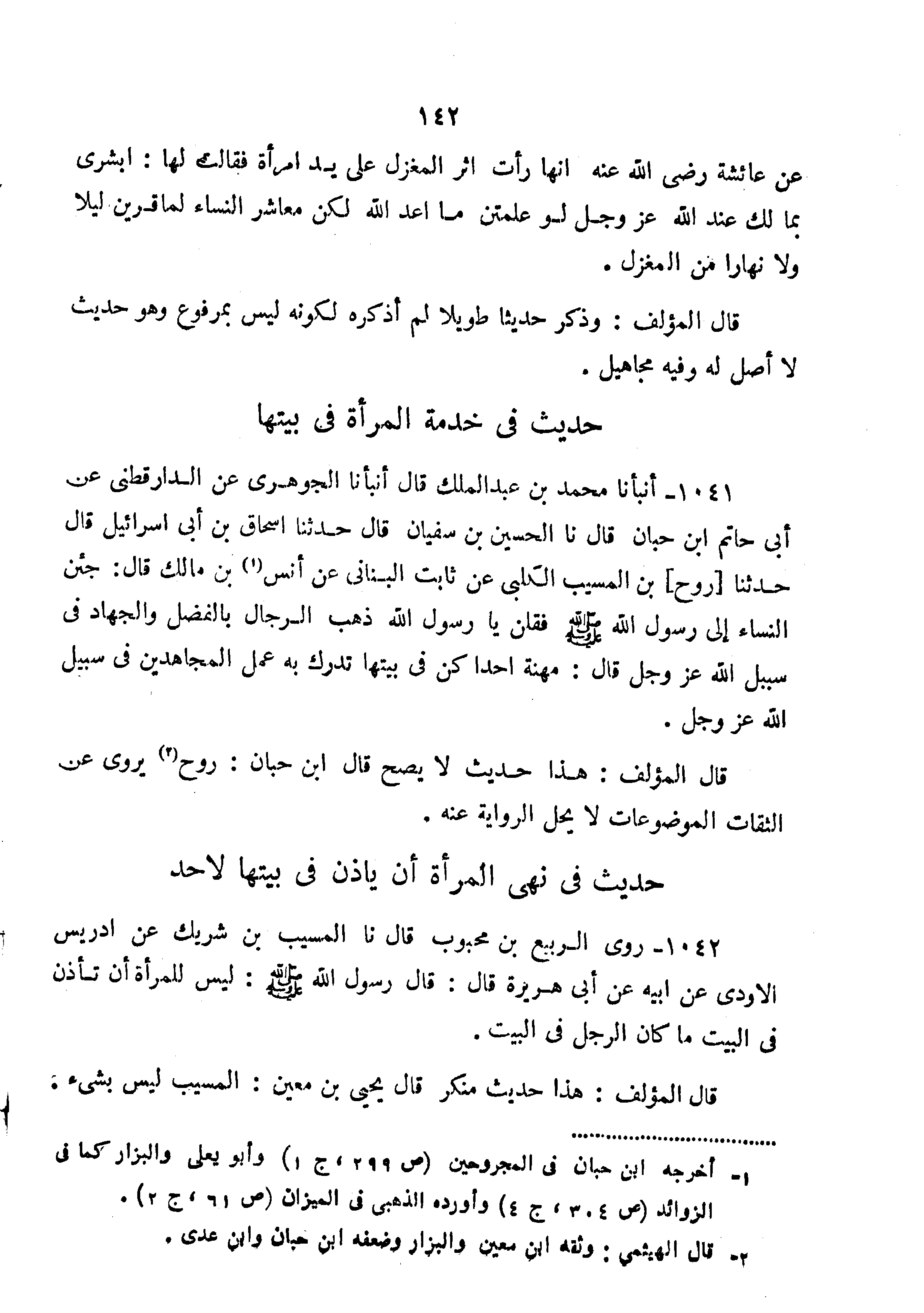 1041-أَنْبَأَنَا مُحَمَّدُ بْنُ عَبْدِ الْمَلِكِ قَالَ أَنْبَأَنَا الْجَوْهَرِيُّ عَنِ الدَّارَقُطْنِيِّ عَنْ أَبِي حَاتِمِ بْنِ حَبّانَ قَالَ نا الْحُسَيْنُ بْنُ سُفْيَانَ قَالَ حَدَّثَنَا إِسْحَاقُ بْنُ أَبِي إِسْرَائِيلَ قَالَ حَدَّثَنَا رَوْحُ بْنُ عَنْ ثَابِتٍ الْبَنَّانِيِّ عَنْ أَنَسٍ بْنِ مَالِكٍ قَالَ جِئْنَ النِّسَاءُ إلى رسول الله ص فَقُلْنَ يَا رَسُولَ اللَّهِ ذَهْبَ الرِّجَالُ بِالْفَضْلِ وَالْجِهَادِ فِي سَبِيِل اللَّهِ عَزَّ وَجَلَّ قَالَ " مِهْنَةُ إِحْدَاكُنَّ فِي بَيْتِهَا تُدْرِكُ بِهِ عَمَلَ الْمُجَاهِدِينَ فِي سَبِيلِ اللَّهِ عَزَّ وَجَلَّ".