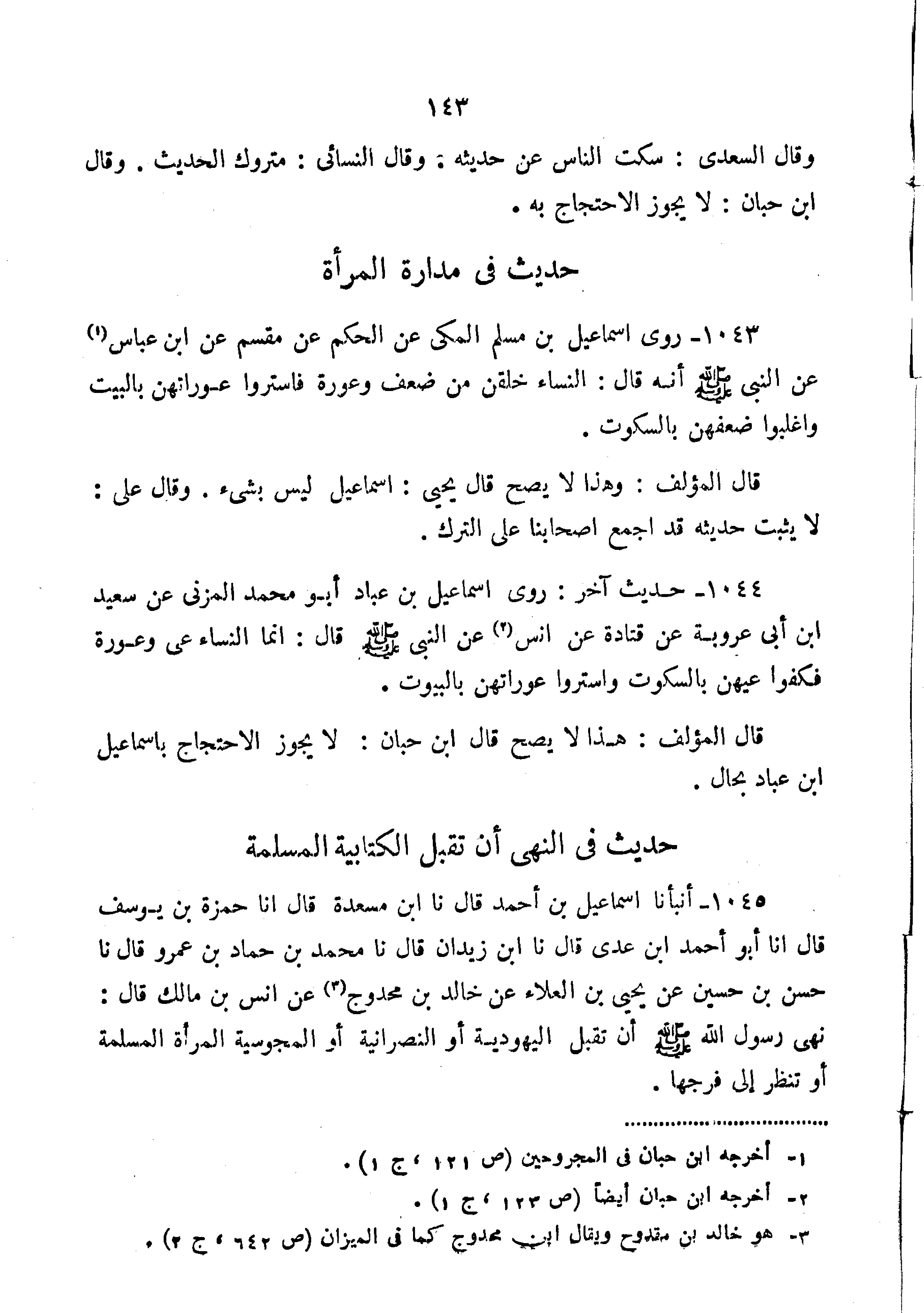 1045-أَنْبَأَنَا إِسْمَاعِيلُ بْنُ أَحْمَدَ قَالَ نا ابْنُ مَسْعَدَةَ قَالَ أَنَا حَمْزَةُ بْنُ يُوسُفَ قَالَ أَنَا أَبُو أَحْمَدَ بْنُ عَدِيٍّ قَالَ نا ابْنُ زَيْدَانَ قَالَ نا مُحَمَّدُ بْنُ حَمَّادِ بْنِ عَمْرٍو قَالَ نا حَسَنُ بْنُ حُسَيْنٍ عَنْ يَحْيَى بْنِ الْعَلاءِ عن خالد بن ممدوج عن يروي ابن مَالِكٍ قَالَ نَهَى رَسُولُ اللَّهِ صَلَّى اللَّهُ عَلَيْهِ وَسَلَّمَ إِنَّ تُقَبِّلَ الْيَهُودِيَّةُ أَوِ النَّصْرَانِيَّةُ أَوِ الْمَجُوسِيَّةُ الْمَرْأَةَ الْمُسْلِمَةَ أَوْ تَنْظُرَ إِلَى فَرْجِهَا".