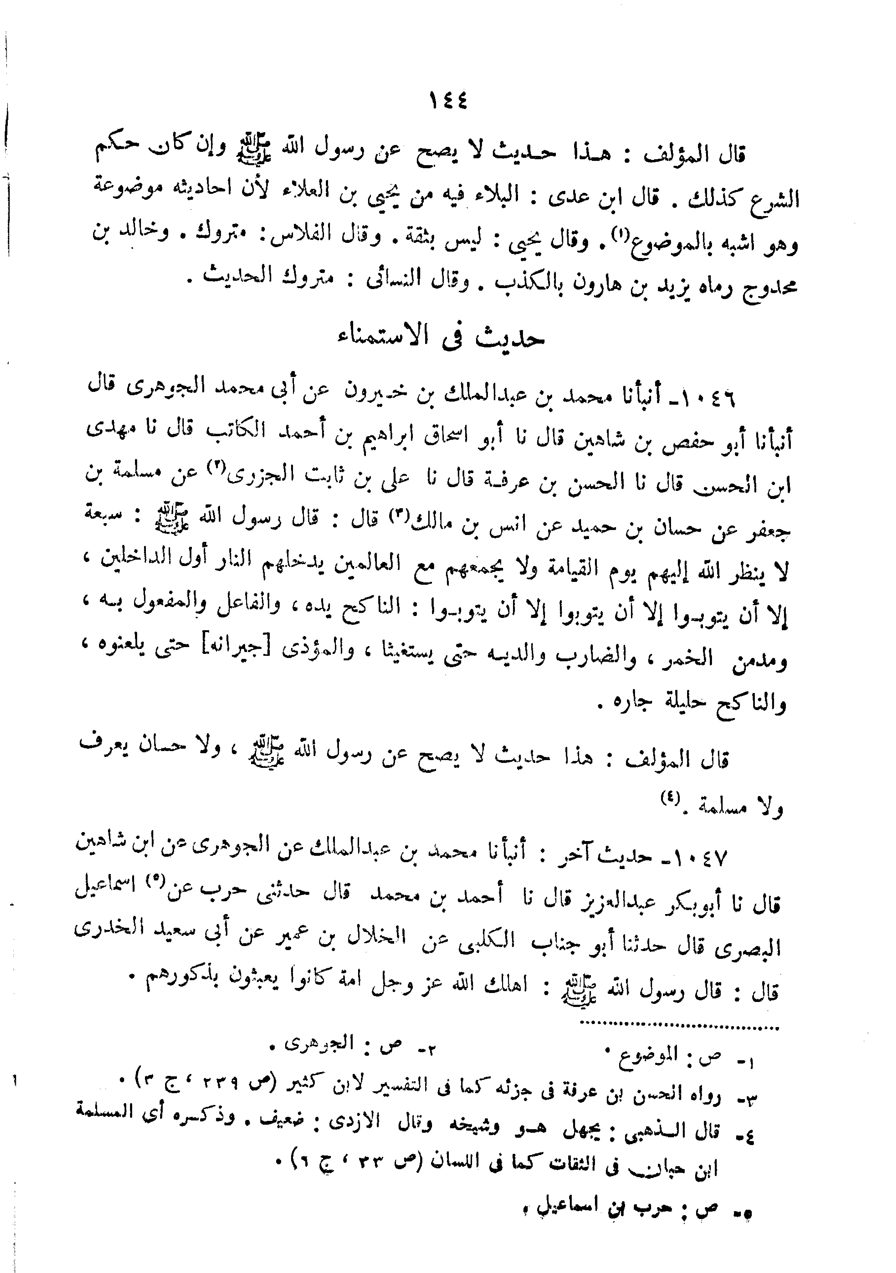 قال الْمُؤَلِّفُ: "هَذَا حَدِيثٌ لا يَصِحُّ عَنْ رَسُولِ اللَّهِ صَلَّى اللَّهُ عَلَيْهِ وَسَلَّمَ ولا حسان يعرف ولا مسلمة. 1047-حَدِيثٌ آخَرُ أَنْبَأَنَا مُحَمَّدُ بْنُ عَبْدِ الْمَلِكِ عَنْ الْجَوْهَرِيِّ عَنِ ابْنِ شَاهِينَ قَالَ نا أَبُو بَكْرٍ عَبْدُ الْعَزِيزِ قَالَ نا أَحْمَدُ بْنُ مُحَمَّدٍ قَالَ حَدَّثَنِي حَرْبٌ عَنْ إِسْمَاعِيلَ البصري قال حدثنا أبو عَنِ الْخَلالِ بْنِ عُمَيْرٍ عَنْ أبي سعيد الجدري قَالَ: قَالَ رَسُولُ اللَّهِ صَلَّى اللَّهُ عَلَيْهِ وَسَلَّمَ: "أَهْلَكَ اللَّهُ عَزَّ وَجَلَّ أُمَّةً كَانُوا يَعْبَثُونَ بِذُكُورِهِمْ".
