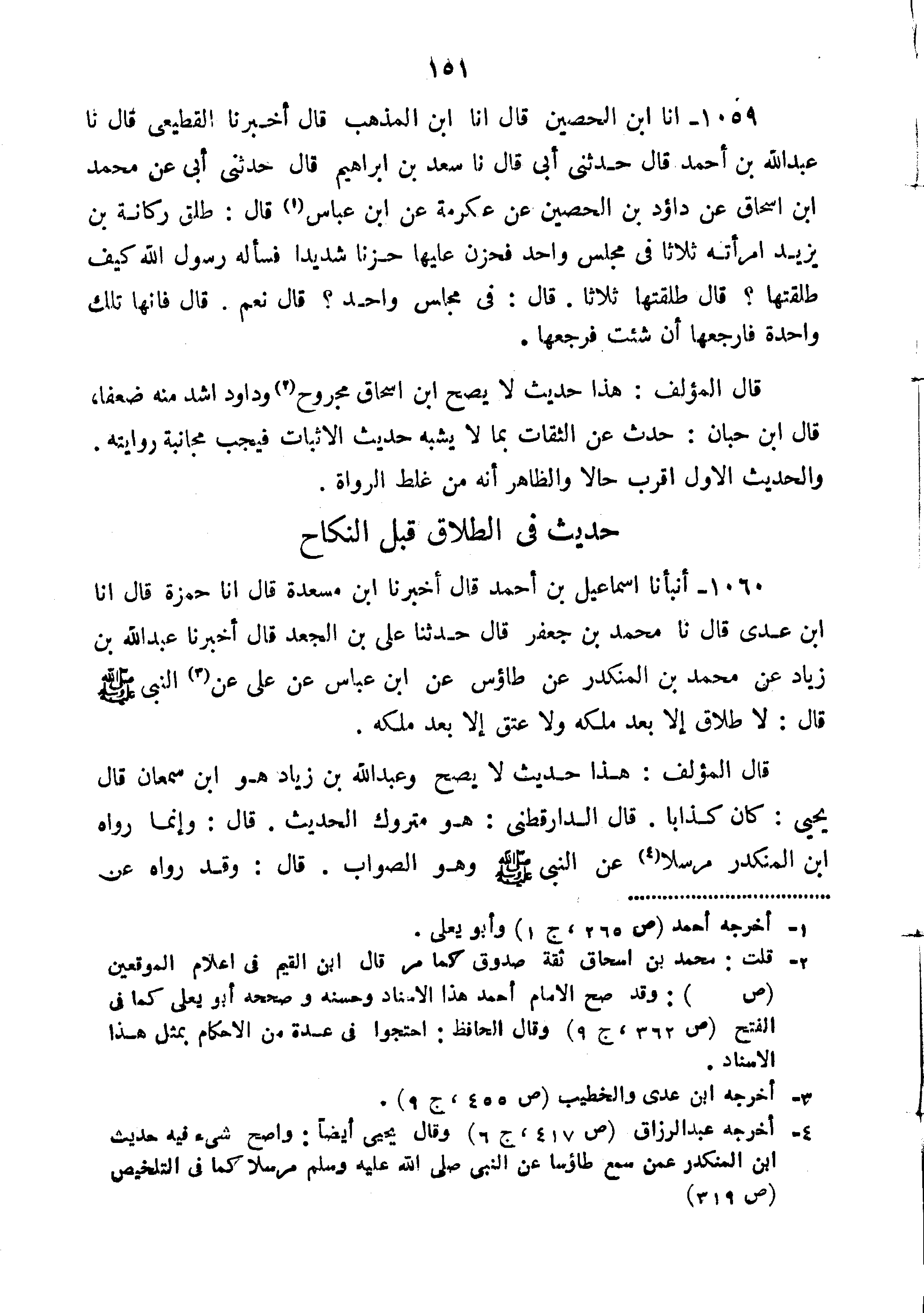 1059-أَنَا ابْنُ الْحُصَيْنِ قَالَ أَنَا ابْنُ الْمُذْهِبِ قَالَ أَخْبَرَنَا الْقَطِيعِيُّ قَالَ نا عَبْدُ اللَّهِ بْنُ أَحْمَدَ قَالَ حَدَّثَنِي أَبِي قَالَ نا سَعْدُ بْنُ إِبْرَاهِيمَ قَالَ حدثني أبي عن محمد ابن إِسْحَاقَ عَنْ دَاؤُدَ بْنِ الْحُصَيْنِ عَنْ عِكْرِمَةَ عَنِ ابْنِ عَبَّاسٍ قال طلق ركانة ابن يَزِيدَ امْرَأَتَهُ ثَلاثًا فِي مَجْلِسٍ وَاحِدٍ فَحَزِنَ عَلَيْهَا حُزْنًا شَدِيدًا فسأله رسول الله كَيْفَ طَلَّقْتَهَا قَالَ طَلَّقْتَهَا ثَلاثًا قَالَ فِي مَجْلِسٍ وَاحِدٍ قَالَ نَعَمْ قَالَ فَإِنَّهَا تِلْكَ وَاحِدَةٌ فَأَرْجِعْهَا إِنْ شِئْتَ فَرَجَّعَهَا".