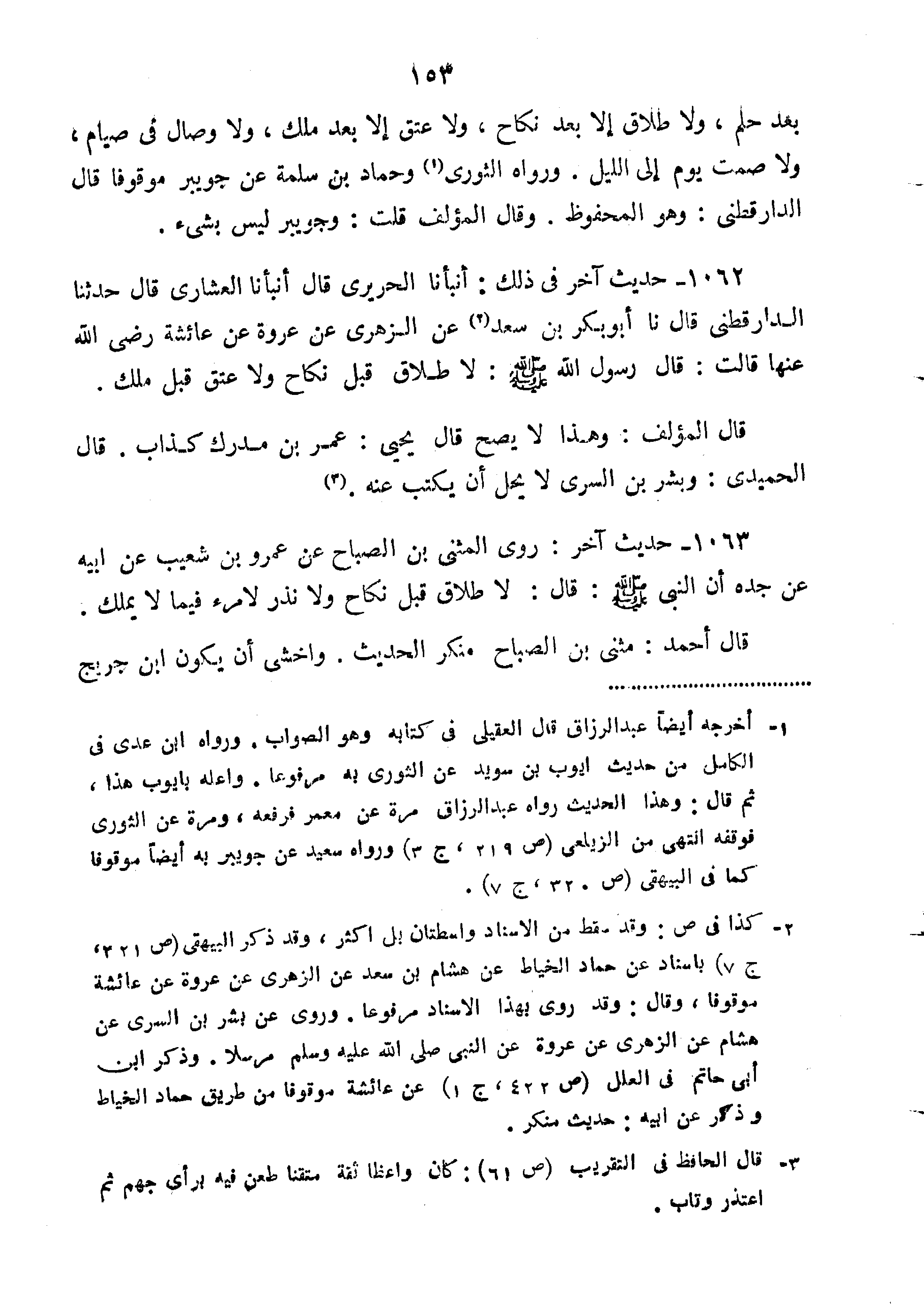 1062-حَدِيثٌ آخَرُ فِي ذَلِكَ أَنْبَأَنَا الْحَرِيرِيُّ قَالَ أَنْبَأَنَا الْعُشَارِيُّ قال حدثنا الدارقطني قَالَ نا أَبُو بَكْرِ بْنُ سَعْدٍ عَنِ الزُّهْرِيِّ عَنْ عُرْوَةَ عن عائشة رضي الله عنه قَالَتْ قَالَ رَسُولُ اللَّهِ صَلَّى اللَّهُ عَلَيْهِ وَسَلَّمَ: "لا طَلاقَ قَبْلَ نِكَاحٍ وَلا عِتْقَ قَبْلَ مِلْكٍ".