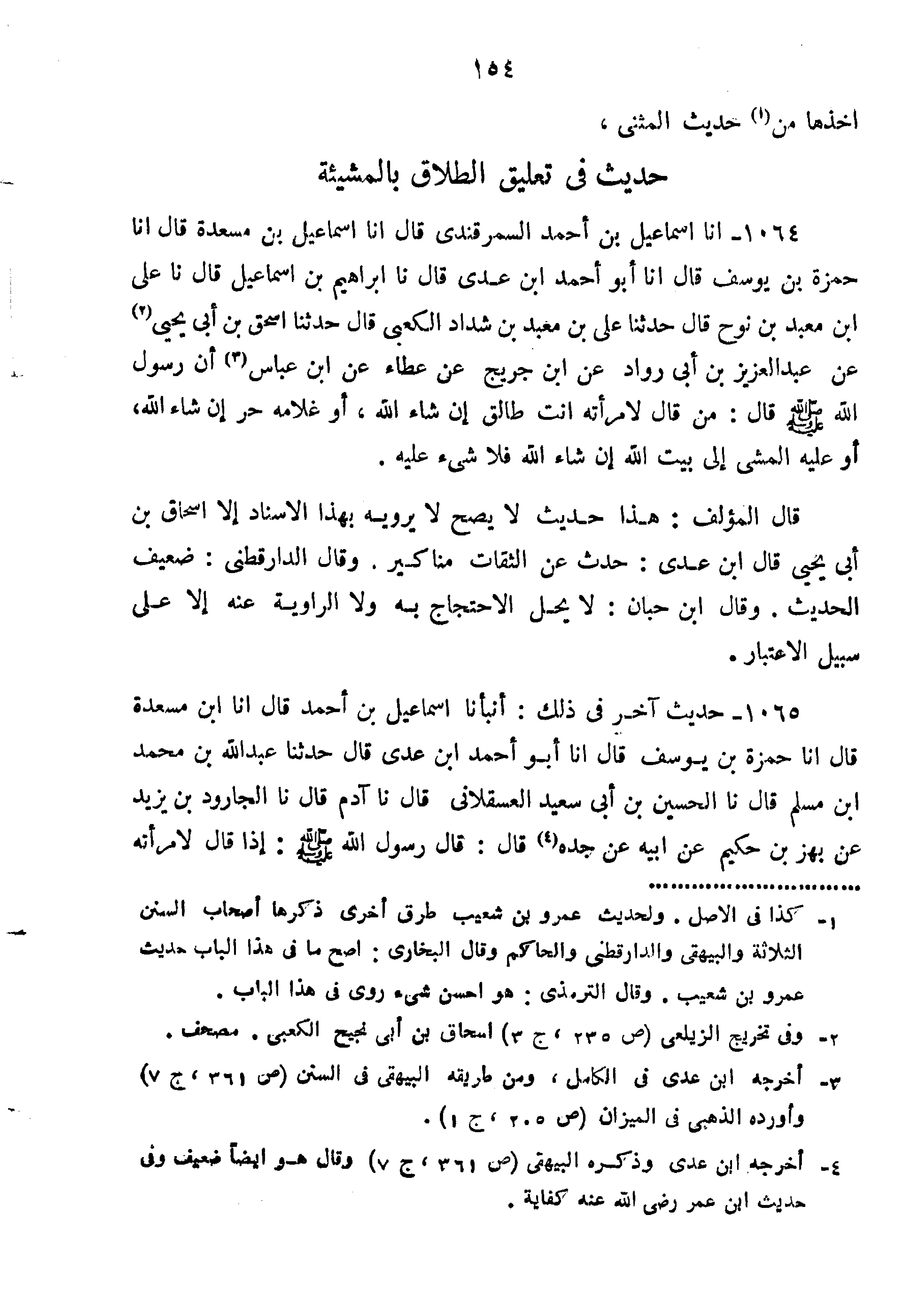 1064-أَنَا إِسْمَاعِيلُ بْنُ أَحْمَدَ السَمَرْقَنْدِيُّ قَالَ نا إِسْمَاعِيلُ بْنُ مَسْعدَةَ قَالَ أَنَا حَمْزَةُ بْنُ يُوسُفَ قَالَ أَنَا أَبُو أَحْمَدَ بْنُ عَدِيٍّ قَالَ نا إِبْرَاهِيمُ بْنُ إِسْمَاعِيلَ قَالَ نا عَلِيُّ بْنُ مَعْبَدِ بْنِ نُوحٍ قَالَ حَدَّثَنَا عَلِيُّ بْنُ مَعْبَدِ بْنِ شَدَّادٍ الْكَعْبِيُّ قال حدثنا اسحق ابن أَبِي يَحْيَى عَنْ عَبْدِ الْعَزِيزِ بن أبي دواد عَنِ ابْنِ جُرَيْجٍ عَنْ عَطَاءٍ عَنِ ابْنِ عَبَّاسٍ أَنّ رَسُولَ اللَّهِ صَلَّى اللَّهُ عَلَيْهِ وَسَلَّمَ قَالَ " مَنْ قَالَ لامْرَأَتِهِ أَنْتِ طَالِقٌ إِنْ شَاءَ اللَّهُ أَوْ غُلامُهُ حُرٌّ إِنْ شَاءَ اللَّهُ أَوْ عَلَيْهِ الْمَشْيُ إِلَى بَيْتِ اللَّهِ إِنْ شَاءَ اللَّهُ فَلا شَيْءَ عَلَيْهِ".