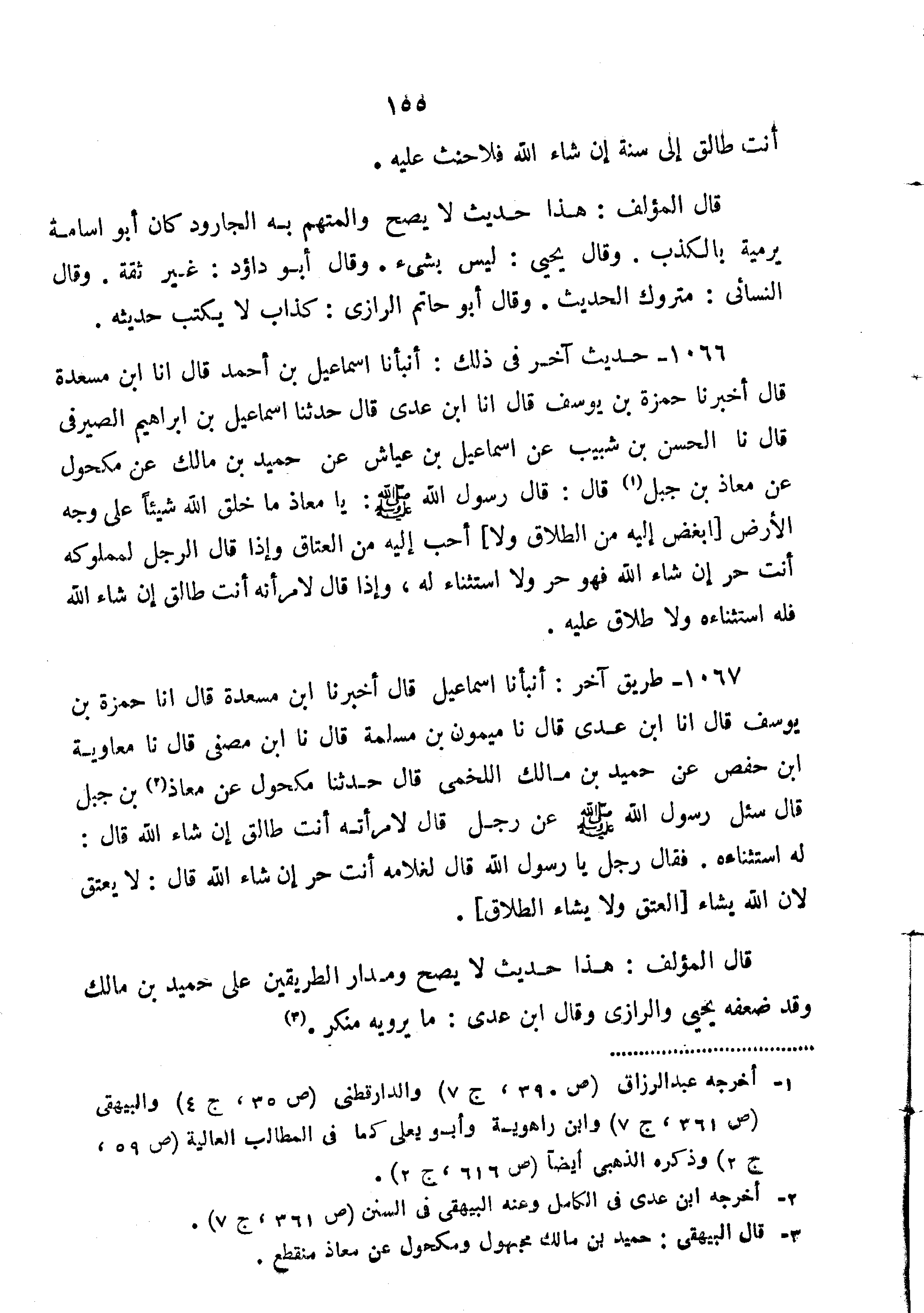 1067-طَرِيقٌ آخَرُ أَنْبَأَنَا إِسْمَاعِيلُ قَالَ أَخْبَرَنَا ابْنُ مسعدة قال أنا حمزة ابن يُوسُفَ قَالَ أَنَا ابْنُ عَدِيٍّ قَالَ نا مَيْمُونُ بْنُ مَسْلَمَةَ قال نا بن مُصَفَّى قَالَ نا مُعَاوِيَةُ بْنُ حَفْصٍ عَنْ حُمَيْدِ بْنِ مَالِكٍ اللَّخْمِيِّ قَالَ حَدَّثَنَا مَكْحُولٌ عَنْ مُعَاذِ بْنِ جَبَلٍ قَالَ سُئِلَ رَسُولِ اللَّهِ صَلَّى اللَّهُ عَلَيْهِ وَسَلَّمَ عَنْ رَجُلٍ قَالَ لامْرَأَتِهِ أَنْتِ طَالِقٌ إِنْ شَاءَ اللَّهُ قَالَ لَهُ اسْتِثْنَاءُهُ فَقَالَ رَجُلٌ يَا رَسُولَ اللَّهِ قَالَ لِغُلامِهِ أَنْتَ حُرٌّ إِنْ شَاءَ اللَّهُ قال "لا يُعْتَقُ لأَنَّ اللَّهَ يَشَاءُ الْعِتْقَ وَلا يَشَاءُ الطَّلاقَ".