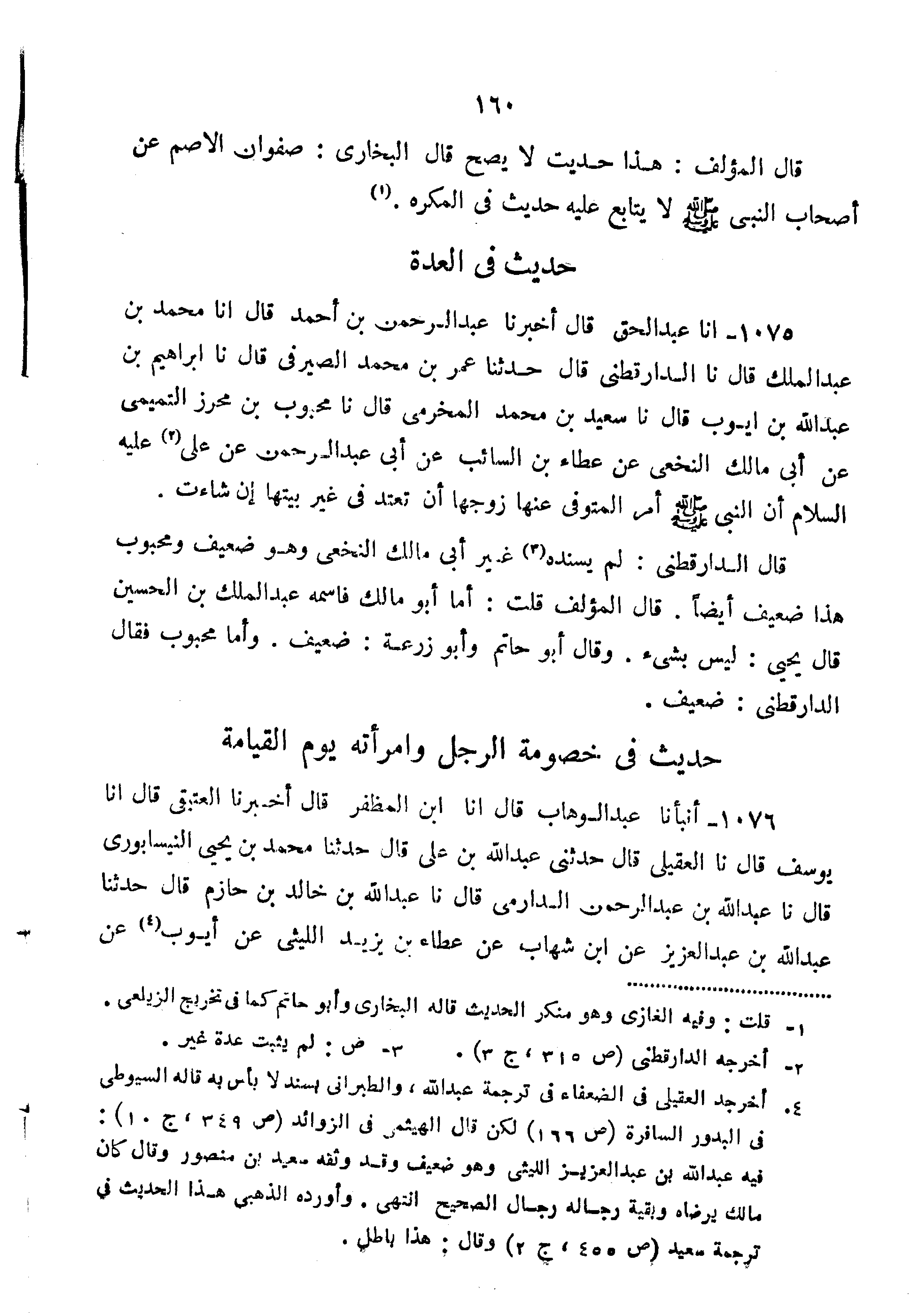 1075-أَنَا عَبْدُ الْحَقِّ قَالَ أَخْبَرَنَا عَبْدُ الرَّحْمَنِ بْنُ أَحْمَدَ قَالَ أَنَا مُحَمَّدُ بْنُ عَبْدِ الْمَلِكِ قَالَ نا الدَّارَقُطْنِيُّ قَالَ حَدَّثَنَا عُمَرُ بْنُ مُحَمَّدٍ الصِّيرَفِيُّ قَالَ نا إِبْرَاهِيمُ بْنُ عَبْدِ اللَّهِ بْنِ أَيُّوبَ قَالَ نا سَعِيدُ بْنُ مُحَمَّدٍ الْمَخْرَمِيُّ قَالَ نا مَحْبُوبُ بْنُ مُحْرِزٍ التَّمِيمِيُّ عَنْ أَبِي مَالِكٍ النَّخَعِيِّ عَنْ عَطَاءِ بْنِ السَّائِبِ عَنْ أَبِي عَبْدِ الرَّحْمَنِ عَنْ عَلِيٍّ عَلَيْهِ السَّلامُ أَنّ النَّبِيَّ صَلَّى اللَّهُ عَلَيْهِ وَسَلَّمَ أَمَرَ الْمُتَوَفَّى عَنْهَا زَوْجُهَا أن تعتد بيتها إن شاءت".