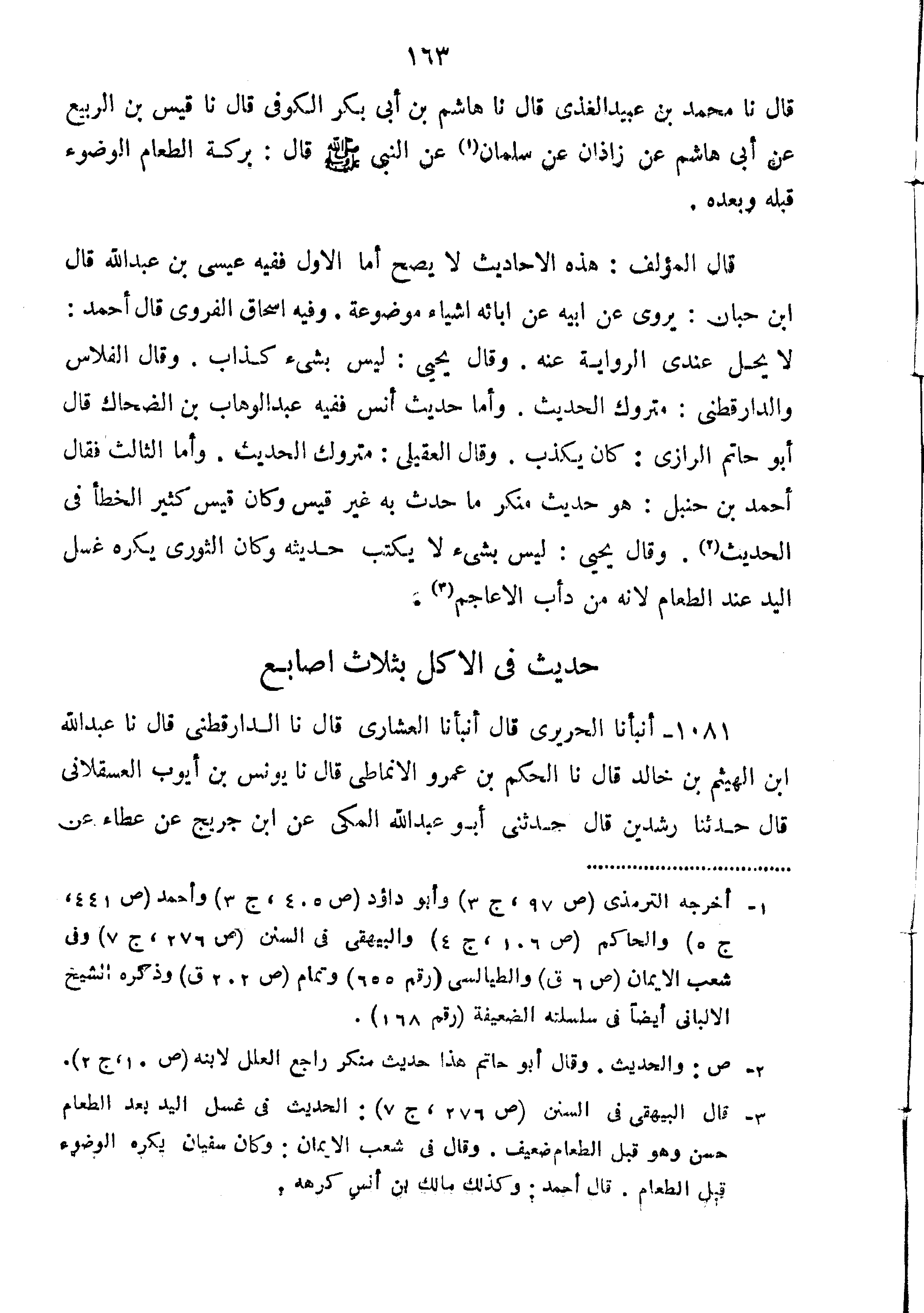 قَالَ أَبُو حَاتِمٍ: "الرَّازِيُّ كَانَ يكذب وقال العقيلي: "متروك الحديث وأما الثالث فقال أَحْمَد بْن حنبل هُوَ حديث منكر ما حدث قَيْس وكان قَيْس كثير الخطأ فِي الحديث وقال يَحْيَى ليس بشيء لا يكتب حديثه وكان الثوري يكره غسل اليد عند الطعام لأنه من دأب الأعاجم".