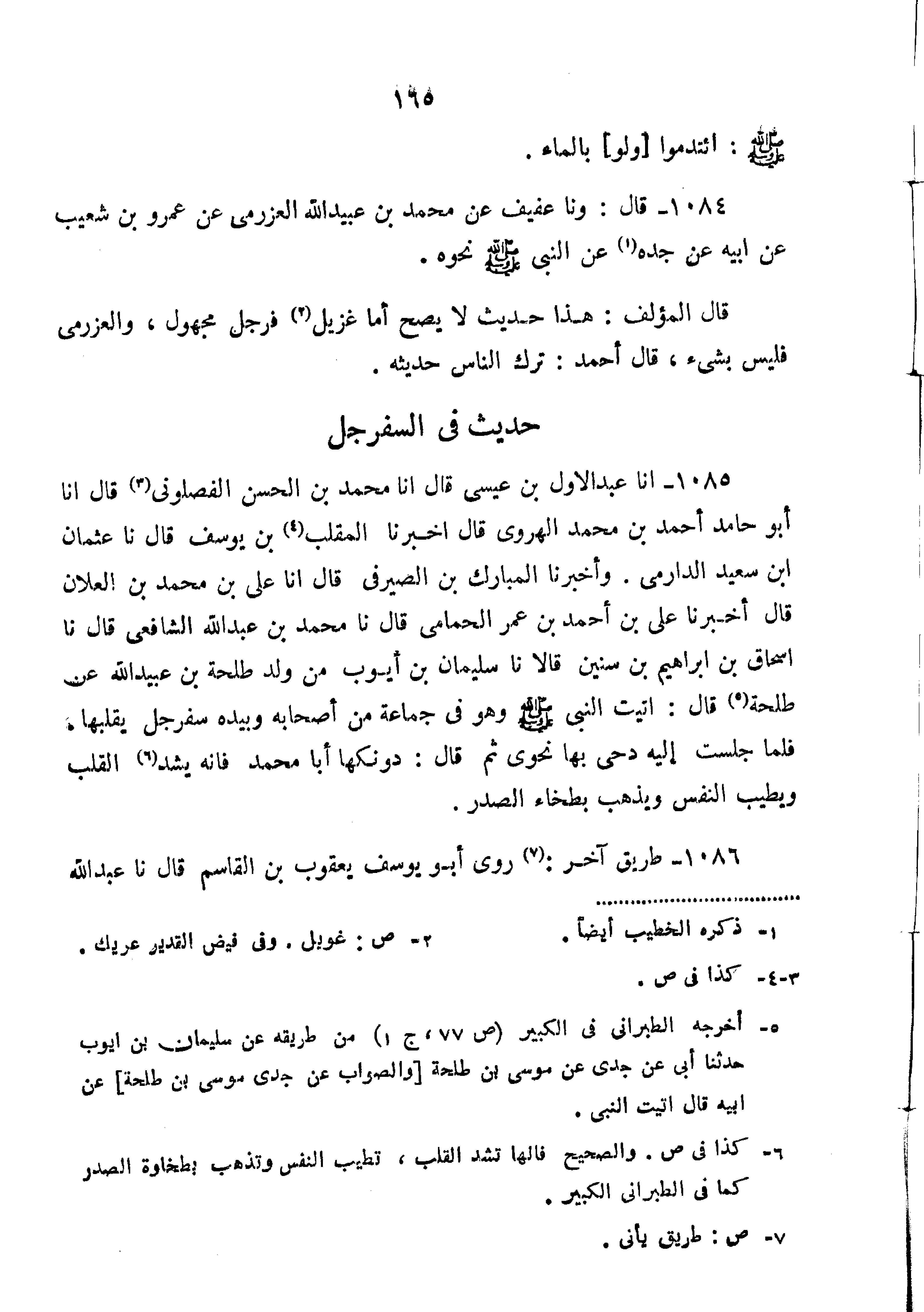 1084-قَالَ وَنَا عَفِيفٌ عَنْ مُحَمَّدِ بْنِ عُبَيْدِ اللَّهِ الْعَزْرَمِيِّ عَنْ عَمْرِو بْنِ شُعَيْبٍ عَنْ أَبِيهِ عَنْ جَدِّهِ عَنِ النَّبِيِّ صَلَّى اللَّهُ عَلَيْهِ وَسَلَّمَ نَحْوِهِ".