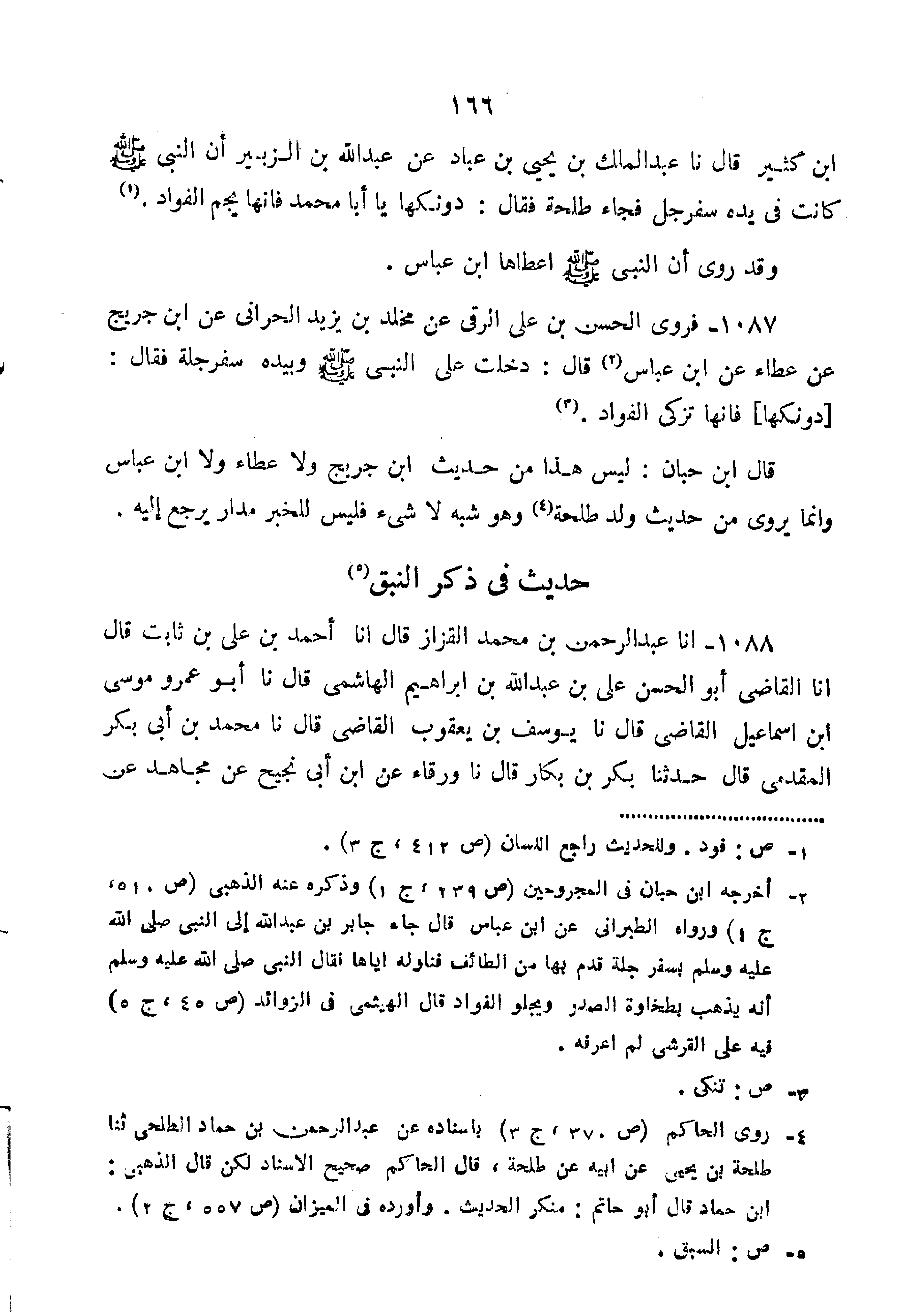 1087- فَرَوَى الْحَسَنُ بْنُ عَلِيٍّ الرَّقِّيُّ عَنْ مَخْلَدِ بْنِ يَزِيدَ الْحَرَّانِيُّ عَنِ ابْنِ جُرَيْجٍ عَنْ عَطَاءٍ عَنِ ابْنِ عَبَّاسٍ قَالَ دَخَلْتُ عَلَى النَّبِيِّ صَلَّى اللَّهُ عَلَيْهِ وَسَلَّمَ وَبِيَدِهِ سَفَرْجَلَةٌ فَقَالَ "ونكها فَإِنَّهَا تُزَكِّي الْفُؤَادَ".