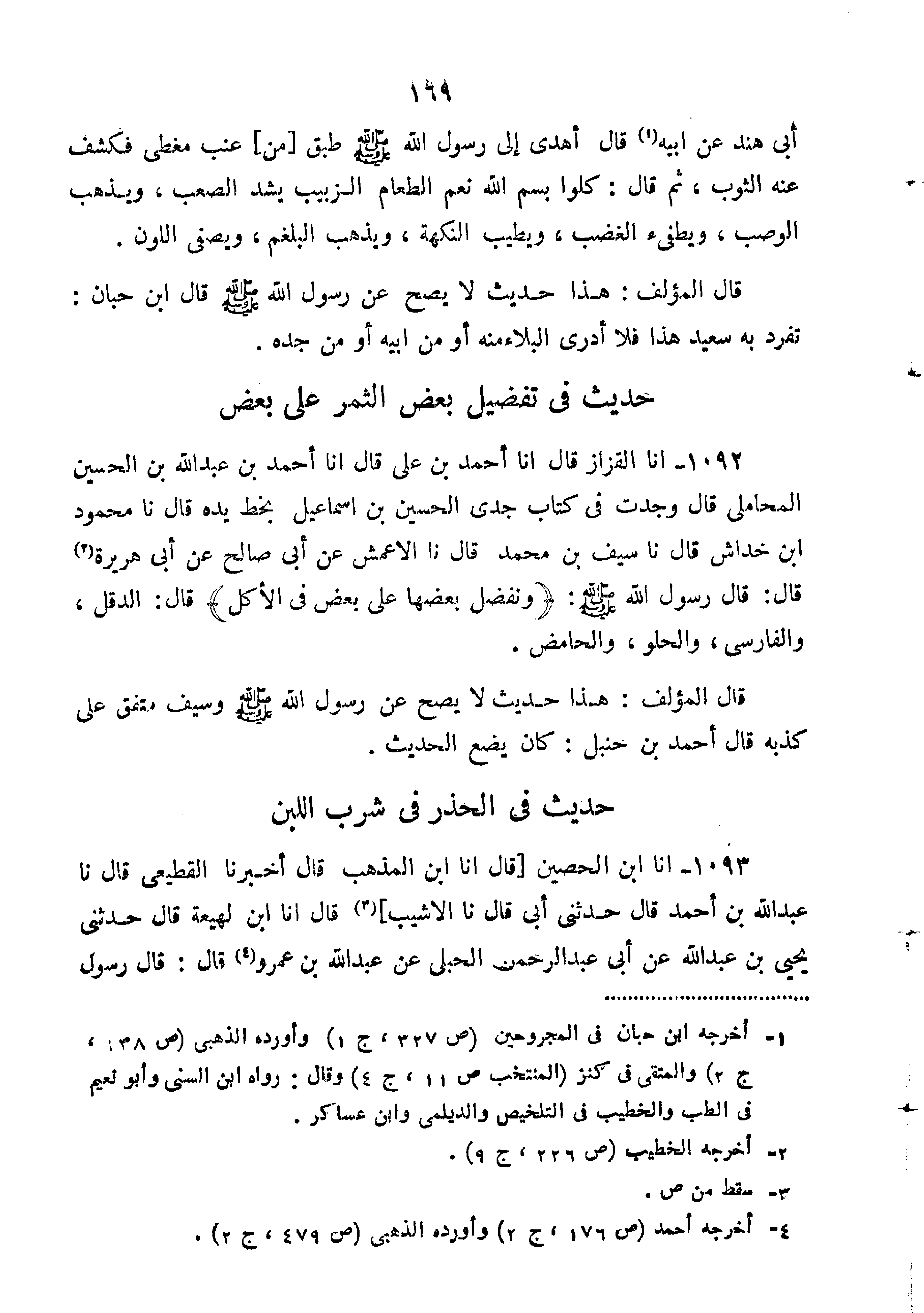 1092-أَنَا الْقَزَّازُ قَالَ أَنَا أَحْمَدُ بْنُ عَلِيٍّ قَالَ أَنَا أَحْمَدُ بْنُ عَبْدِ اللَّهِ بْنَ الْحُسَيْنِ الْمَحَامِلِيُّ قَالَ وَجَدْتُ فِي كِتَابِ جَدِّي الْحُسَيْنُ بْنُ إِسْمَاعِيلَ بِخَطِّ يَدِهِ قَالَ نا مَحْمُودُ بْنُ خِدَاشٍ قَالَ نا سَيْفُ بْنُ مُحَمَّدٍ قَالَ نا الْأَعْمَشُ عَنْ أَبِي صَالِحٍ عَنْ أَبِي هُرَيْرَةَ قَالَ: قَالَ رَسُولُ اللَّهِ صَلَّى اللَّهُ عَلَيْهِ وَسَلَّمَ: "وَنُفَضِّلُ بَعْضَهَا عَلَى بَعْضٍ فِي الأُكُلِ قَالَ الدَّقَلُ وَالْفَارِسِيُّ وَالْحُلْوُ وَالْحَامِضُ".