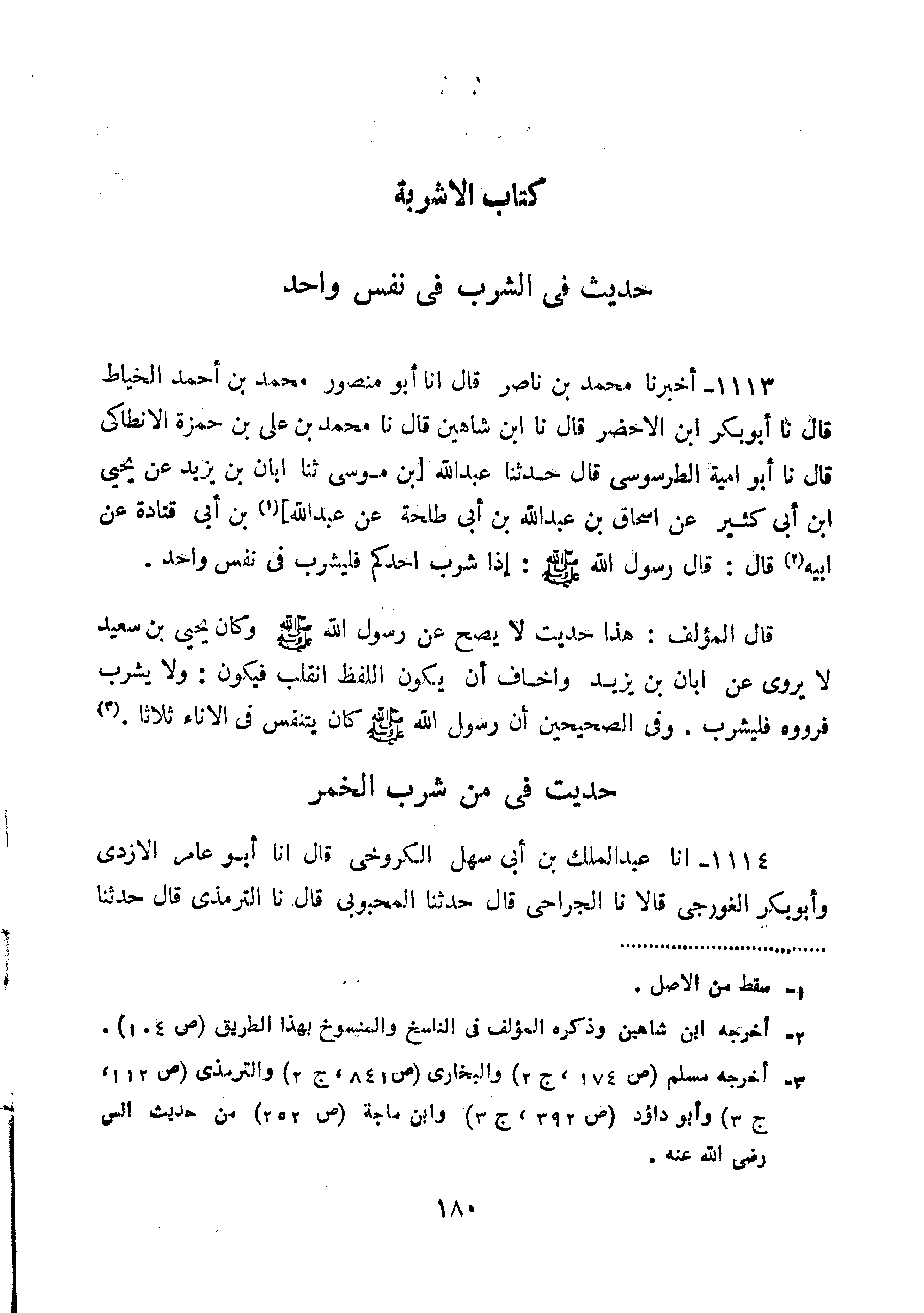 أَخْبَرَنَا مُحَمَّدُ بْنُ نَاصِرٍ قَالَ أَنَا أَبُو مَنْصُورٍ مُحَمَّدُ بْنُ أَحْمَدَ الْخَيَّاطُ قَالَ نا أَبُو بَكْرِ بْنُ الأَخْضَرِ قَالَ نا ابْنُ شَاهِينَ قَالَ نا مُحَمَّدُ بْنُ عَلِيِّ بْنِ حَمْزَةَ الأَنْطَاكِيُّ قَالَ نا أبو أمية الطر سوسي قَالَ حَدَّثَنَا عَبْدُ اللَّهِ بْنُ مُوسَى ثنا أَبَانُ بْنُ يَزِيدَ عَنْ يَحْيَى بْنِ أَبِي كَثِيرٍ عَنْ إِسْحَاقَ بْنِ عَبْدِ اللَّهِ بْنِ أَبِي طَلْحَةَ عَنْ عَبْدِ اللَّهِ بْنِ أَبِي قَتَادَةَ عَنْ أَبِيهِ قَالَ: قَالَ رَسُولُ اللَّهِ صَلَّى اللَّهُ عَلَيْهِ وَسَلَّمَ: "إِذَا شَرِبَ أَحَدُكُمْ فَلْيَشْرَبْ فِي نَفَسٍ وَاحِدٍ".