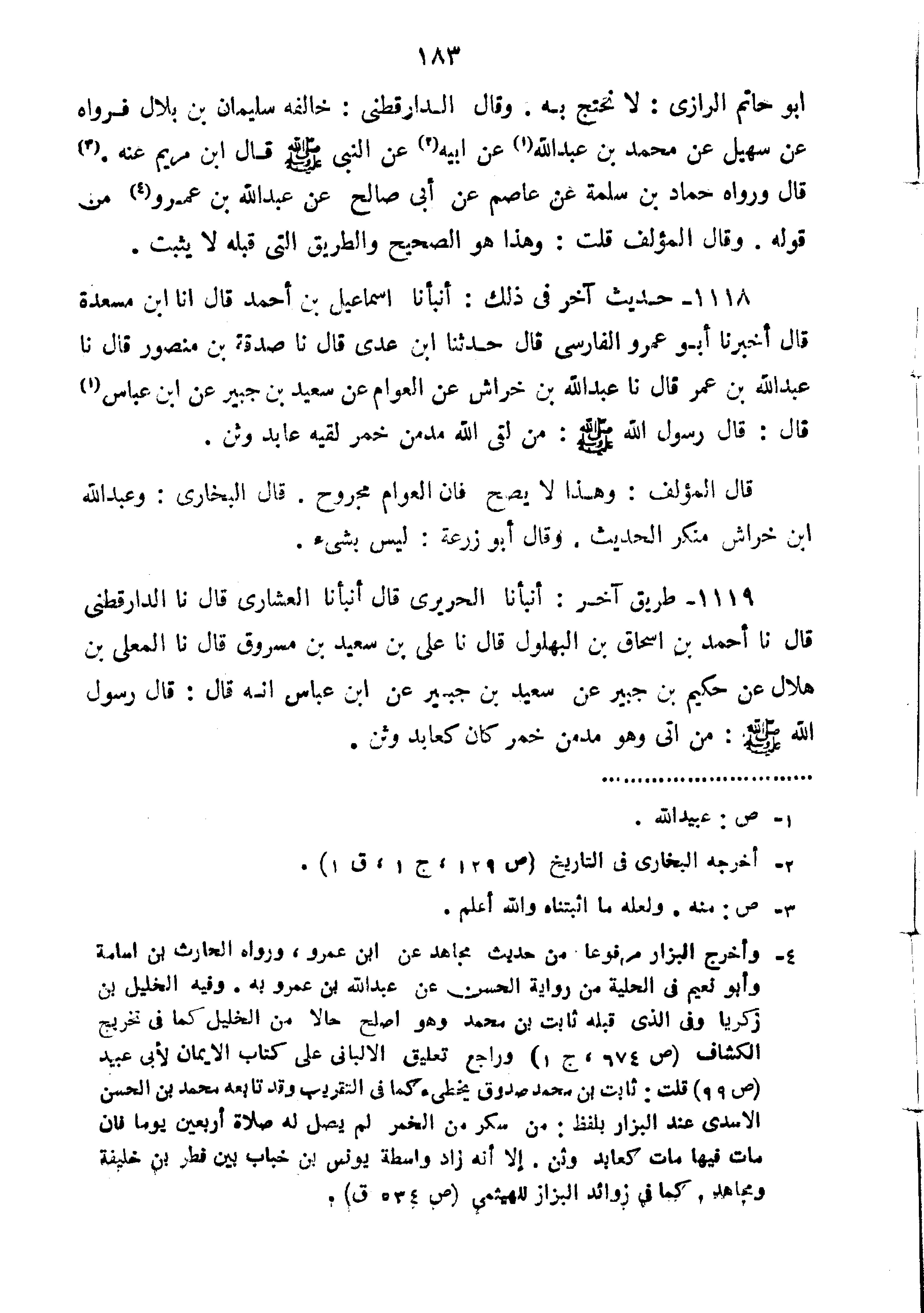 1119-طَرِيقٌ آخَرُ أَنْبَأَنَا الْحَرِيرِيُّ قَالَ أَنْبَأَنَا الْعُشَارِيُّ قَالَ نا الدارقطني قَالَ نا أَحْمَدُ بْنُ إِسْحَاقَ بْنِ الْبُهْلُولِ قَالَ نا عَلِيُّ بْنُ سَعِيدِ بْنِ مَسْرُوقٍ قَالَ نا المعلى ابن هِلالٍ عَنْ حَكِيمِ بْنِ جُبَيْرٍ عَنْ سَعِيدِ بْنِ جُبَيْرٍ عَنِ ابْنِ عَبَّاسٍ أَنَّهُ قَالَ: قَالَ رَسُولِ اللَّهِ صَلَّى اللَّهُ عَلَيْهِ وَسَلَّمَ: "مَنْ أُتِيَ وَهُوَ مُدْمِنُ خَمْرٍ كَانَ كَعَابِدِ وَثَنٍ".