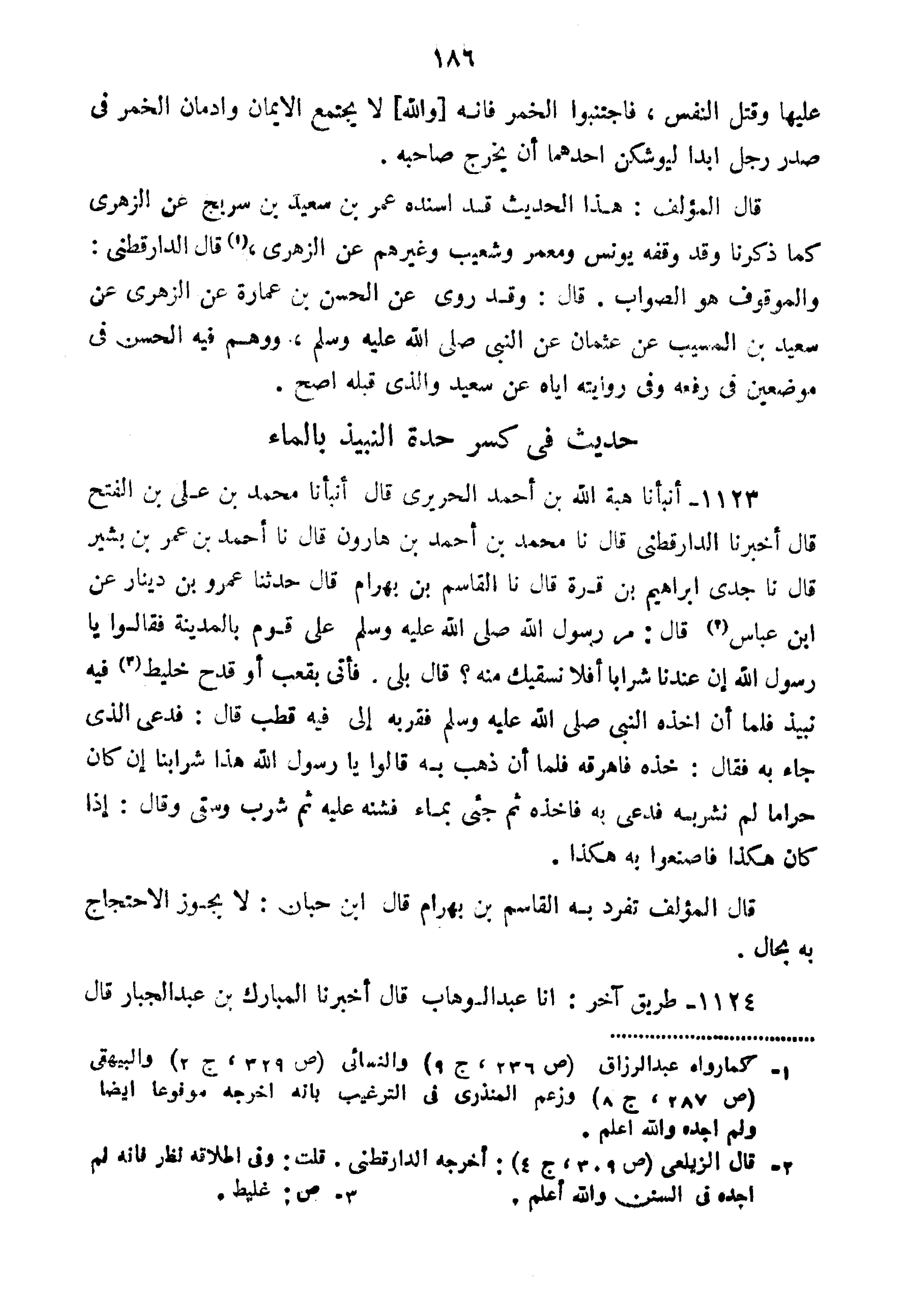 1123-أَنْبَأَنَا هِبَةُ اللَّهِ بْنُ أَحْمَدَ الْحَرِيرِيُّ قَالَ أَنْبَأَنَا مُحَمَّدُ بْنُ عَلِيِّ بْنِ الْفَتْحِ قَالَ أَخْبَرَنَا الدَّارَقُطْنِيُّ قَالَ نا مُحَمَّدُ بْنُ أَحْمَدَ بْنِ هَارُونَ قَالَ نا أَحْمَدُ بْنُ عُمَرَ بْنِ بَشِيرٍ قَالَ نا جَدِّي إِبْرَاهِيمُ بْنُ قُرَّةَ قَالَ نا الْقَاسِمُ بْنُ بِهْرَامَ قَالَ حَدَّثَنَا عَمْرُو بْنِ دِينَارٍ عَنِ ابْنِ عَبَّاسٍ قَالَ مَرَّ رَسُولُ اللَّهِ صَلَّى اللَّهُ عَلَيْهِ وَسَلَّمَ عَلَى قَوْمٍ بِالْمَدِينَةِ فَقَالُوا يَا رَسُولَ اللَّهِ إِنَّ عِنْدَنَا شَرَابًا أَفَلا نَسْقِيكَ مِنْهُ قَالَ بَلَى فَأُتِيَ بِقَعْبٍ أَوْ قَدَحٍ خَلِيطٍ فِيهِ نَبِيذٌ فلما أن أَخَذَهُ النَّبِيُّ صَلَّى اللَّهُ عَلَيْهِ وَسَلَّمَ فَقَرَّبَهُ إِلَى فِيهِ قَطَبَ قال فدعي الَّذِي جَاءَ بِهِ فَقَالَ خُذْهُ فاهرته فَلَمَّا أَنْ ذَهَبَ بِهِ قَالُوا يَا رَسُولَ اللَّهِ هَذَا شَرَابُنَا إِنْ كَانَ حَرَامًا لَمْ نَشْرَبْهُ فدعي بِهِ فَأَخَذَهُ ثُمَّ جِيءَ بِمَاءٍ فَشَنَّهُ عَلَيْهِ ثُمَّ شَرِبَ وَسُقِيَ وَقَالَ إِذَا كَانَ هَكَذَا فَاصْنَعُوا بِهِ هَكَذَا".