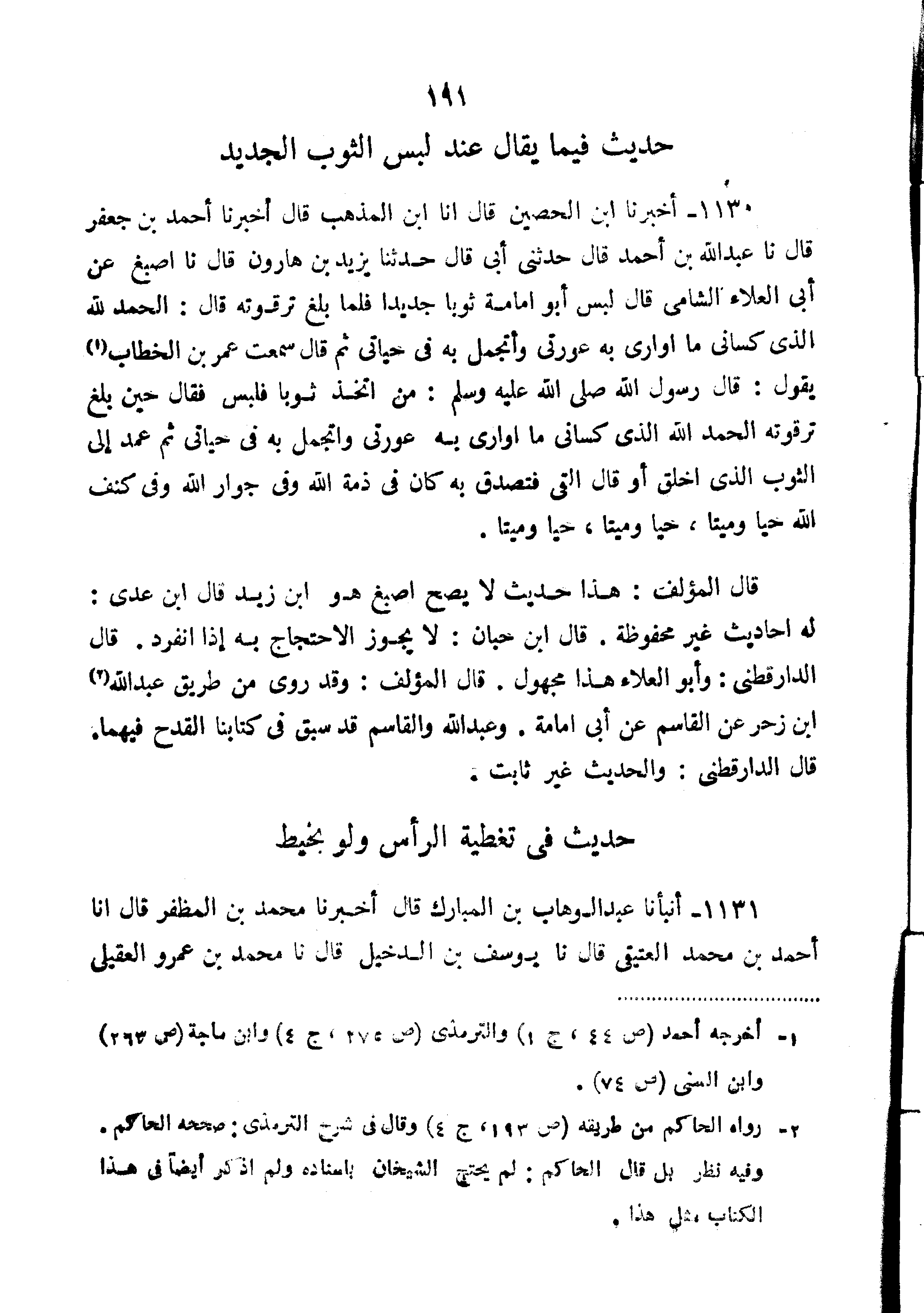 1130-أَخْبَرَنَا ابْنُ الْحُصَيْنِ قَالَ أَنَا ابْنُ الْمُذْهِبِ قَالَ أَخْبَرَنَا أَحْمَدُ بْنُ جَعْفَرٍ قَالَ نا عَبْدُ اللَّهِ بْنُ أَحْمَدَ قَالَ حَدَّثَنِي أَبِي قَالَ حَدَّثَنَا يَزِيدُ بْنُ هَارُونَ قَالَ نا أَصْبَغُ عَنْ أَبِي الْعَلاءِ الشَّامِيِّ قَالَ لَبِسَ أَبُو أُمَامَةَ ثَوْبًا جَدِيدًا فَلَمَّا بَلَغَ تُرْقُوَتَهُ قَالَ الْحَمْدُ لِلَّهِ الَّذِي كَسَانِي مَا أُوَارِي به بِهِ فِي حَيَاتِي ثُمَّ قَالَ سَمِعْتُ عُمَرَ بْنَ الْخَطَّابِ يَقُولُ قَالَ رَسُولُ اللَّهِ صَلَّى اللَّهُ عَلَيْهِ وَسَلَّمَ: "مَنِ اتَّخَذَ ثَوْبًا فَلَبِسَ فَقَالَ حِينَ بَلَغَ تَرْقُوَتَهُ الْحَمْدُ لِلَّهِ الَّذِي كَسَانِي مَا أواري به بِهِ فِي حَيَاتِي ثُمَّ عَمَدَ إِلَى الثَّوْبِ الَّذِي أَخْلَقَ أَوْ قَالَ أَلْقَى فَتَصَدَّقَ بِهِ كَانَ فِي ذِمَّةِ اللَّهِ وَفِي جِوَارِ اللَّهِ وَفِي كَنَفِ اللَّهِ حَيًّا وَمَيِّتًا حَيًّا وَمَيِّتًا حَيًّا وَمَيِّتًا".