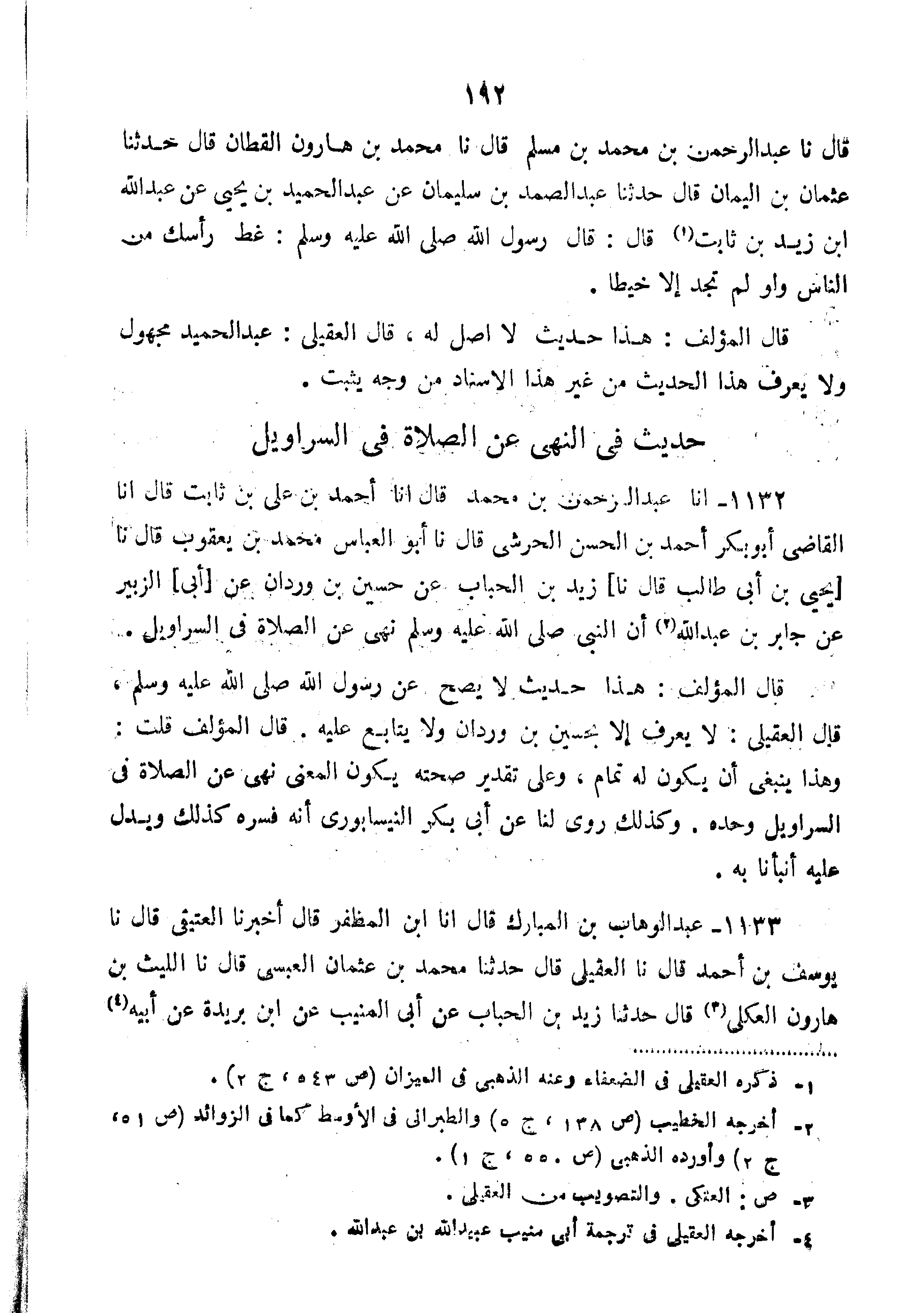 1132-أَنَا عَبْدُ الرَّحْمَنِ بْنُ مُحَمَّدٍ قَالَ أَنَا أَحْمَدُ بْنُ عَلِيِّ بْنِ ثَابِتٍ قَالَ أَنَا الْقَاضِي أَبُو بَكْرٍ أَحْمَدُ بْنُ الْحَسَنِ الْحَرَشِيُّ قَالَ نا أَبُو الْعَبَّاسِ مُحَمَّدُ بْنُ يَعْقُوبَ قَالَ نا يَحْيَى بْنِ أَبِي طَالِبٍ قَالَ نا زَيْدُ بْنُ الْحُبْابِ عَنْ حُسَيْنِ بْنِ وَرْدَانَ عَنْ أَبِي الزُّبَيْرِ عَنْ جَابِرِ بْنِ عَبْدِ اللَّهِ أَنّ النَّبِيَّ صَلَّى اللَّهُ عَلَيْهِ وَسَلَّمَ نَهَى عَنِ الصَّلاةِ فِي السَّرَاوِيلِ قال المؤلف: "هَذَا حديث لا يَصِحُّ عَنْ رَسُولِ اللَّهِ صَلَّى اللَّهُ عَلَيْهِ وَسَلَّمَ قَالَ العقيلي: "لا يعرف إلا بحسين بْن وردان ولا يتابع عليه".