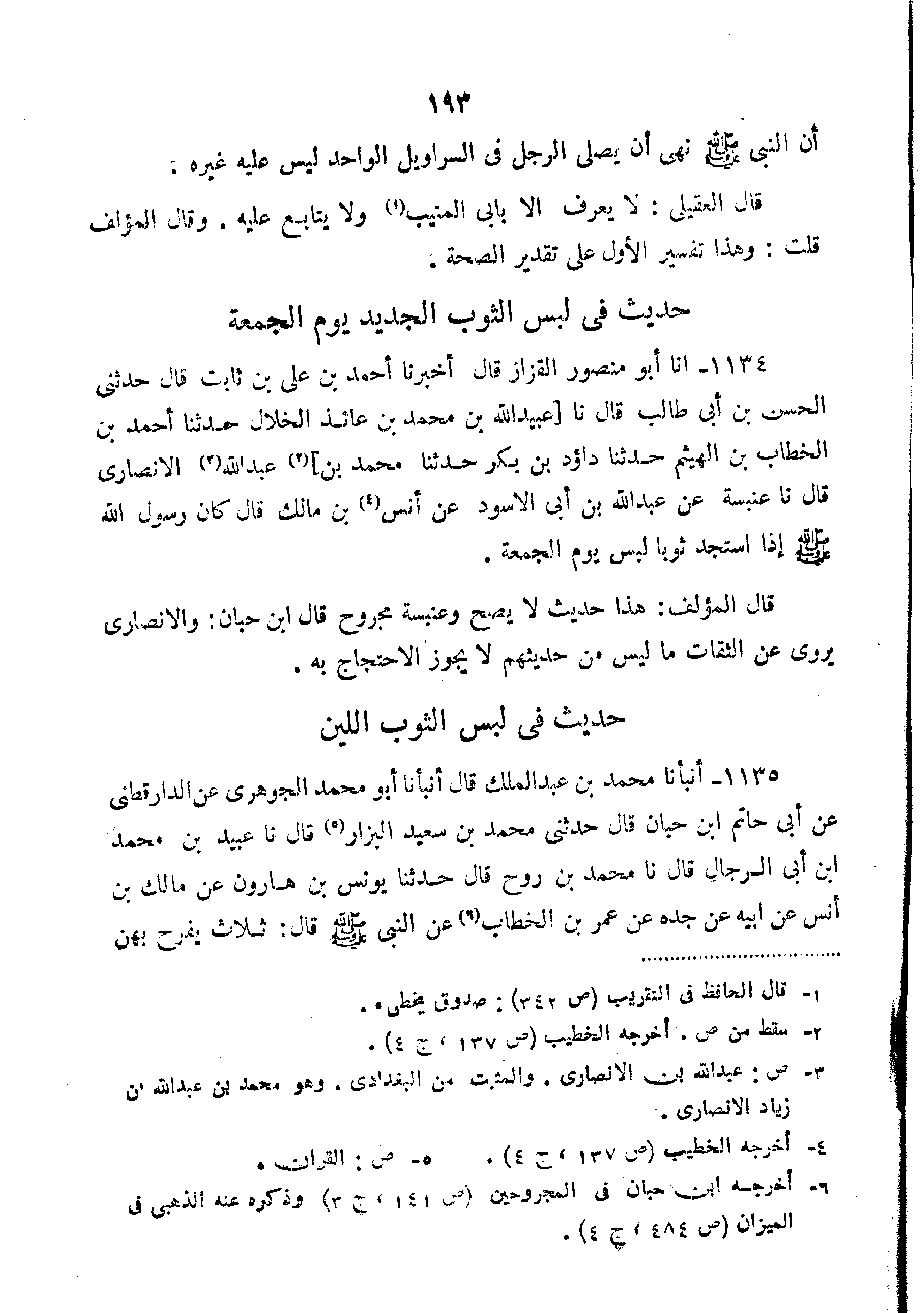 1134-أَنَا أَبُو مَنْصُورٍ الْقَزَّازُ قَالَ أَخْبَرَنَا أَحْمَدُ بْنُ عَلِيِّ بْنِ ثَابِتٍ قَالَ حَدَّثَنِي الْحَسَنُ بْنُ أَبِي طَالِبٍ قَالَ نا عُبَيْدُ اللَّهِ بْنُ مُحَمَّدِ بْنِ عَائِذٍ الْخَلالُ حَدَّثَنَا أَحْمَدُ بْنُ الْخَطَّابِ بْنُ الْهَيْثَمِ حَدَّثَنَا دَاؤُدُ بْنُ بَكْرٍ حَدَّثَنَا مُحَمَّدُ بْنُ عَبْدِ اللَّهِ الْأَنْصَارِيُّ قَالَ نا عِنْبِسَةُ عَنْ عَبْدِ اللَّهِ بْنِ أَبِي الأَسْوَدِ عَنْ أَنَسِ بْنِ مَالِكٍ قَالَ كَانَ رَسُولُ اللَّهِ صَلَّى اللَّهُ عَلَيْهِ وَسَلَّمَ إِذَا اسْتَجَدَّ ثَوْبًا لُبِسَ يَوْمَ الْجُمُعَةِ".