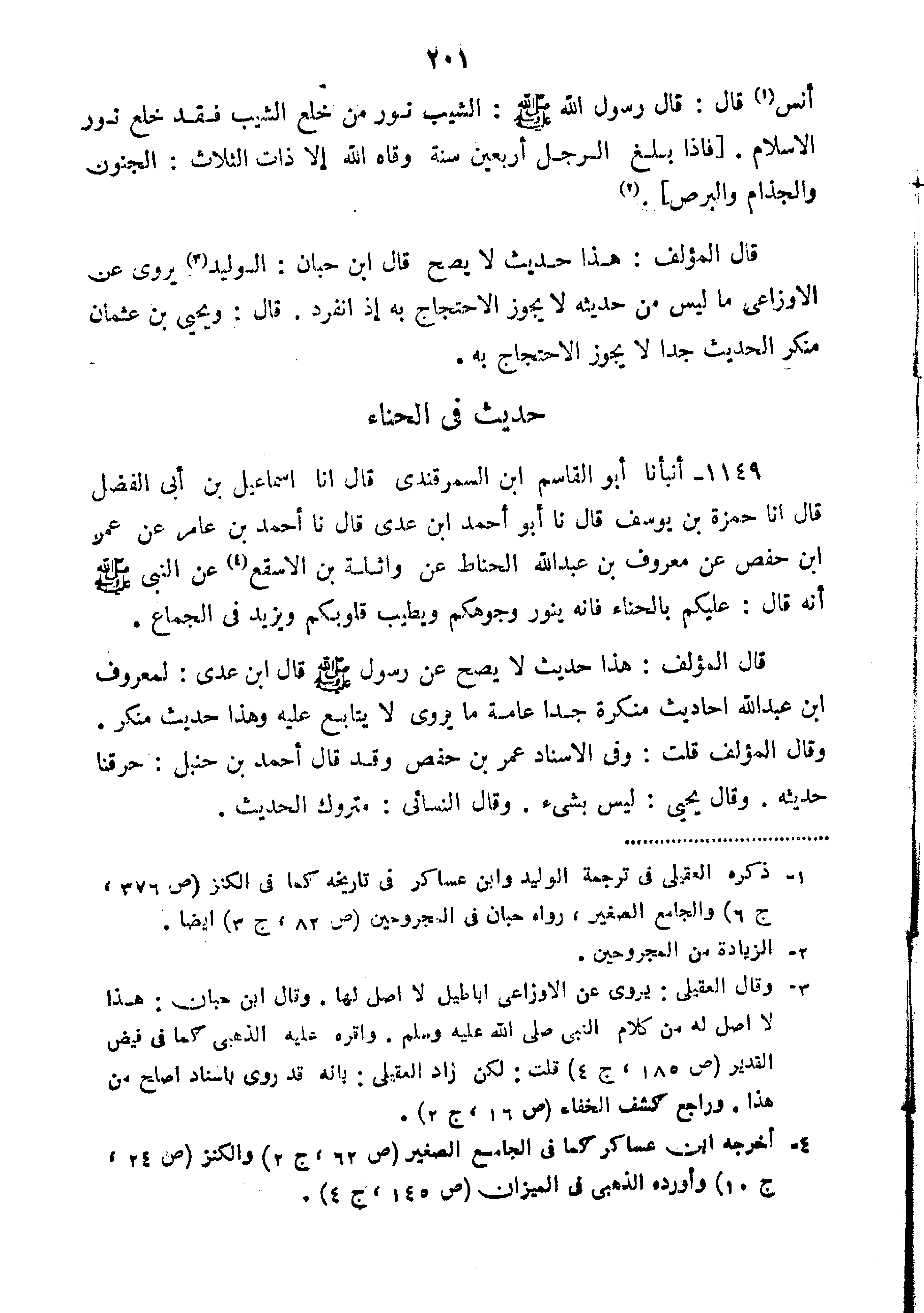 1149-أنبأنا أبو القاسم ابن السَمَرْقَنْدِيُّ قَالَ أَنَا إِسْمَاعِيلُ بْنُ أَبِي الْفَضْلِ قَالَ أَنَا حَمْزَةُ بْنُ يُوسُفَ قَالَ نا أَبُو أَحْمَدَ بْنُ عَدِيٍّ قَالَ نا أَحْمَدُ بْنُ عَامِرٍ عَنْ عُمَرَ ابن حَفْصٍ عَنْ مَعْرُوفِ بْنِ عَبْدِ اللَّهِ الْحَنَّاطِ عَنْ وَاثِلَةَ بْنِ الأَسْقَعِ عَنِ النَّبِيِّ صَلَّى اللَّهُ عَلَيْهِ وَسَلَّمَ أَنَّهُ قَالَ عَلَيْكُمْ بِالْحِنَّاءِ فَإِنَّهُ يُنَوِّرُ وُجُوهَكُمْ وَيُطَيِّبُ قُلُوبَكُمْ وَيُزِيدُ فِي الْجِمَاعِ".