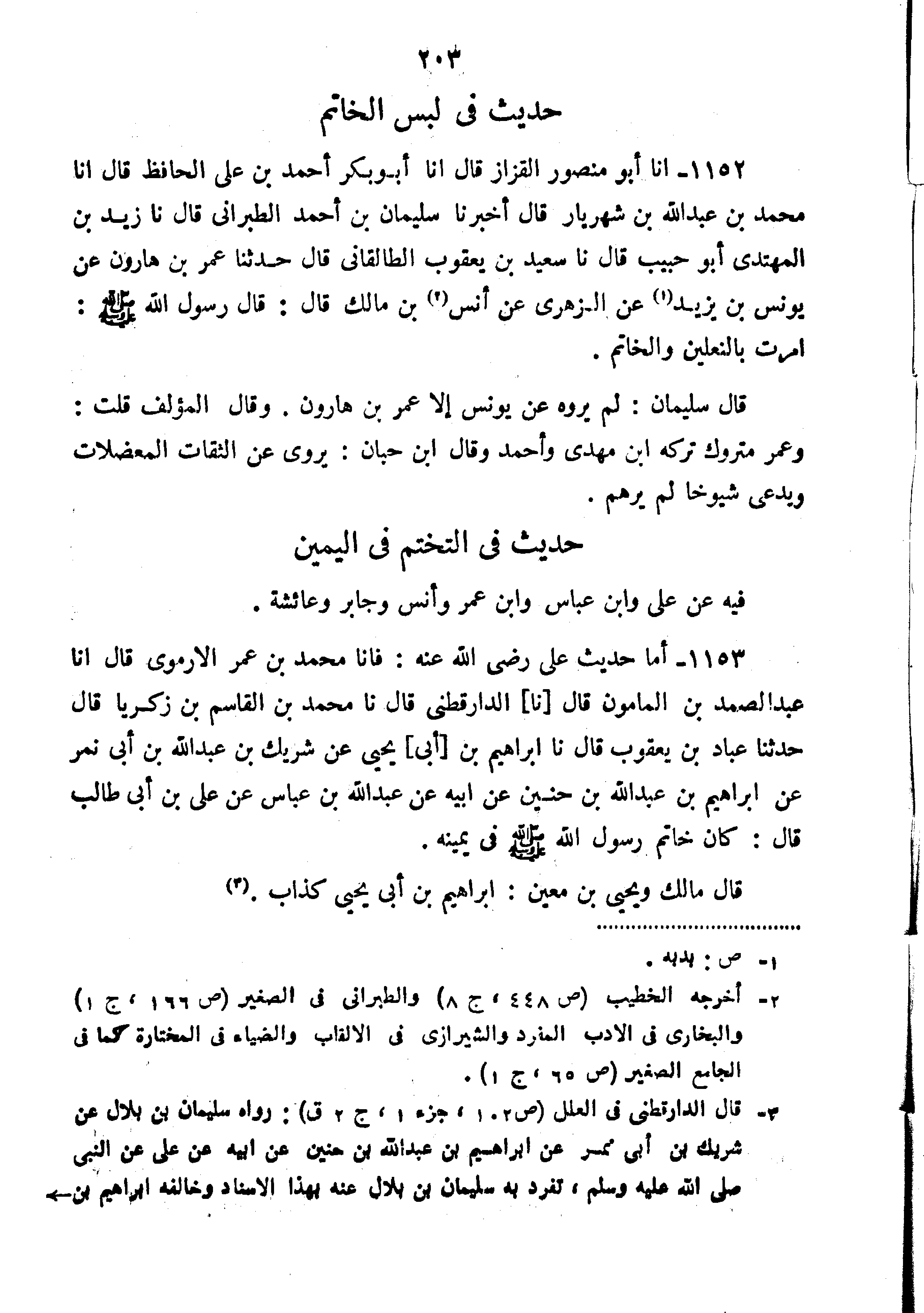 1153-أَمَّا حَدِيثُ عَلِيٍّ رَضِيَ اللَّهُ عَنْهُ فَأَنَا مُحَمَّدُ بْنُ عُمَرَ الأُرْمَوِيُّ قَالَ أَنَا عَبْدُ الصَّمَدِ بْنُ الْمَأْمُونِ قَالَ نا إِبْرَاهِيمُ بْنُ أَبِي يَحْيَى عَنْ شَرِيكِ بْنِ عَبْدِ اللَّهِ بْنِ أَبِي نَمِرٍ عَنْ إِبْرَاهِيمَ بْنِ عَبْدِ اللَّهِ بْنِ حُنَيْنٍ عَنْ أَبِيهِ عَنْ عَبْدِ اللَّهِ بْنِ عَبَّاسٍ عَنْ عَلِيِّ بْنِ أَبِي طَالِبٍ قَالَ كَانَ خَاتَمُ رَسُولِ اللَّهِ صَلَّى اللَّهُ عَلَيْهِ وَسَلَّمَ في يمينه قال مالك ويحيى بْن معين إِبْرَاهِيم بْن أَبِي يَحْيَى كذاب".