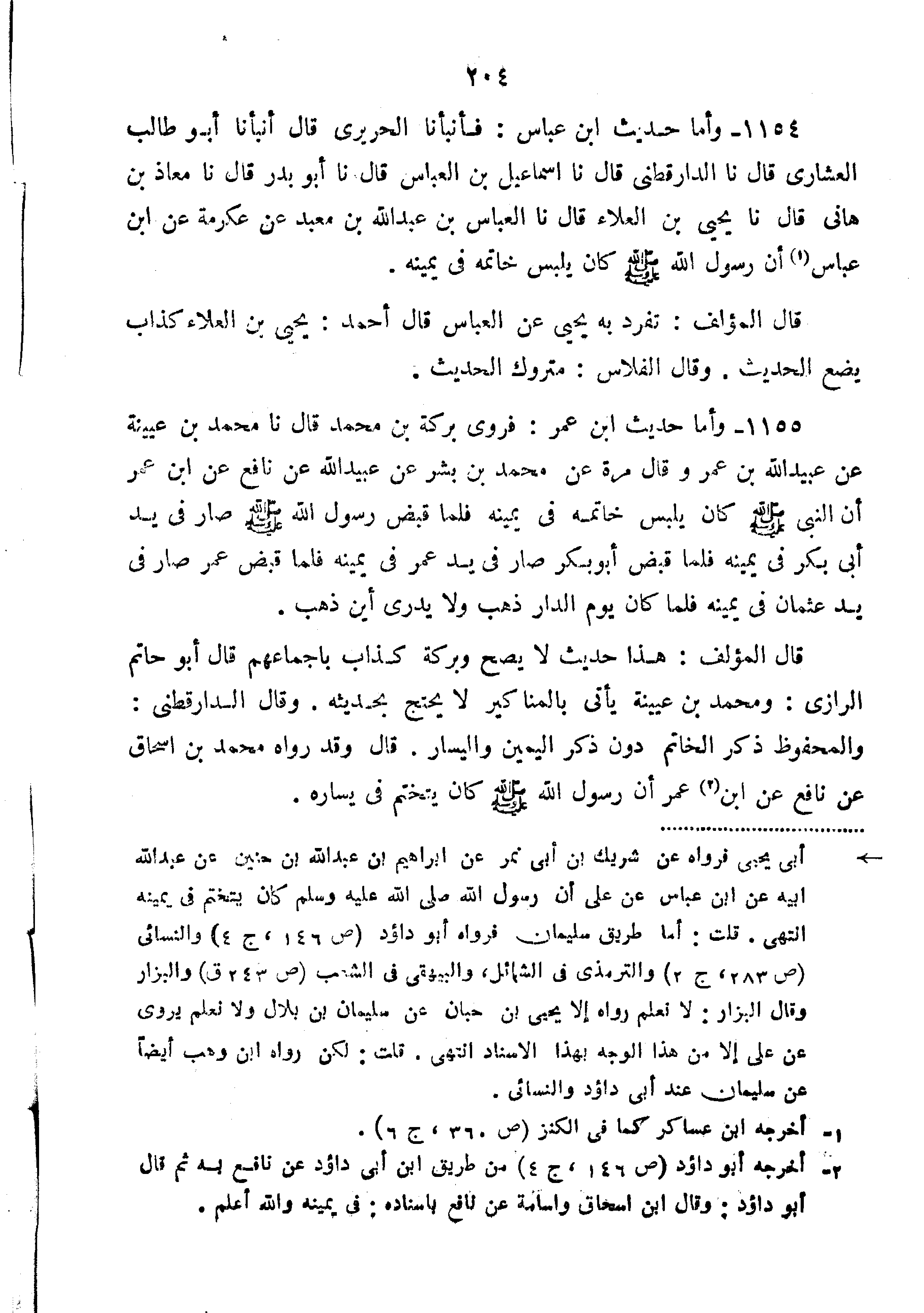 1154-وَأَمَّا حَدِيثُ ابْنِ عَبَّاسٍ فَأَنْبَأَنَا الْحَرِيرِيُّ قَالَ أَنْبَأَنَا أَبُو طَالِبٍ الْعُشَارِيِّ قَالَ نا الدَّارَقُطْنِيُّ قَالَ نا إِسْمَاعِيلُ بْنُ الْعَبَّاسِ قَالَ نا أَبُو بَدْرٍ قَالَ نا معاذ ابن هَانِي قَالَ نا يَحْيَى بْنُ الْعَلاءِ قَالَ نا الْعَبَّاسُ بْنُ عَبْدِ اللَّهِ بْنِ مَعْبَدٍ عَنْ عِكْرِمَةَ عَنِ ابْنِ عَبَّاسٍ أَنَّ رَسُولِ اللَّهِ صَلَّى اللَّهُ عَلَيْهِ وَسَلَّمَ كان يَلْبَسُ خَاتَمَهُ فِي يَمِينِهِ".