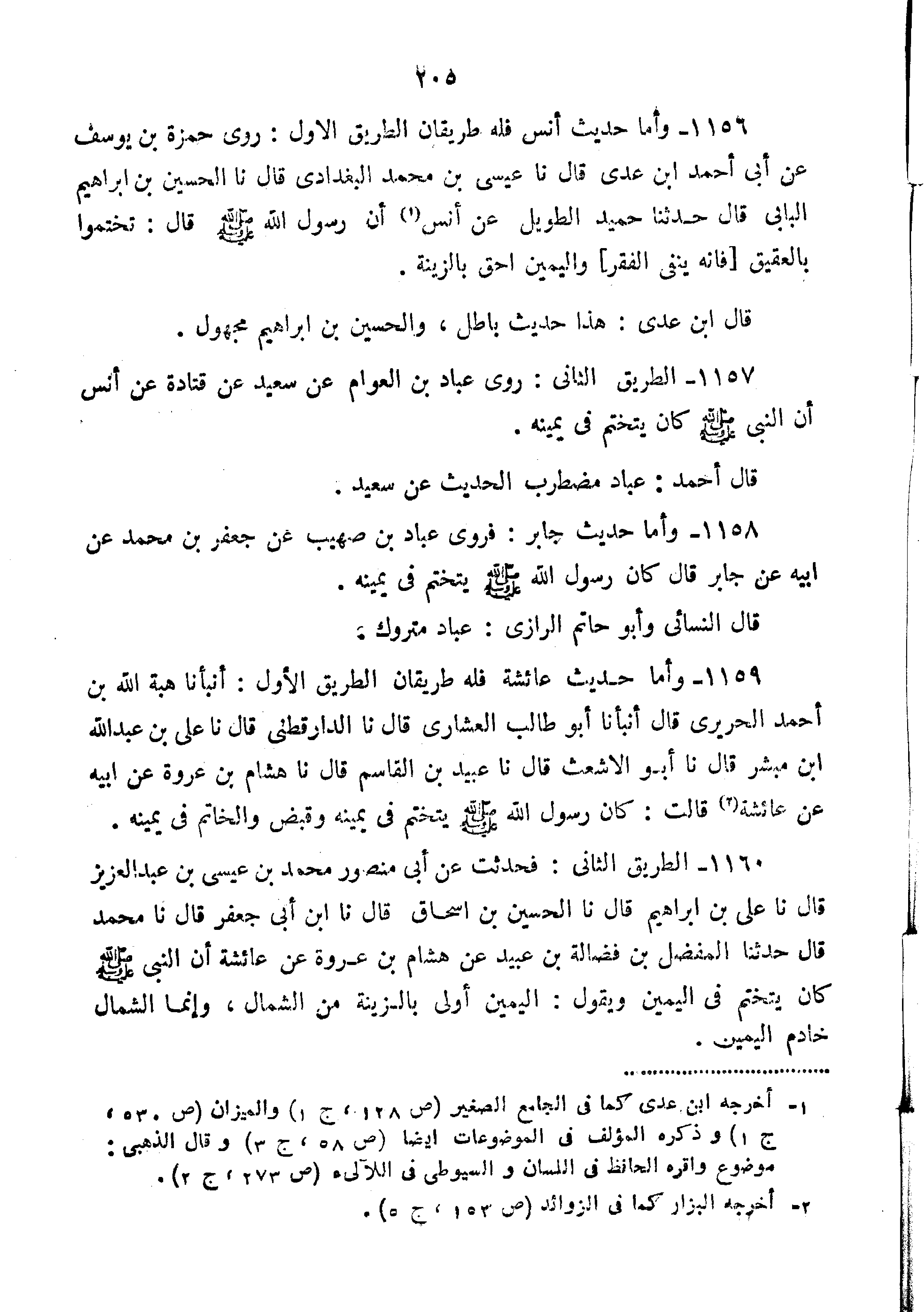 1156-وأما حديث يروي فَلَهُ طَرِيقَانِ الطَّرِيقُ الأَوَّلُ رَوَى حَمْزَةُ بْنُ يُوسُفَ عَنْ أَبِي أَحْمَدَ بْنُ عَدِيٍّ قَالَ نا عِيسَى بْنُ مُحَمَّدٍ الْبَغْدَادِيُّ قَالَ نا الْحُسَيْنُ بْنُ إِبْرَاهِيمَ الْبَابِيُّ قَالَ حَدَّثَنَا حُمَيْدٌ الطَّوِيلُ عَنْ أَنَسٍ أَنّ رَسُولَ اللَّهِ صَلَّى اللَّهُ عَلَيْهِ وَسَلَّمَ " قَالَ تَخَتَّمُوا بِالْعَقِيقِ فَإِنَّهُ يَنْفِي الْفَقْرَ وَالْيَمِينُ أَحَقُّ بِالزِّينَةِ".