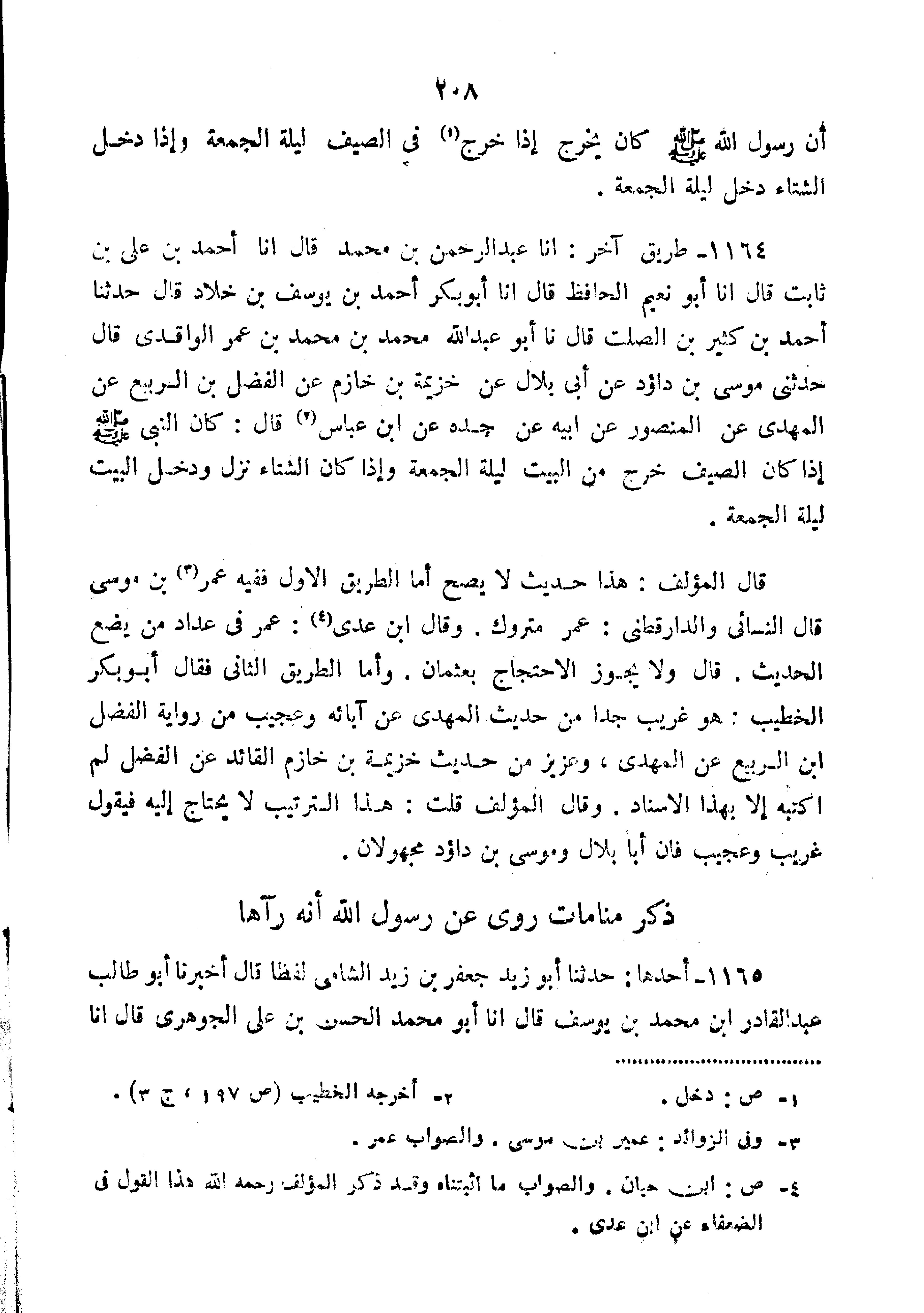 1164- طَرِيقٌ آخَرُ أَنَا عَبْدُ الرَّحْمَنِ بْنُ مُحَمَّدٍ قَالَ أَنَا أحمد بن علي بن ثاتب قَالَ أَنَا أَبُو نُعَيْمٍ الْحَافِظُ قَالَ أَنَا أَبُو بَكْرٍ أَحْمَدُ بْنُ يُوسُفَ بْنِ خَلادٍ قَالَ حَدَّثَنَا أَحْمَدُ بْنُ كَثِيرِ بْنِ الصَّلْتِ قَالَ نا أَبُو عَبْدِ اللَّهِ مُحَمَّدُ بْنُ مُحَمَّدِ بْنِ عُمَرَ الْوَاقِدِيُّ قَالَ حَدَّثَنِي مُوسَى بْنُ دَاؤُدَ عَنْ أَبِي بِلالٍ عَنْ خُزَيْمَةَ بْنِ خَازِمٍ عَنِ الفضل ابن الرَّبِيعِ عَنِ الْمَهْدِيِّ عَنِ الْمَنْصُورِ عَنْ أَبِيهِ عَنْ جَدِّهِ عَنْ ابْنِ عَبَّاسٍ قَالَ كَانَ النَّبِيُّ صَلَّى اللَّهُ عَلَيْهِ وَسَلَّمَ إِذَا كَانَ الصَّيْفُ خَرَجَ مِنَ الْبَيْتِ لَيْلَةَ الْجُمُعَةِ وَإِذَا كَانَ الشِّتَاءُ نَزَلَ وَدَخَلَ الْبَيْتَ لَيْلَةَ الْجُمُعَةِ".