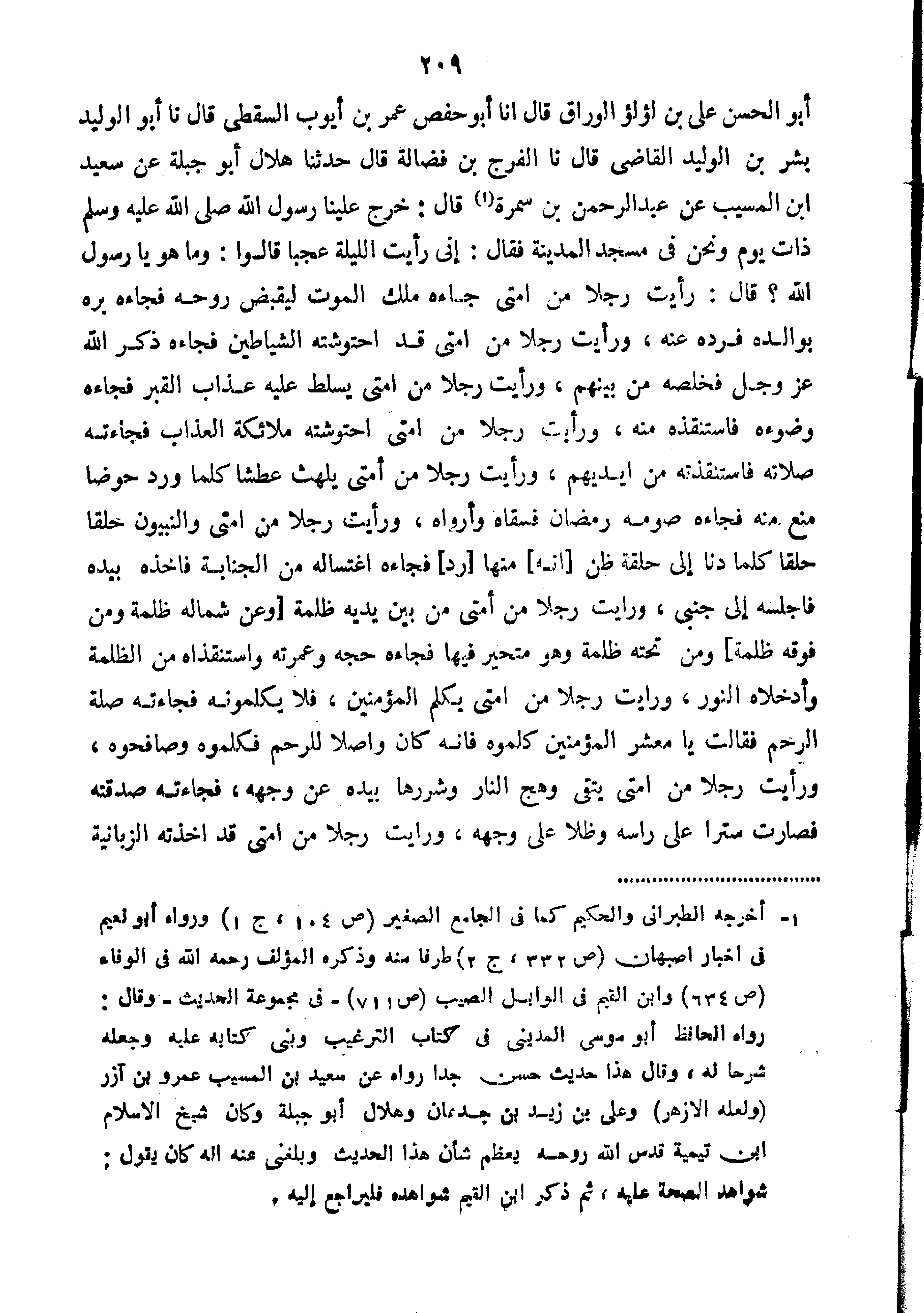 أَبُو الْحَسَنِ عَلِيُّ بْنُ لُؤْلُؤٍ الْوَرَّاقُ قَالَ أَنَا أَبُو حَفْصٍ عُمَرُ بْنُ أَيُّوبَ السَّقْطِيُّ قَالَ نا أَبُو الْوَلِيدِ بِشْرُ بْنُ الوليد القاضب قَالَ نا الْفَرَجُ بْنُ فَضَالَةَ قَالَ حَدَّثَنَا هِلالُ أَبُو جَبَلَةَ عَنْ سَعِيدِ بْنِ الْمُسَيِّبِ عَنْ عَبْدِ الرَّحْمَنِ بْنِ سَمُرَةَ قَالَ خَرَجَ عَلَيْنَا رَسُولُ اللَّهِ صَلَّى اللَّهُ عَلَيْهِ وَسَلَّمَ ذَاتَ يَوْمٍ وَنَحْنُ فِي مَسْجِدِ الْمَدِينَةِ فَقَالَ إِنِّي رَأَيْتُ اللَّيْلَةَ عَجَبًا قَالُوا وَمَا هُوَ يَا رَسُولَ اللَّهِ قَالَ رَأَيْتُ رَجُلا مِنْ أُمَّتِي جَاءَهُ مَلَكُ الْمَوْتِ لِيَقْبِضَ رُوحَهُ فَجَاءَهُ بِرُّهُ بِوَالِدِهِ فَرَدَّهُ عَنْهُ وَرَأَيْتُ رَجُلا مِنْ أُمَّتِي قَدِ احْتَوَشَتْهُ الشَّيَاطِينُ فَجَاءَهُ ذِكْرُ اللَّهِ عَزَّ وَجَلَّ فَخَلَّصَهُ مِنْ بَيْنِهُمْ وَرَأَيْتُ رَجُلا مِنْ أُمَّتِي يُسَلَّطُ عليه عذاب القبر فجاءه وضوءه فَاسْتَنْقَذَهُ مِنْهُ وَرَأَيْتُ رَجُلا مِنْ أُمَّتِي احْتَوَشَتْهُ مَلائِكَةُ الْعَذَابِ فَجَاءَتْهُ صَلاتُهُ فَاسْتَنْقَذَتْهُ مِنْ أَيْدِيهِمْ وَرَأَيْتُ رَجُلا مِنْ أُمَّتِي يَلْهَثُ عَطَشًا كُلَّمَا وَرَدَ حَوْضًا مُنِعَ مِنْهُ فَجَاءَهُ صَوْمُهُ رَمَضَانَ فَسَقَاهُ وَأَرْوَاهُ وَرَأَيْتُ رَجُلا مِنْ أُمَّتِي وَالنَّبِيُّونَ حِلَقًا حِلَقًا كُلَّمَا دَنَا إِلَى حَلْقَةٍ ظَنَّ أَنَّهُ مِنْهَا رُدَّ فَجَاءَهُ اغْتِسَالُهُ مِنَ الْجَنَابَةِ فَأَخَذَهُ بِيَدِهِ فَأَجْلَسَهُ إِلَى جَنْبِي وَرَأَيْتُ رَجُلا مِنْ أُمَّتِي مِنْ بَيْنِ يَدَيْهِ ظُلْمَةٌ وَعَنْ شِمَالِهِ ظُلْمَةٌ من فَوْقِهِ ظُلْمَةٌ وَمَنْ تَحْتِهِ ظُلْمَةٌ وَهُوَ مُتَحَيِّرٌ فِيهَا فَجَاءَهُ حَجُّهُ وَعُمْرَتُهُ وَاسْتَنْقَذَاهُ مِنَ الظُّلْمَةِ وَأَدْخَلاهُ النُّورَ وَرَأَيْتُ رَجُلا مِنْ أُمَّتِي يُكَلِّمُ الْمُؤْمِنِينَ فَلا يُكَلِّمُونَهُ فَجَاءَتْهُ صِلَةُ الرَّحِمِ فَقَالَتْ يَا مَعْشَرَ الْمُؤْمِنِينَ كَلِّمُوهُ فَإِنَّهُ كَانَ وَاصِلا لِلرَّحِمِ فَكَلَّمُوهُ وَصَافَحُوهُ وَرَأَيْتُ رَجُلا مِنْ أُمَّتِي يَتَّقِي وَهَجَ النَّارِ وَشَرَرَهَا بِيَدِهِ عَنْ وَجْهِهِ فَجَاءَتْهُ صَدَقَتُهُ فَصَارَتْ سِتْرًا عَلَى رَأْسِهِ وَظِلا عَلَى وَجْهِهِ وَرَأَيْتُ رَجُلا مِنْ أُمَّتِي قَدْ أَخَذَتْهُ الزَّبَانِيَةُ