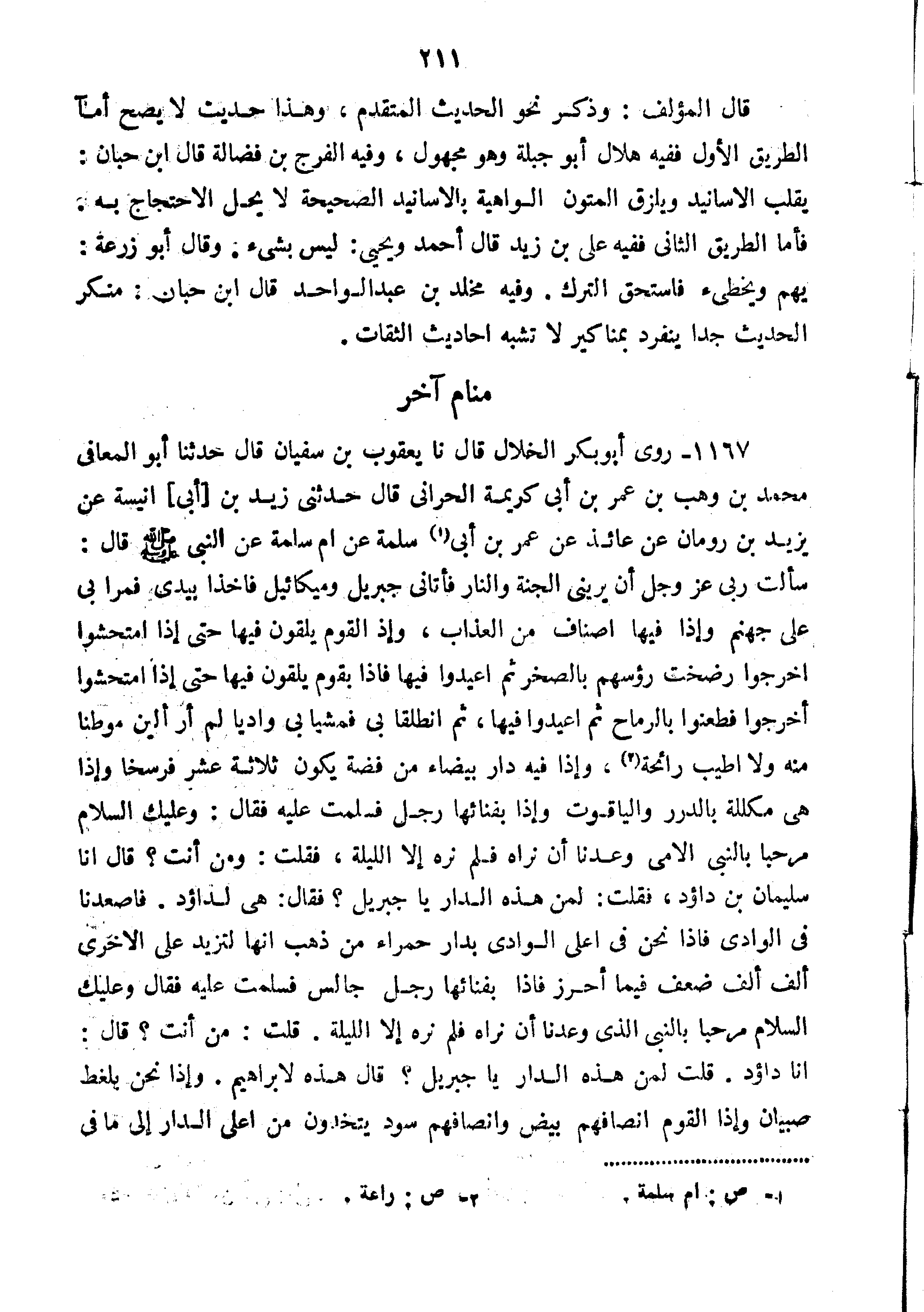 1167-رَوَى أَبُو بَكْرٍ الْخَلالُ قَالَ نَا يَعْقُوبُ بْنُ سُفْيَانَ قَالَ حَدَّثَنَا أَبُو الْمُعَافِيِّ مُحَمَّدُ بْنُ وَهْبِ بْنِ عُمَرَ بْنِ أَبِي كَرِيمَةَ الْحَرَّانِيُّ قَالَ حَدَّثَنِي زَيْدُ بْنُ أَبِي أُنَيْسَةَ عَنْ يَزِيدَ بْنِ رُومَانَ عَنْ عَائِذٍ عَنْ عُمَرَ بْنِ أَبِي سَلَمَةَ عَنْ أُمِّ سَلَمَةَ عَنِ النَّبِيِّ صَلَّى اللَّهُ عَلَيْهِ وَسَلَّمَ قَالَ سَأَلْتُ رَبِّي عَزَّ وَجَلَّ أَنْ يُرِيَنِي الْجَنَّةَ وَالنَّارَ فَأَتَانِي جِبْرِيلُ وَمِيكَائِيلُ فَأَخَذَا بِيَدِي فَمَرَّا بِي عَلَى جَهَنَّمَ وَإِذَا فِيهَا أَصْنَافٌ مِنَ الْعَذَابِ وَإِذِ الْقَوْمُ يُلْقَوْنَ فِيهَا حَتَّى إِذَا امْتُحِشُوا أُخْرِجُوا رُضِخَتْ رؤوسهم بِالصَّخْرِ ثُمَّ أَعِيدُوا فِيهَا فَإِذَا بقوم يلقون حتى إذا امتحشو أُخْرِجُوا فَطُعِنُوا بِالرِّمَاحِ ثُمَّ أَعِيدُوا فِيهَا ثُمَّ انْطَلَقَا بِي فَمَشِيَا بِي وَادِيًا لَمْ أَرَ أَلْيَنَ مَوْطِنًا مِنْهُ وَلا أَطْيَبَ رَائِحَةً وَإِذَا فِيهِ دَارٌ بَيْضَاءُ مِنْ فِضَّةٍ يُكَوِّنُ ثَلاثَةَ عَشَرَ فَرْسَخًا وَإِذَا هِيَ مُكَلَّلَةٌ بِالدُّرَرِ وَالْيَاقُوتِ وَإِذَا بِفِنَائِهَا رَجُلٌ فَسَلَّمْتُ عَلَيْهِ فَقَالَ وَعَلَيْكَ السَّلامُ مَرْحَبًا بِالنَّبِيِّ الأُمِّيِّ وُعِدْنَا أَنْ نَرَاهُ فَلَمْ نَرَهُ إِلا اللَّيْلَةَ فَقُلْتُ وَمَنْ أنت قال أنا سليمان ابن داؤد فَقُلْتُ لِمَنْ هَذِهِ الدَّارُ يَا جبريل فقال هي لداؤد فأصعدتنا فِي الْوَادِي فَإِذَا نَحْنُ فِي أَعْلَى الْوَادِي بِدَارٍ حَمْرَاءَ مِنْ ذَهَبٍ إِنَّهَا تَزِيدُ عَلَى الأُخْرَى أَلْفَ أَلْفِ ضِعْفٍ فِيمَا أَحْرَزَ فإذا بفنائها رجل جالس فسملت عَلَيْهِ فَقَالَ وَعَلَيْكَ السَّلامُ مَرْحَبًا بِالنَّبِيِّ الَّذِي وُعِدْنَا أَنْ نَرَاهُ فلم نراه إِلا اللَّيْلَةَ قُلْتُ مَنْ أَنْتَ قال أنا داؤد قُلْتُ لِمَنْ هَذِهِ الدَّارُ يَا جِبْرِيلُ قَالَ هَذِهِ لإِبْرَاهِيمَ وَإِذَا نَحْنُ بِلَغَطِ صِبْيَانٍ وَإِذَا الْقَوْمُ أنصافهم وعثمان وَأَنْصَافُهُمْ سُودٌ يَتَّخِذُونَ مِنْ أَعْلَى الدَّارِ إِلَى مَا فِي