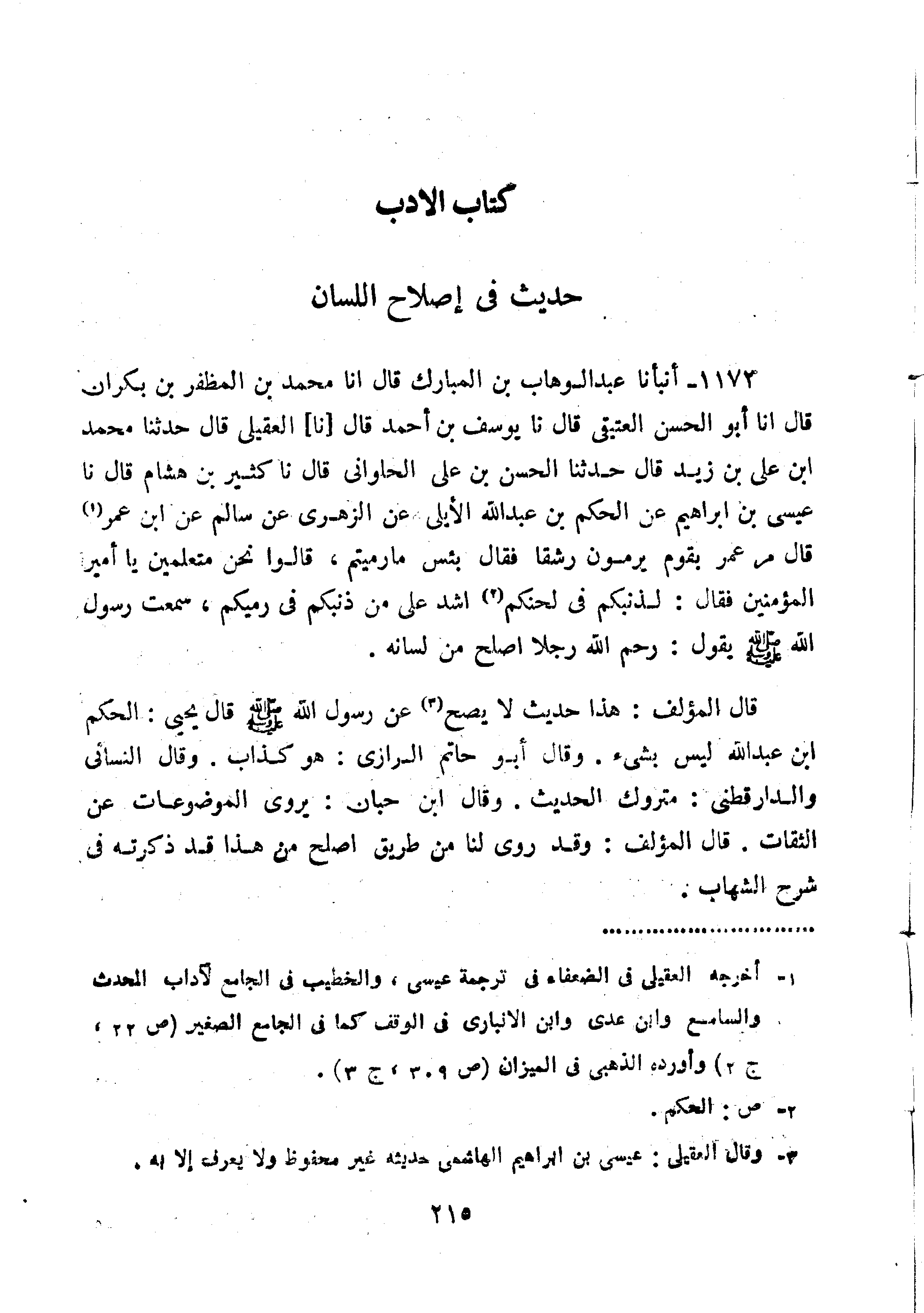 1172-أَنْبَأَنَا عَبْدُ الْوَهَّابِ بْنُ الْمُبَارَكِ قَالَ أَنَا مُحَمَّدُ بْنُ الْمُظَفَّرِ بْنِ بَكْرَانَ قَالَ أَنَا أَبُو الْحَسَنِ الْعُتَيْقِيُّ قَالَ نا يُوسُفُ بْنُ أَحْمَدَ قَالَ نا الْعَقِيلِيُّ قَالَ حَدَّثَنَا مُحَمَّدُ بْنُ عَلِيِّ بْنِ زَيْدٍ قَالَ حَدَّثَنَا الْحَسَنُ بْنُ عَلِيٍّ الْحُلْوَانِيُّ قَالَ نا كَثِيرُ بْنُ هِشَامٍ قَالَ نا عِيسَى بْنُ إِبْرَاهِيمَ عَنِ الْحَكَمِ بْنِ عَبْدِ اللَّهِ الأَيْلِيِّ عَنِ الزُّهْرِيِّ عَنْ سَالِمٍ عَنْ ابْنِ عُمَرَ قَالَ مَرَّ عُمَرُ بِقَوْمٍ يَرْمُونَ رَشْقًا فَقَالَ بِئْسَ مَا رَمَيْتُمْ قَالُوا نَحْنُ مُتَعَلِّمِينَ يَا أَمِيرَ الْمُؤْمِنِينَ فَقَالَ لَذَنْبُكُمْ فِي لَحْنِكُمْ أَشَدُّ عَلَيَّ مِنْ ذَنْبِكُمْ فِي رَمْيِكُمْ سَمِعْتُ رَسُولَ اللَّهِ صَلَّى اللَّهُ عَلَيْهِ وَسَلَّمَ يقول رحم رَجُلا أَصْلَحَ مِنْ لِسَانِهِ".