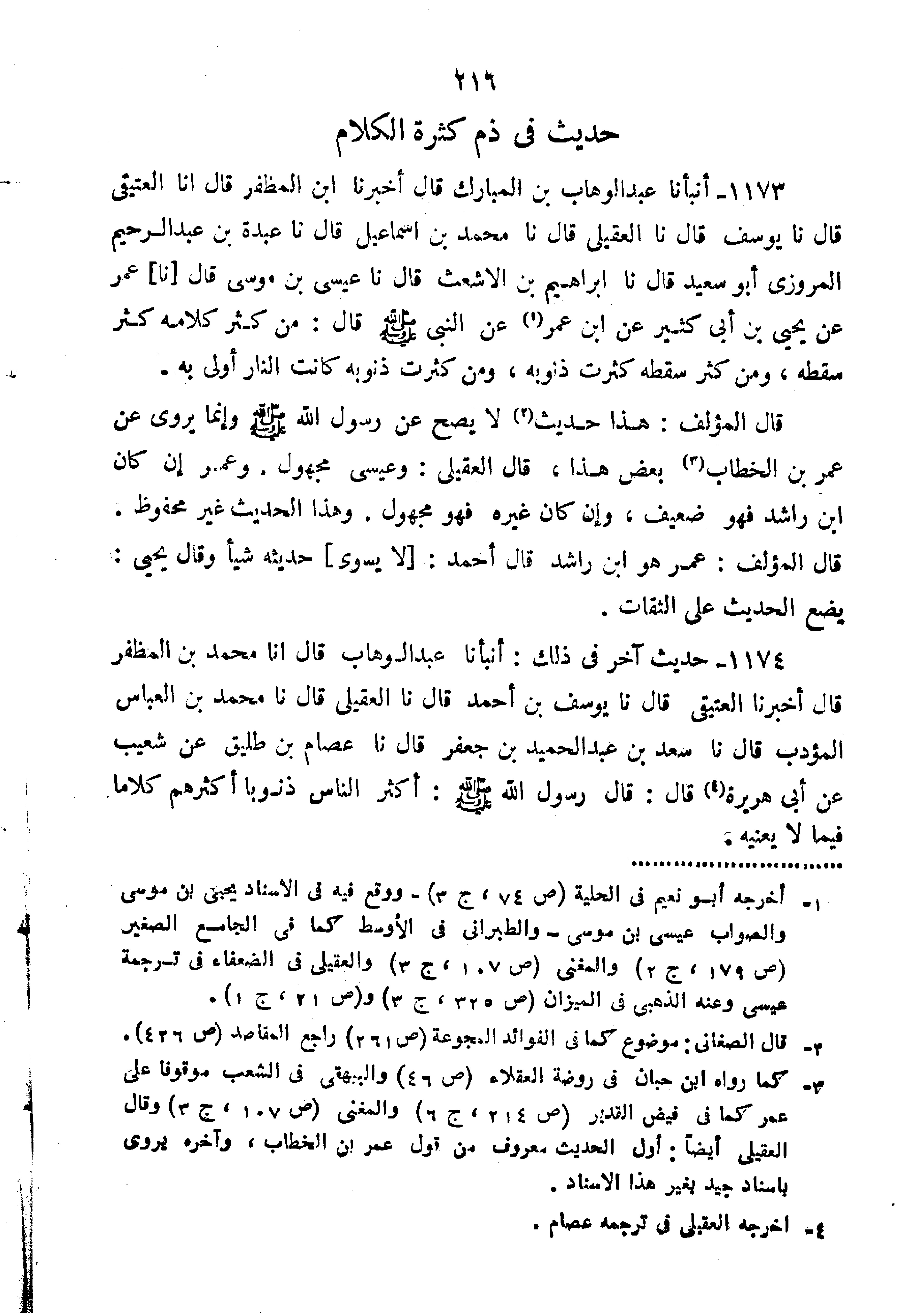 1174-حَدِيثٌ آخَرُ فِي ذَلِكَ أَنْبَأَنَا عَبْدُ الْوَهَّابِ قَالَ أنا مُحَمَّدُ بْنُ الْمُظَفَّرِ قَالَ أَخْبَرَنَا الْعُتَيْقِيُّ قَالَ نا يُوسُفُ بْنُ أَحْمَدَ قَالَ الْعَقِيلِيُّ: "قَالَ نا مُحَمَّدُ بْنُ العباس المؤدب قَالَ نا سَعِيدُ بْنُ عَبْدِ الْحَمِيدِ بْنِ جَعْفَرٍ قَالَ نا عِصَامُ بْنُ طُلَيْقٍ عَنْ شُعَيْبٍ عَنْ أَبِي هُرَيْرَةَ قَالَ: قَالَ رَسُولِ اللَّهِ صَلَّى اللَّهُ عَلَيْهِ وَسَلَّمَ: "أَكْثَرُ النَّاسِ ذَنُوبًا أَكْثَرُهُمْ كَلامًا فِيمَا لا يَعْنِيهِ".