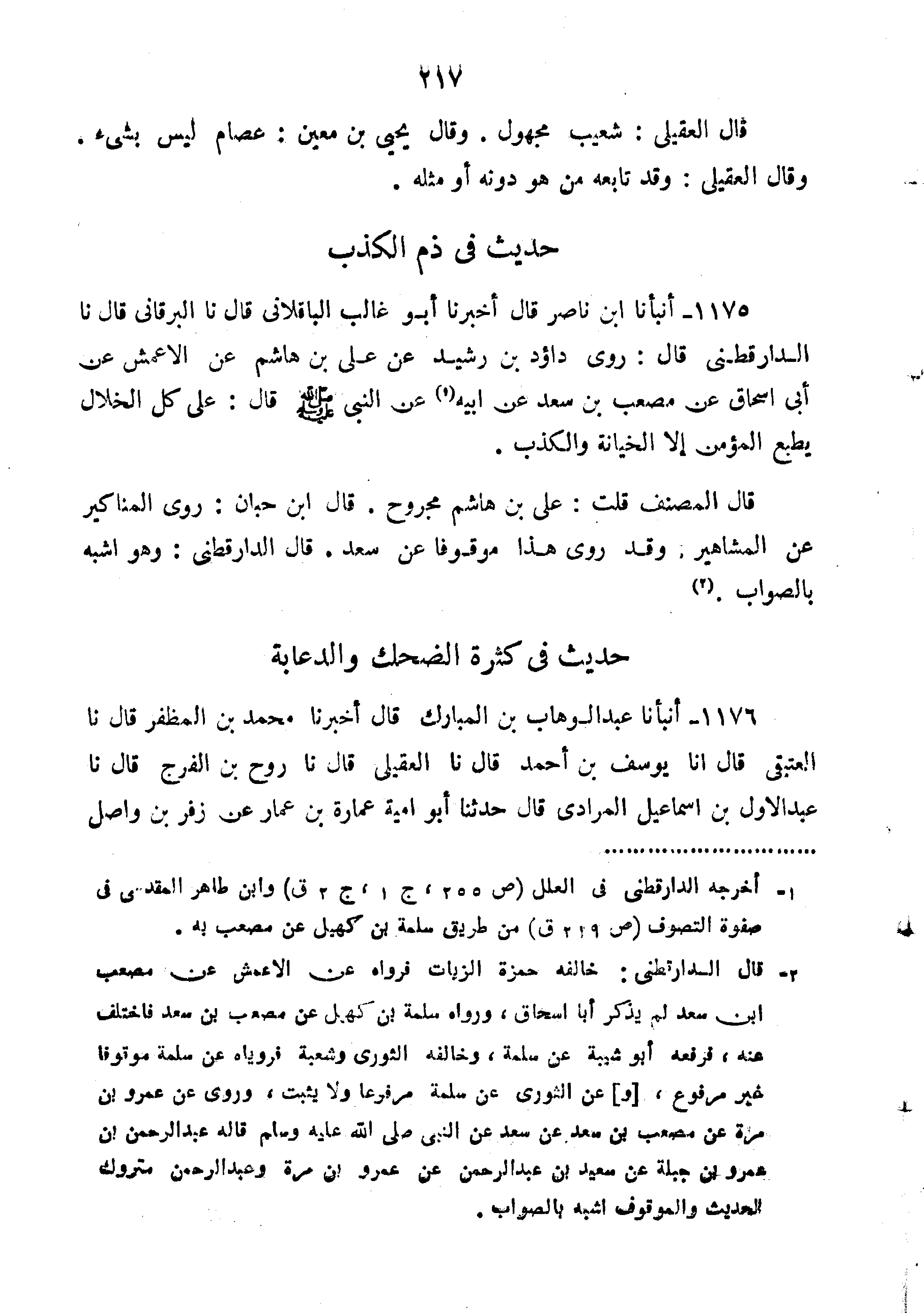 1175-أَنْبَأَنَا ابْنُ نَاصِرٍ قَالَ أَخْبَرَنَا أَبُو غَالِبٍ الْبَاقِلَّانِيُّ قَالَ نا الْبَرْقَانِيُّ قَالَ نا الدَّارَقُطْنِيُّ قَالَ رَوَى دَاؤُدُ بْنُ رُشَيْدٍ عَنْ عَلِيِّ بْنِ هَاشِمٍ عَنِ الْأَعْمَشِ عَنْ أَبِي إِسْحَاقَ عَنْ مُصْعَبِ بْنِ سَعْدٍ عَنْ أَبِيهِ عَنِ النَّبِيِّ ص قال على كل الخلال يطيع الْمُؤْمِنُ إِلا الْخِيَانَةَ وَالْكَذِبَ".