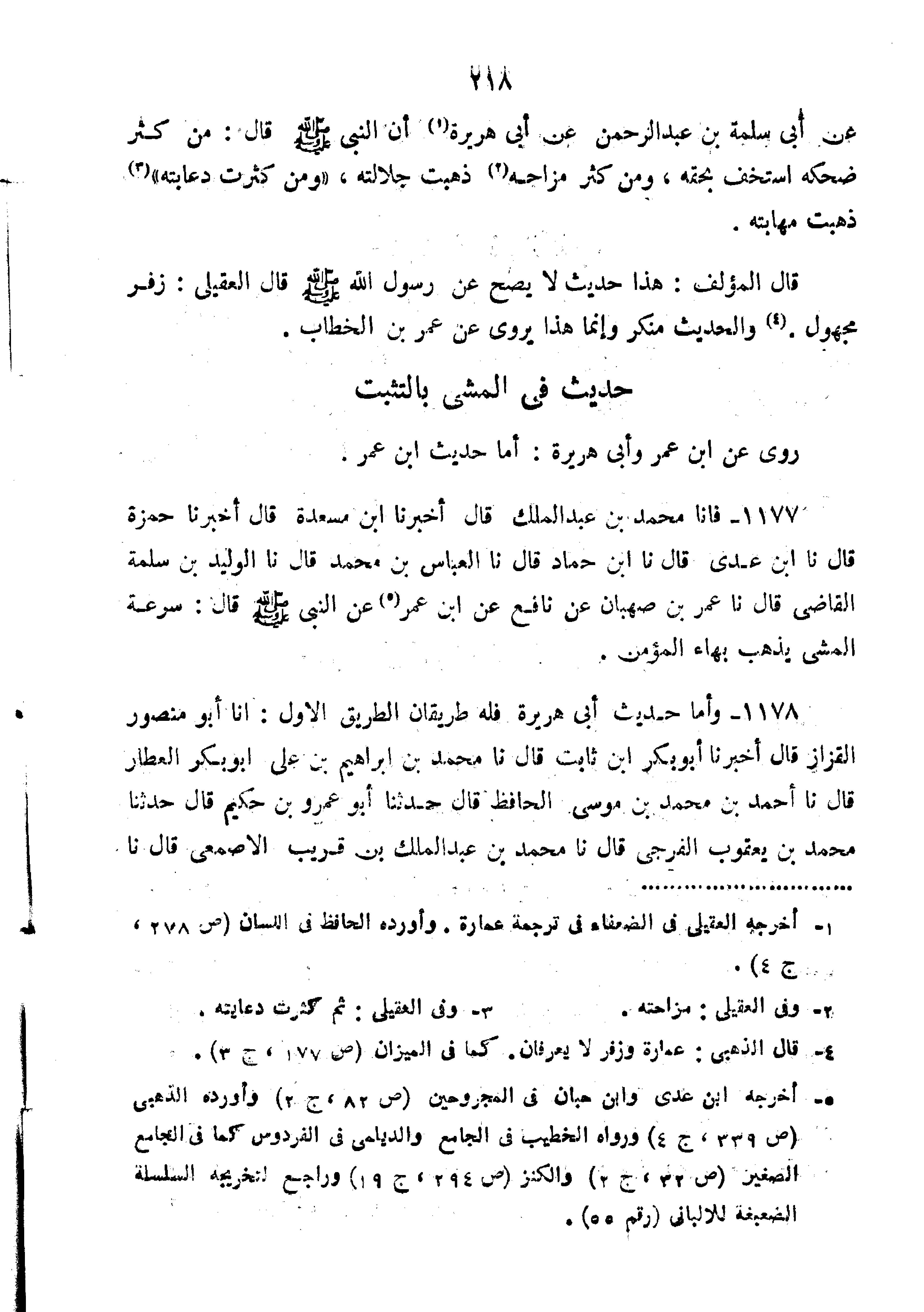 1177-فَأَنَا مُحَمَّدُ بْنُ عَبْدِ الْمَلِكِ قَالَ أَخْبَرَنَا ابْنُ مَسْعَدَةَ قَالَ أخبرنا حمزة قَالَ نَا بْنُ عَدِيٍّ قَالَ نا ابْنُ حَمَّادٍ قَالَ نا الْعَبَّاسُ بْنُ مُحَمَّدٍ قَالَ نا الْوَلِيدُ بْنُ سَلَمَةَ الْقَاضِي قَالَ نا عُمَرُ بْنُ صَهْبَانَ عَنْ نَافِعٍ عَنِ ابْنِ عُمَرَ عَنِ النَّبِيَّ صَلَّى اللَّهُ عَلَيْهِ وَسَلَّمَ قال "سرعة المشي يذهب بَهَاءَ الْمُؤْمِنِ".