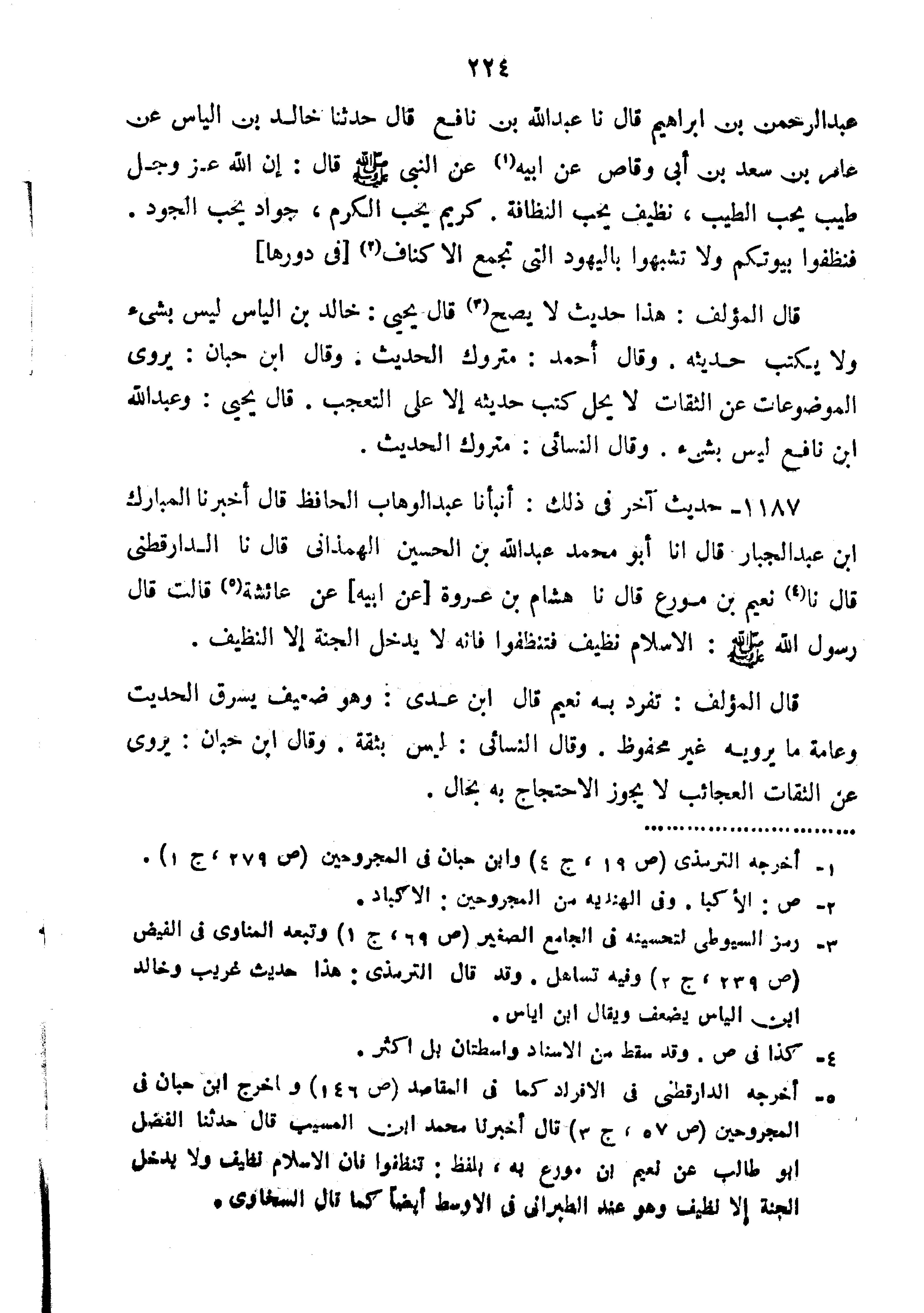عَبْدُ الرَّحْمَنِ بْنُ إِبْرَاهِيمَ قَالَ نا عَبْدُ اللَّهِ بْنُ نَافِعٍ قال حدثنا خالبد بْنُ إِلْيَاسَ عَنْ عَامِرِ بْنِ سَعْدِ بْنِ أَبِي وَقَّاصِ عَنْ أَبِيهِ عَنِ النَّبِيِّ صَلَّى اللَّهُ عَلَيْهِ وَسَلَّمَ قَالَ "إِنَّ اللَّهَ عَزَّ وَجَلَّ طَيِّبٌ يُحِبُّ الطَّيِّبَ نَظِيفٌ يُحِبُّ النَّظَافَةَ كَرِيمٌ يُحِبُّ الْكَرَمَ جَوَادٌ يُحِبُّ الْجُودَ فَنَظِّفُوا بُيُوتَكُمْ وَلا تَشَبَّهُوا بِالْيَهُودِ الَّتِي تَجْمَعُ الأَكْنَافَ فِي دُورِهَا".