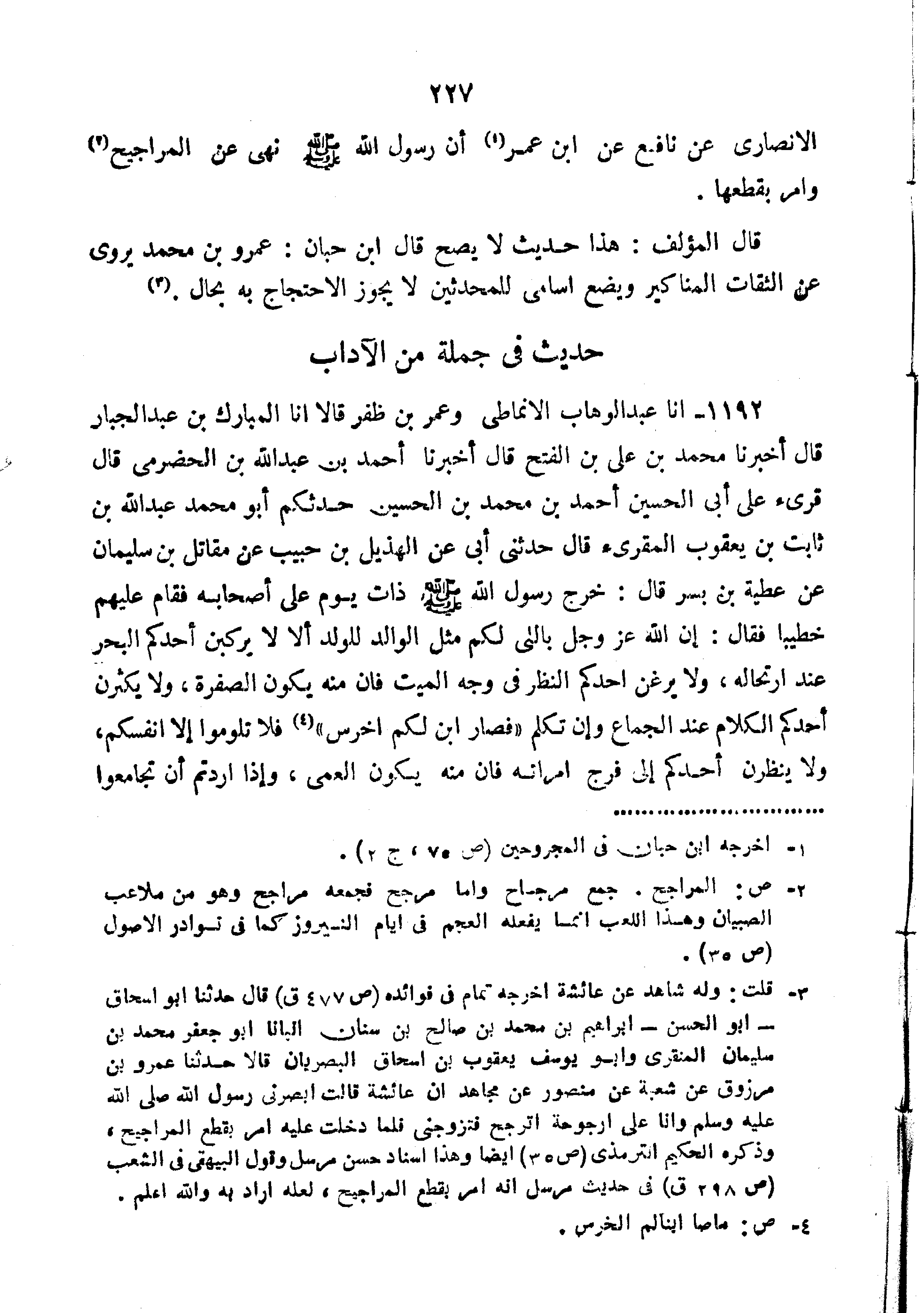 الأَنْصَارِيِّ عَنْ نَافِعٍ عَنِ ابْنِ عُمَرَ أَنّ رَسُولَ اللَّهِ صَلَّى اللَّهُ عَلَيْهِ وَسَلَّمَ نَهَى عَنْ الْمَرَاجِيحِ وَأَمَرَ بِقَطْعِهَا".