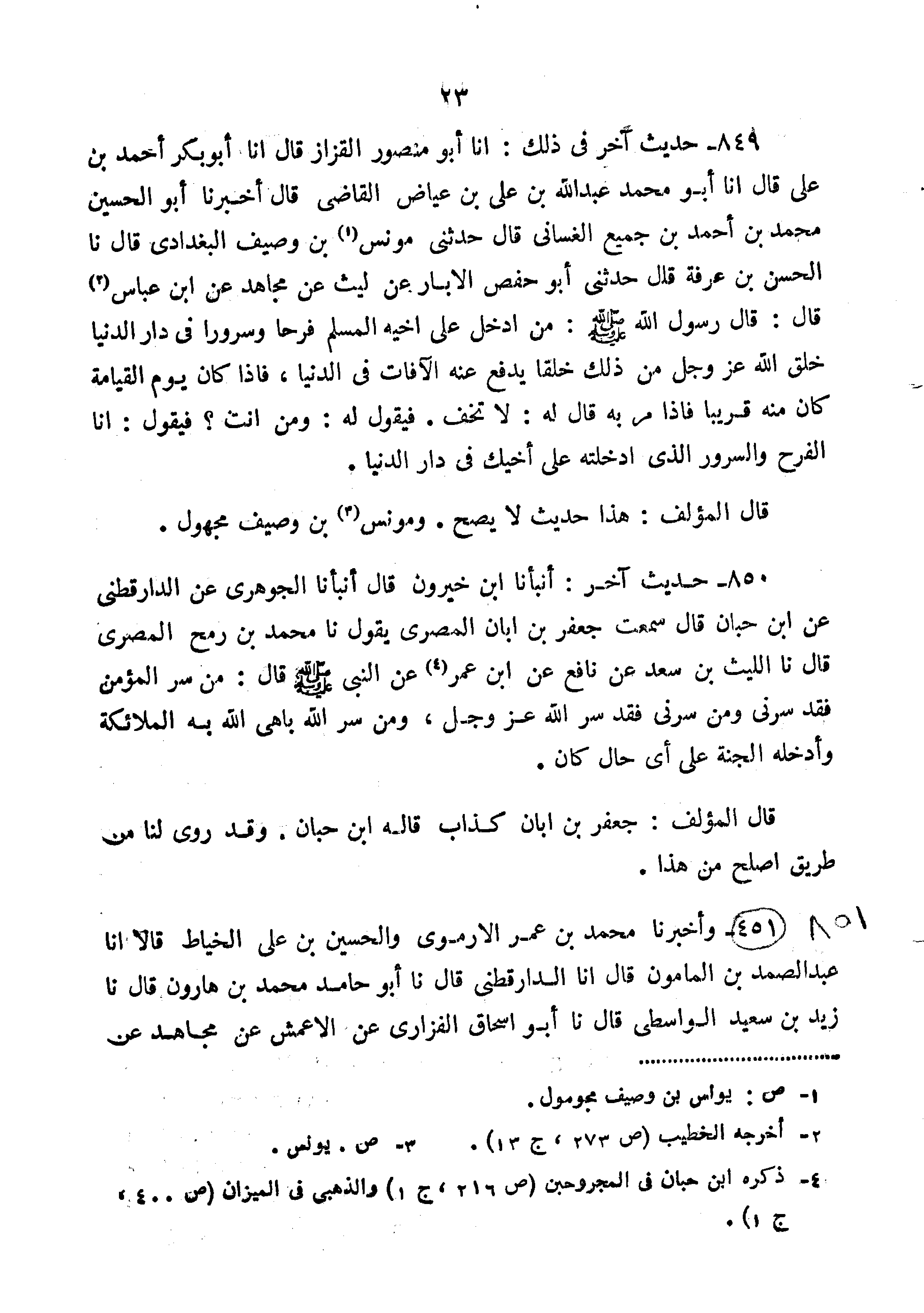 850-حَدِيثٌ آخَرُ أَنْبَأَنَا ابْنُ خَيْرُونَ قَالَ أَنْبَأَنَا الْجَوْهَرِيُّ عَنِ الدَّارَقُطْنِيِّ عَنِ ابْنِ حَبَّانَ قَالَ سَمِعْتُ جَعْفَرَ بْنَ أَبَانَ الْمِصْرِيَّ يَقُولُ نا مُحَمَّدُ بْنُ رُمْحٍ الْمَصْرِيُّ قَالَ نا اللَّيْثُ بْنُ سَعْدٍ عَنْ نَافِعٍ عَنِ ابْنِ عُمَرَ عَنِ النَّبِيِّ صَلَّى اللَّهُ عَلَيْهِ وَسَلَّمَ قَالَ " مَنْ سَرَّ الْمُؤْمِنَ فَقَدْ سَرَّنِي وَمَنْ سَرَّنِي فَقَدْ سَرَّ اللَّهَ عَزَّ وَجَلَّ وَمَنْ سَرَّ اللَّهَ بَاهَى اللَّهُ بِهِ الْمَلائِكَةَ وَأَدْخَلَهُ الْجَنَّةَ عَلَى أَيِّ حَالٍ كَانَ".