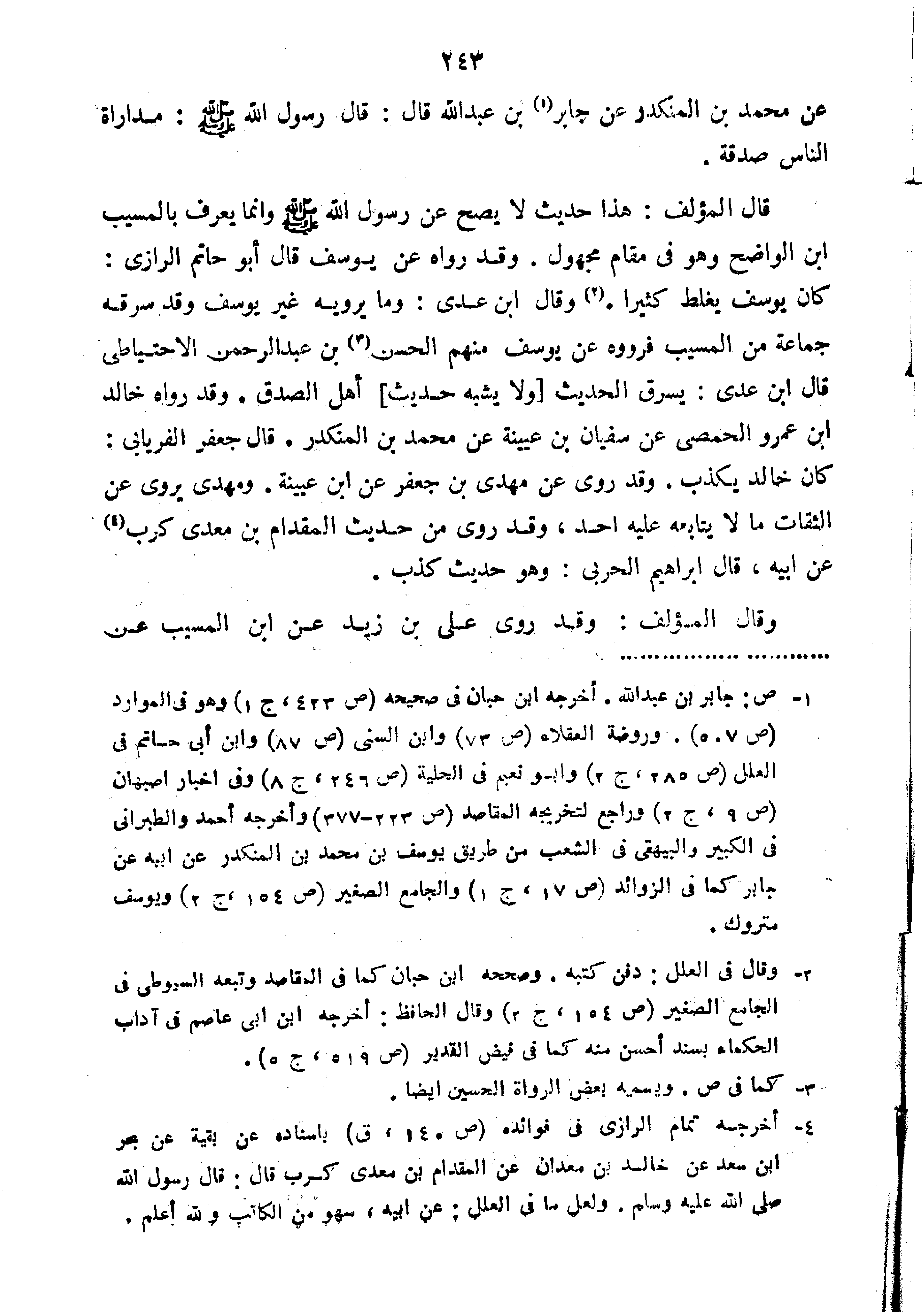عَنْ مُحَمَّدِ بْنِ الْمُنْكَدِرِ عَنْ جَابِرِ بْنِ عَبْدِ اللَّهِ قَالَ: قَالَ رَسُولُ اللَّهِ صَلَّى اللَّهُ عَلَيْهِ وَسَلَّمَ: "مُدَارَاةُ النَّاسِ صَدَقَةٌ".